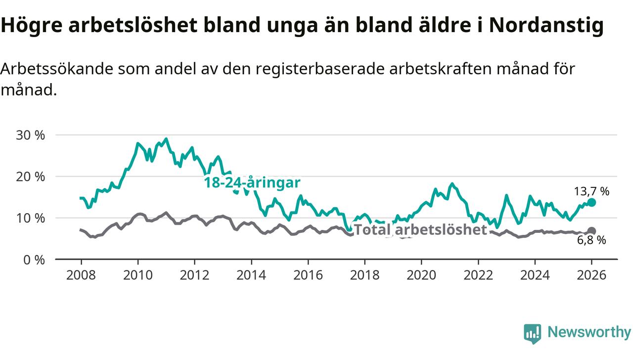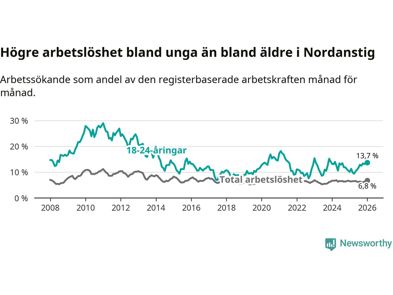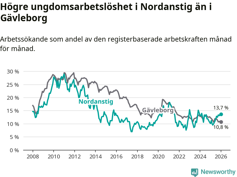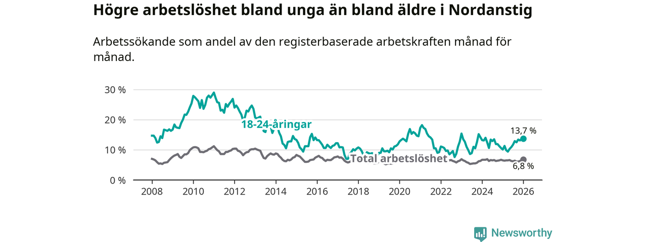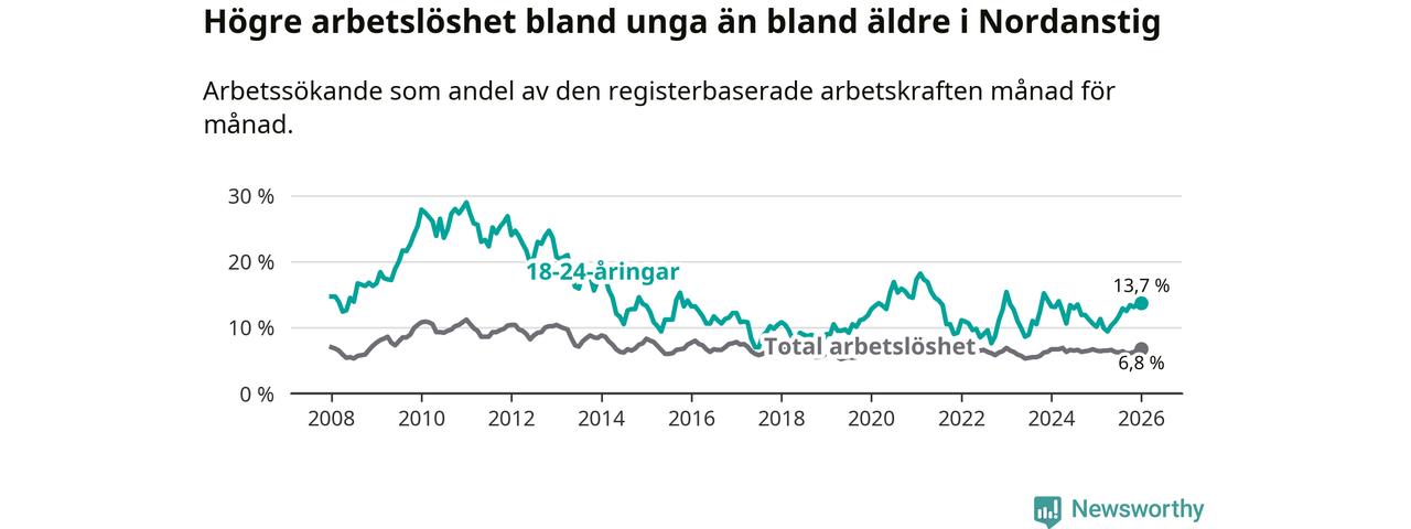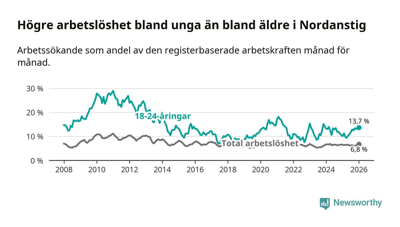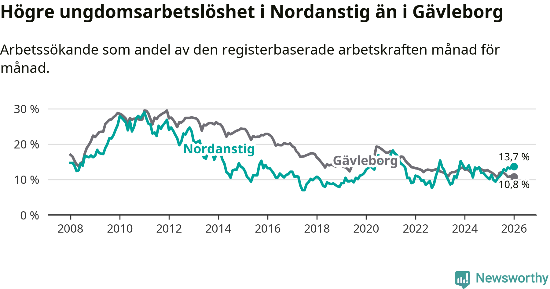 Medan Nordanstig har lägre total arbetslöshet än Gävleborg, ligger ungdomsarbetslösheten 2,9 procentenheter högre i Nordanstig.
