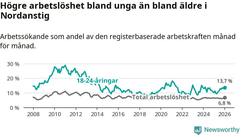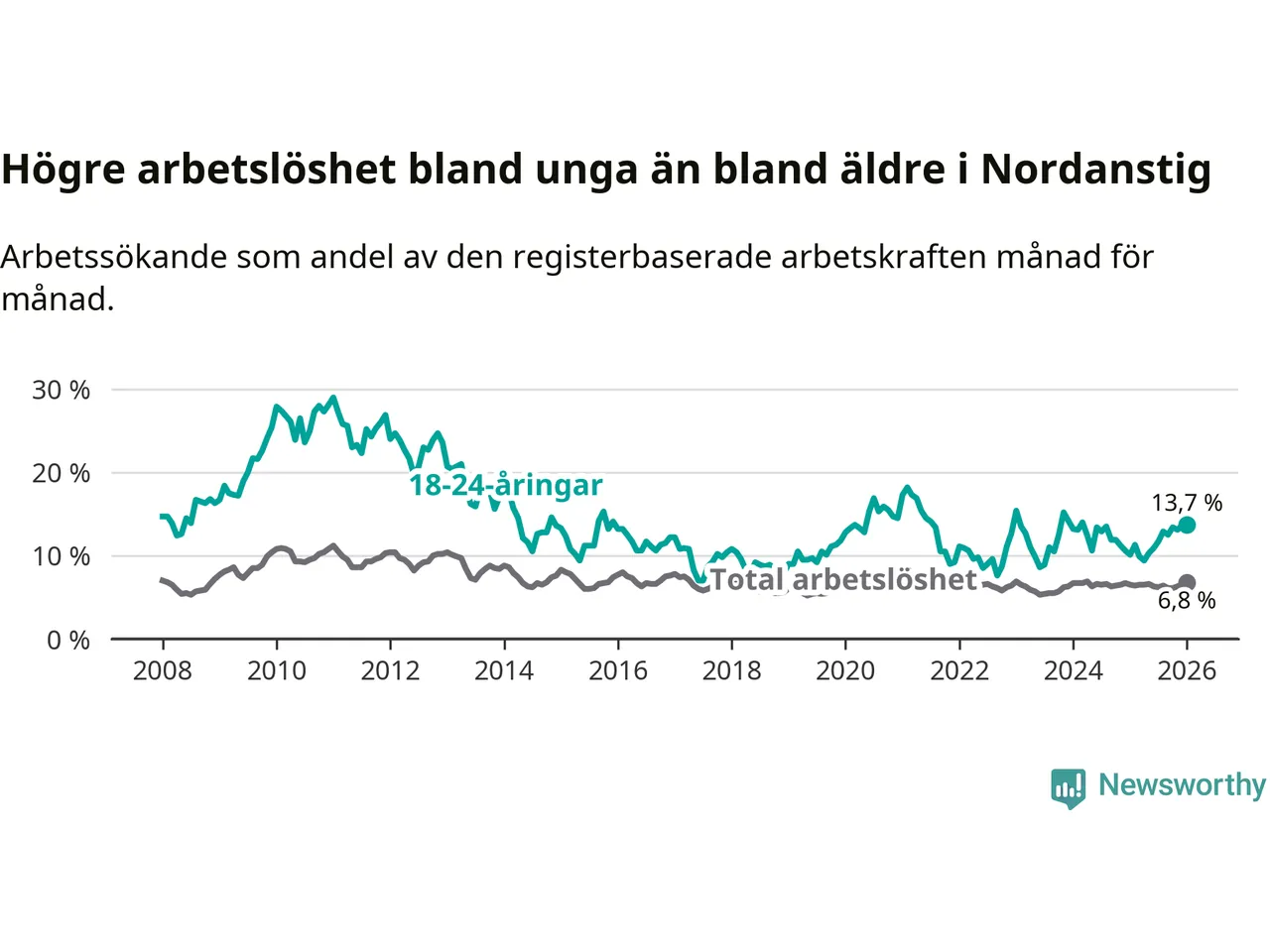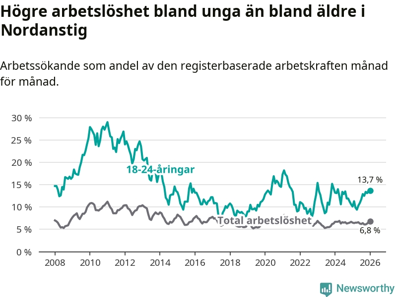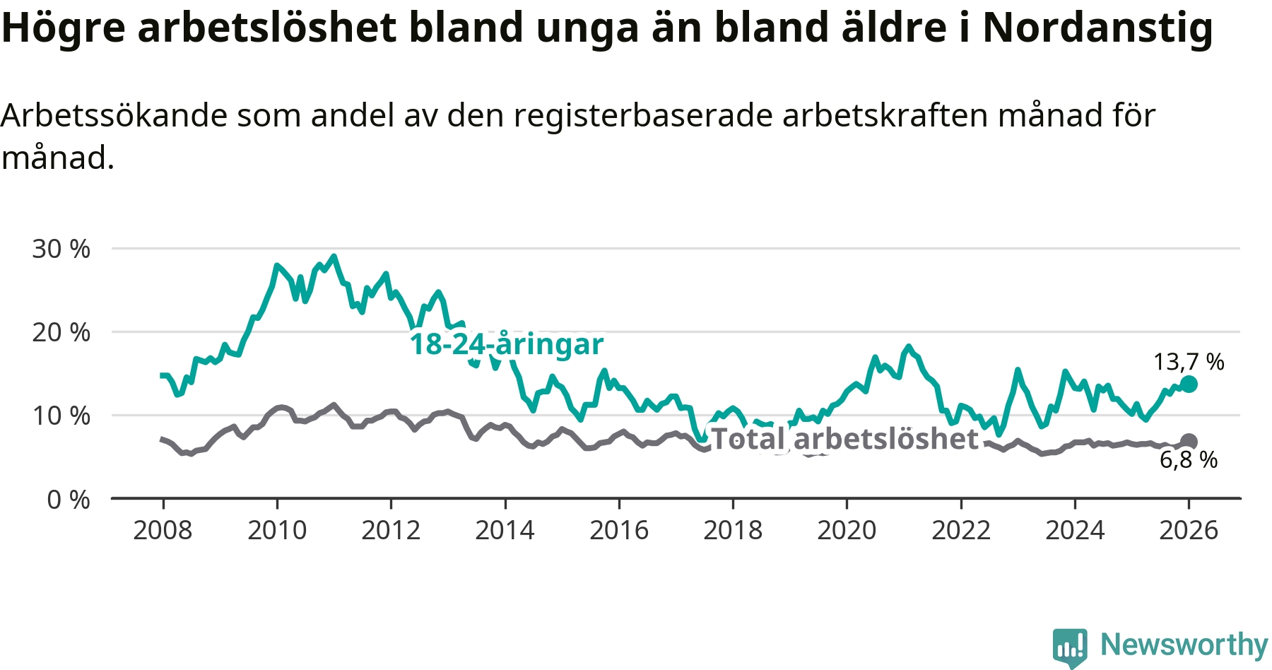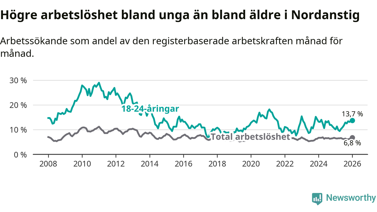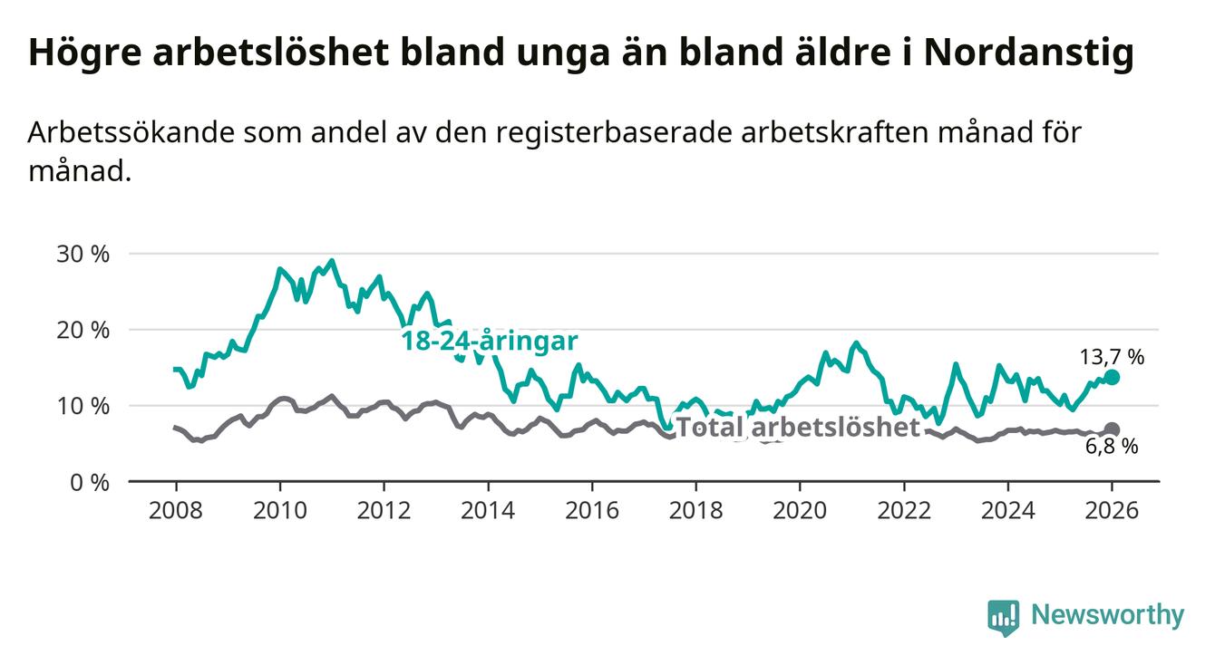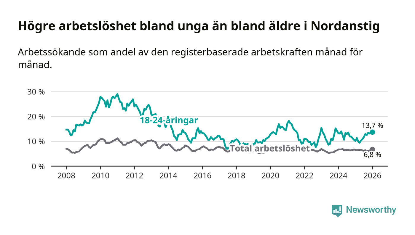 Medan Nordanstig har lägre total arbetslöshet än Gävleborg, ligger ungdomsarbetslösheten 2,9 procentenheter högre i Nordanstig.
