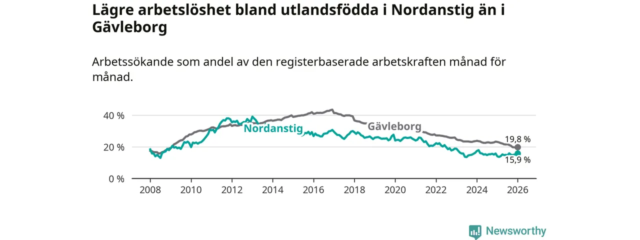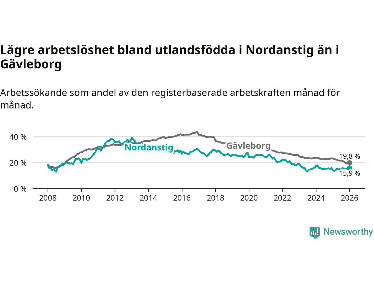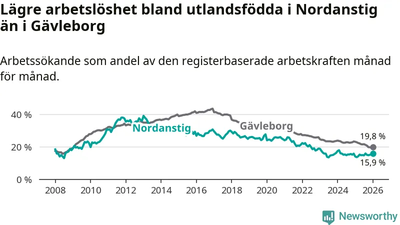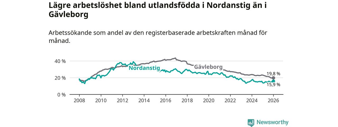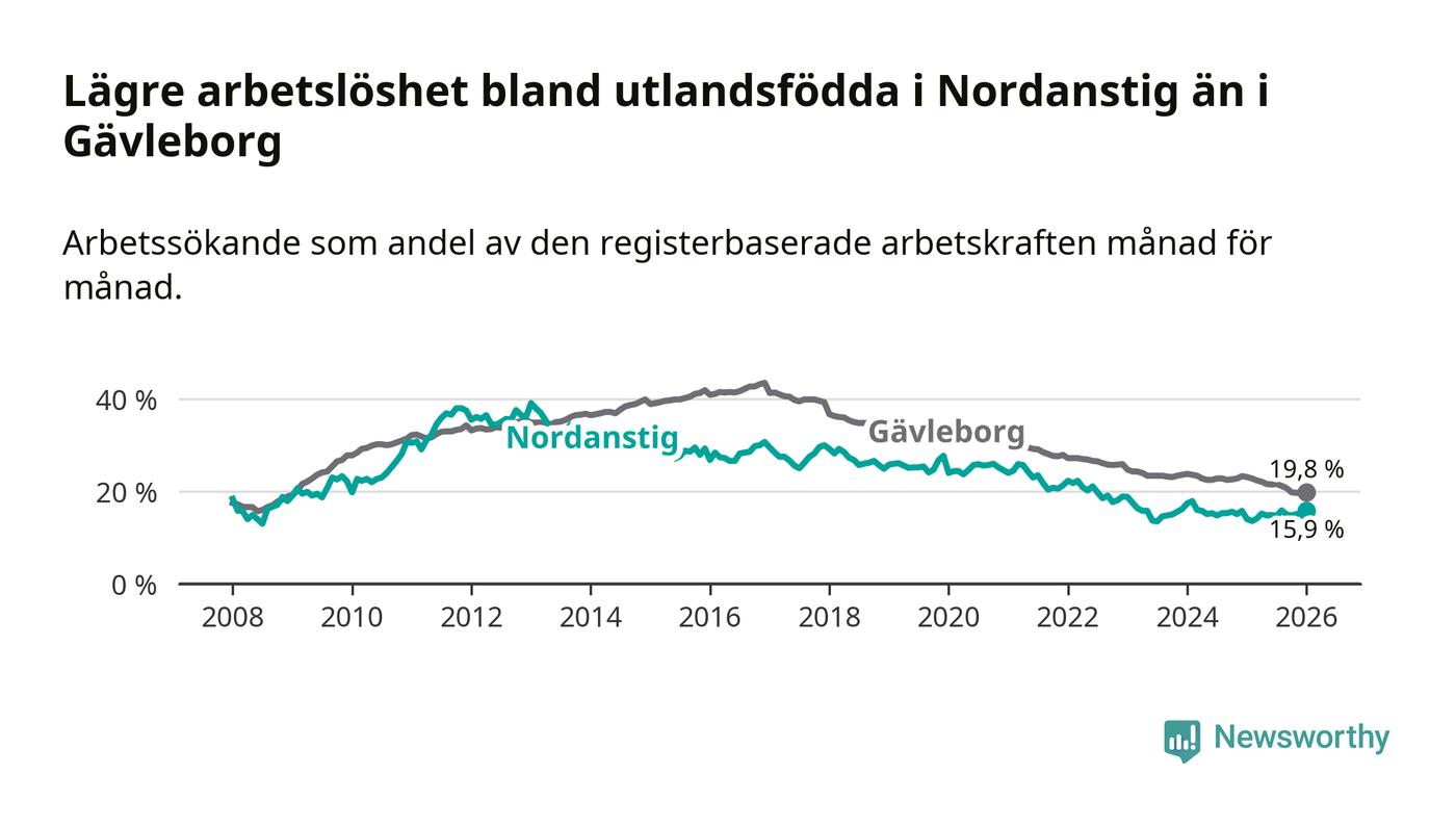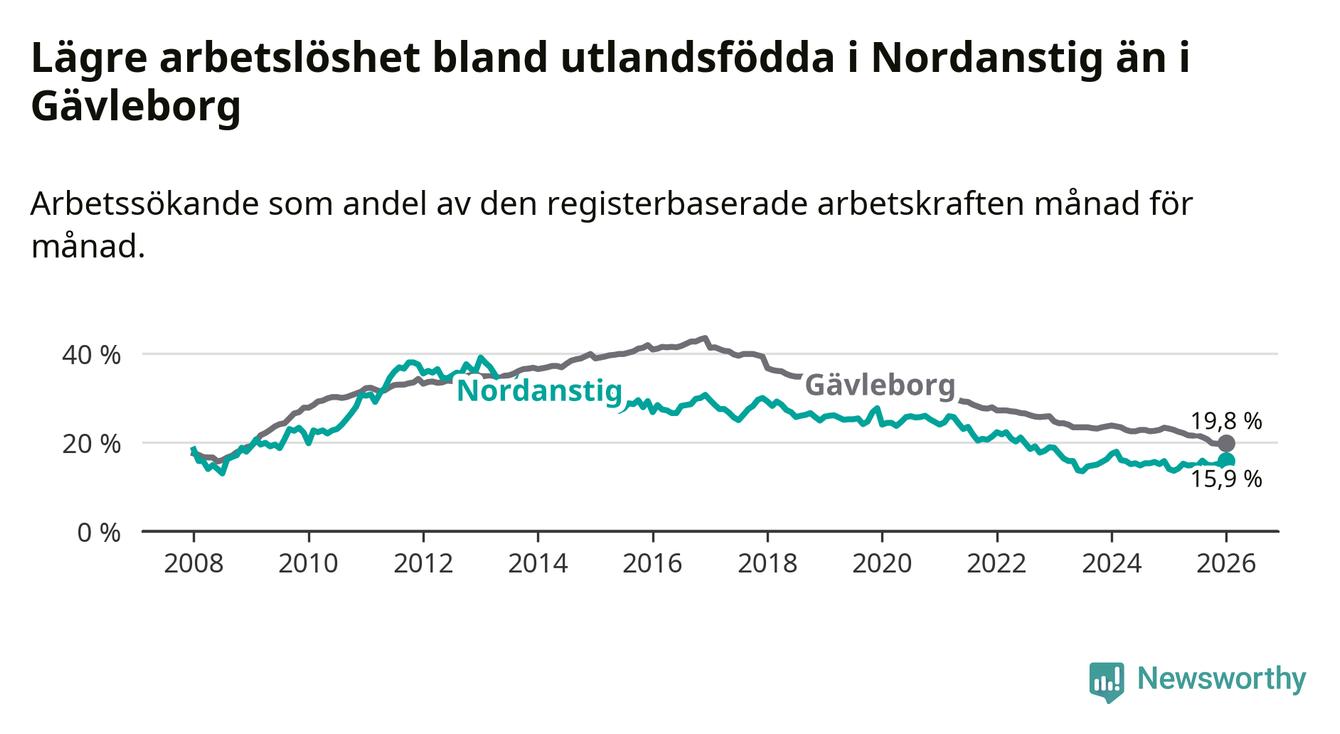 Medan arbetslösheten bland utlandsfödda alltså ökar i Nordanstig så minskar den i Gävleborg. Jämfört med januari förra året har andelen arbetslösa utlandsfödda i länet minskat med 3,3 procentenheter (till 19,8 procent). Trots den senaste uppgången har Nordanstig med andra ord fortfarande lägre arbetslöshet bland utlandsfödda än Gävleborg.