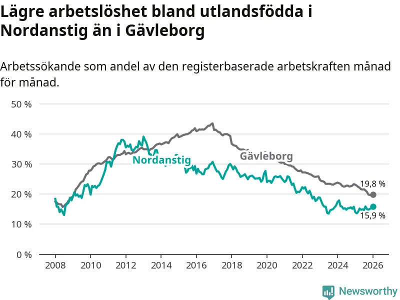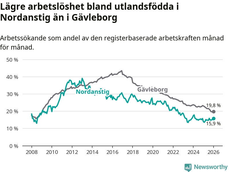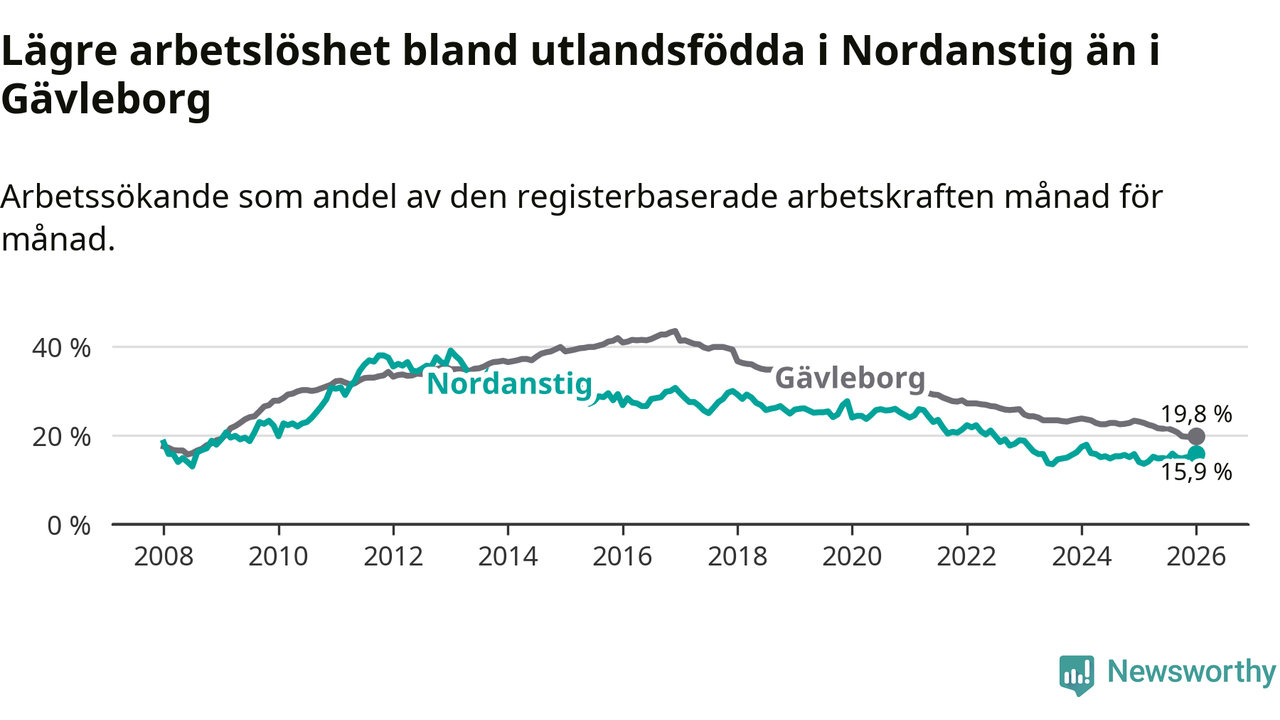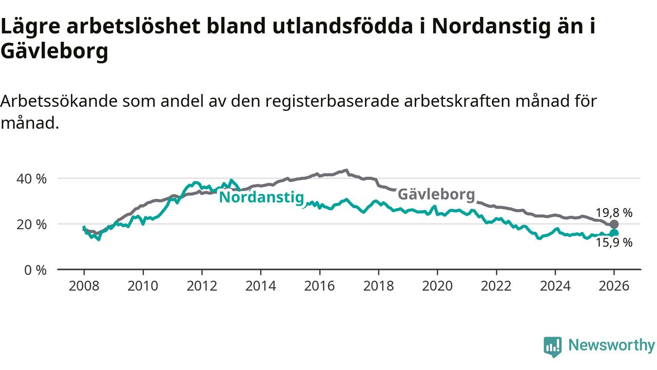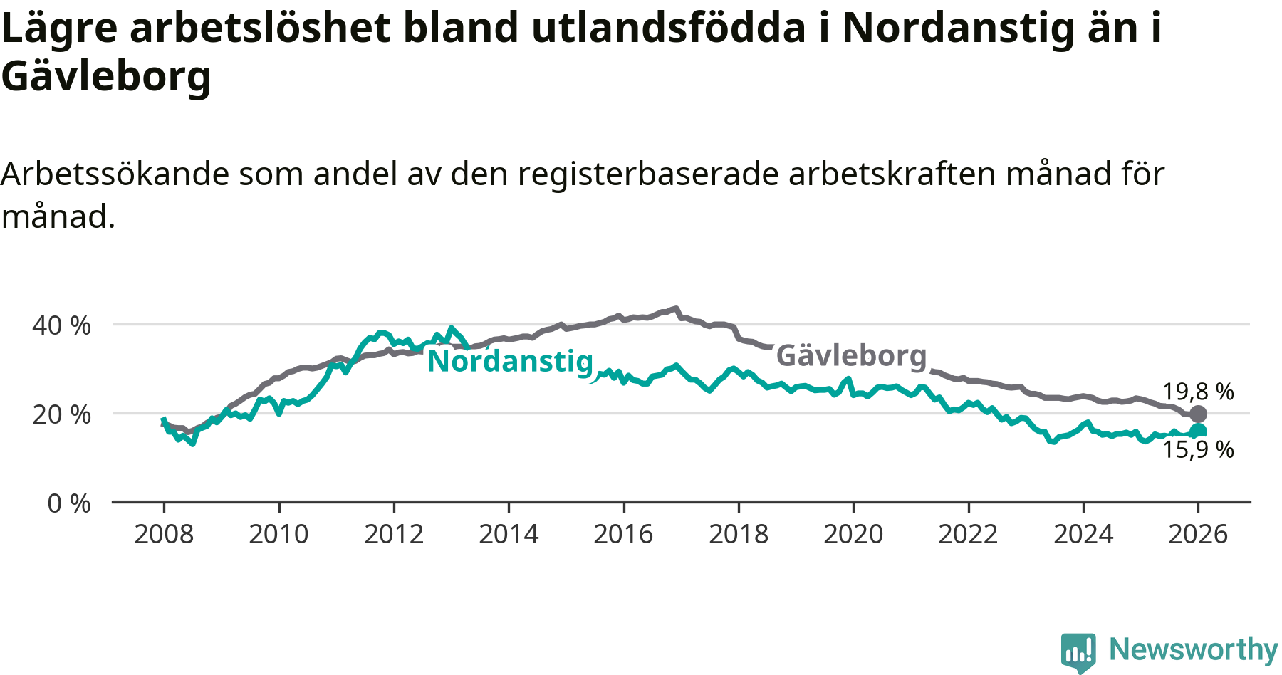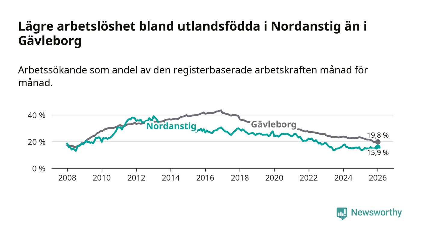 Medan arbetslösheten bland utlandsfödda alltså ökar i Nordanstig så minskar den i Gävleborg. Jämfört med januari förra året har andelen arbetslösa utlandsfödda i länet minskat med 3,3 procentenheter (till 19,8 procent). Trots den senaste uppgången har Nordanstig med andra ord fortfarande lägre arbetslöshet bland utlandsfödda än Gävleborg.