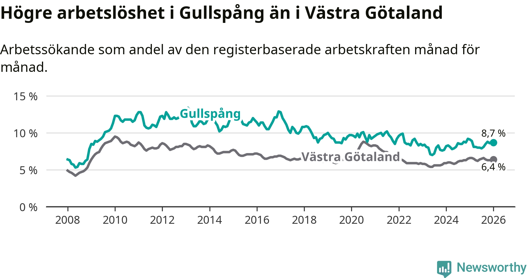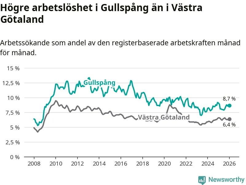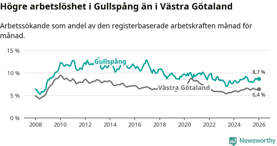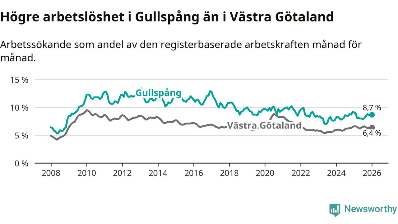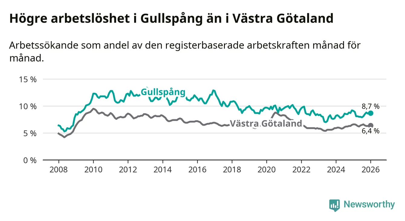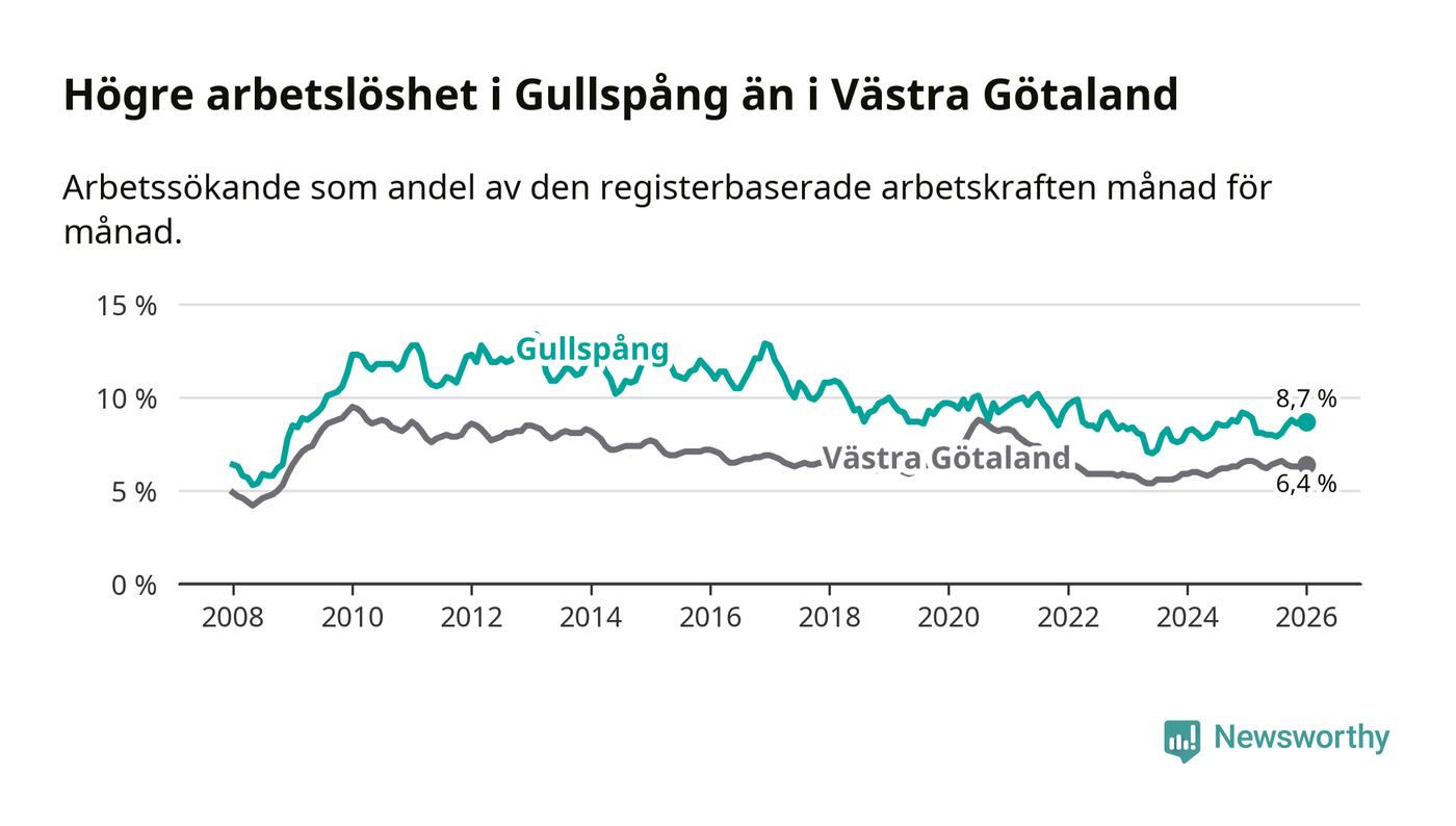 Under januari månad rapporterade Gullspångs kommun en total arbetslöshet på 8,7 procent. Det är en minskning jämfört med samma tidpunkt i fjol (−0,4 procentenheter). Även i Västra Götalands län sjunker arbetslösheten .