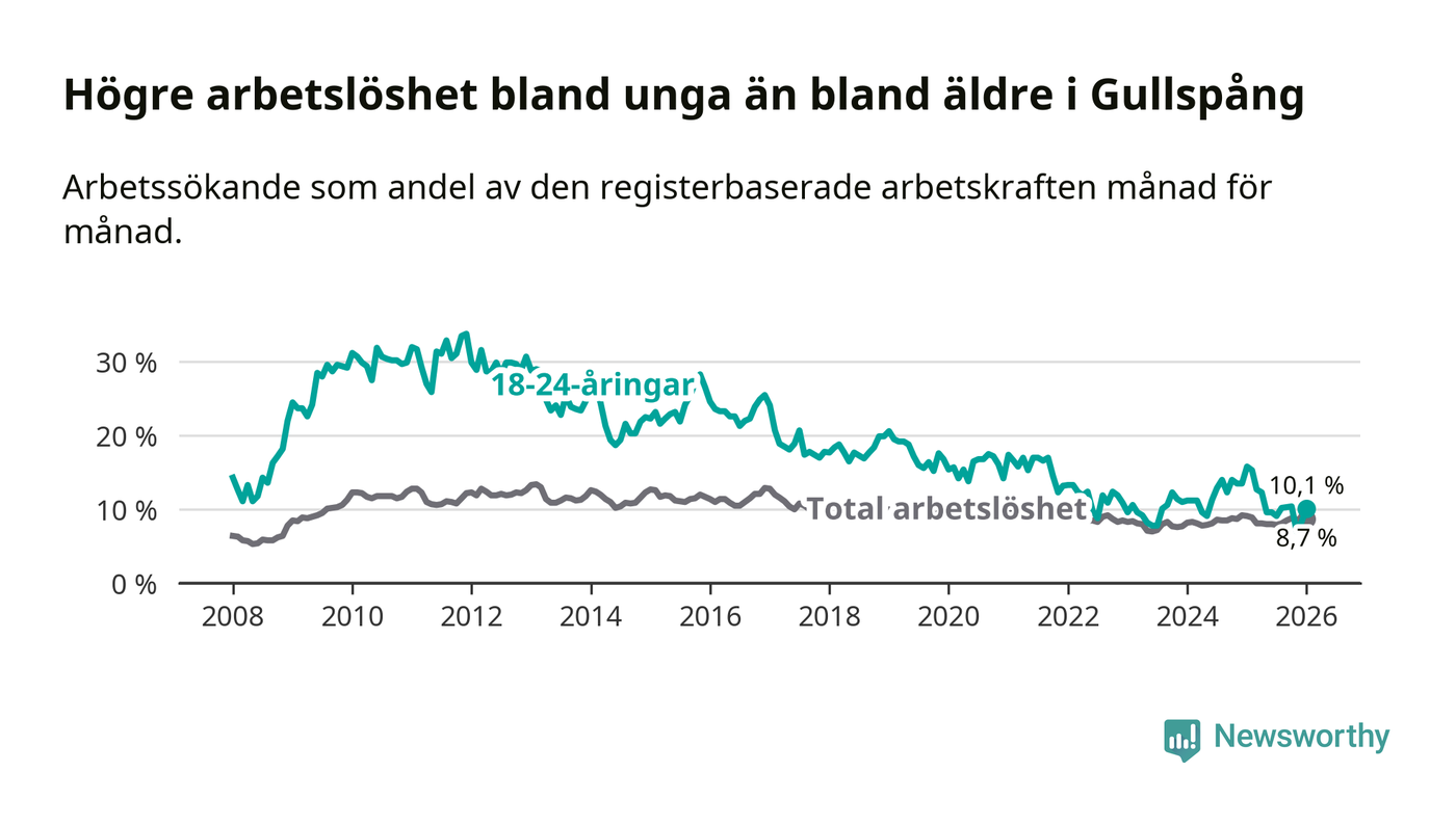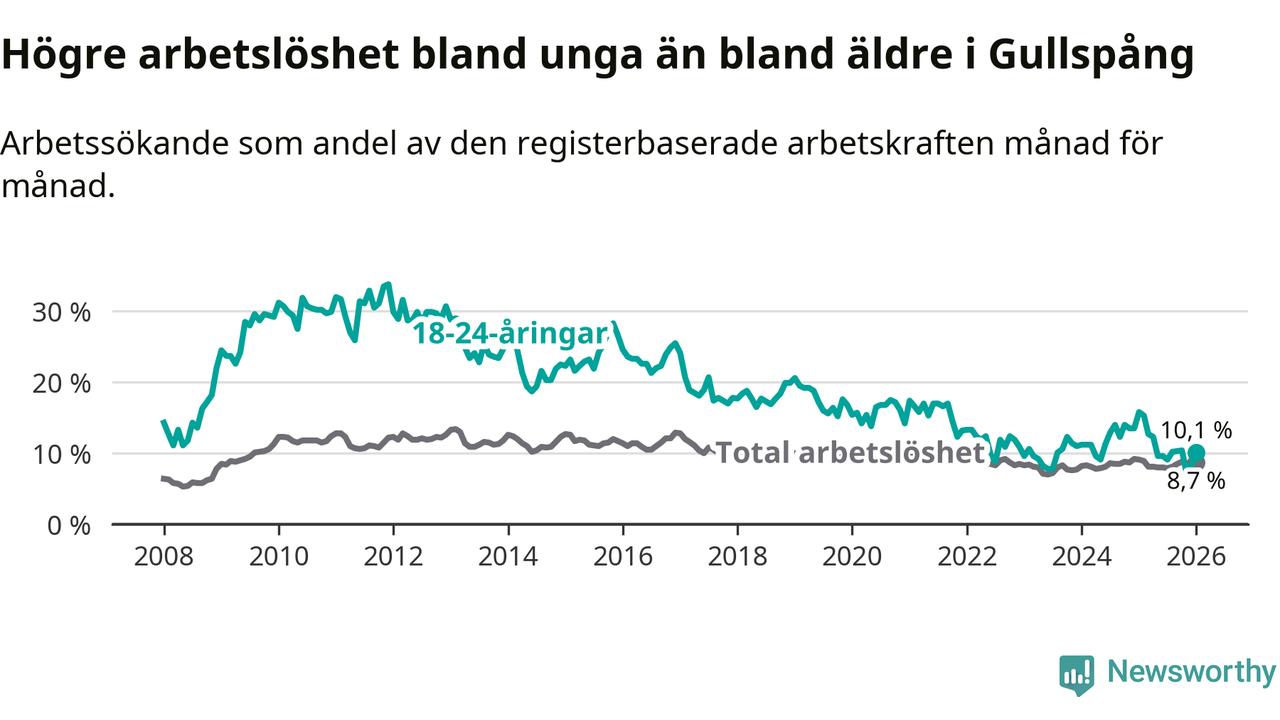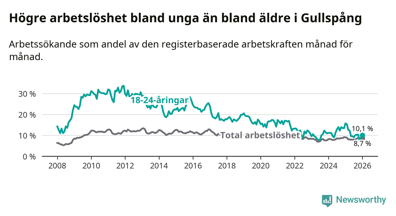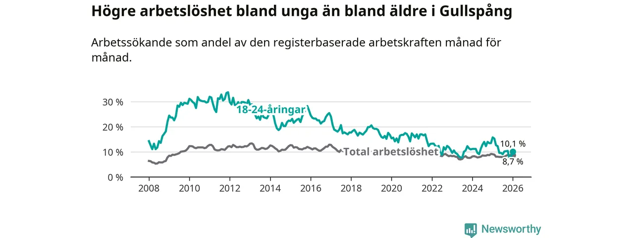 I och med den senaste månadens nedgång har de ungas arbetslöshet i Gullspång sjunkit åtta månader i följd (ner från 9,6 procent i maj 2025 till 10,1 procent nu).