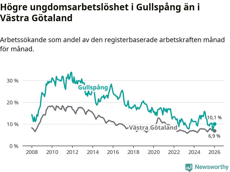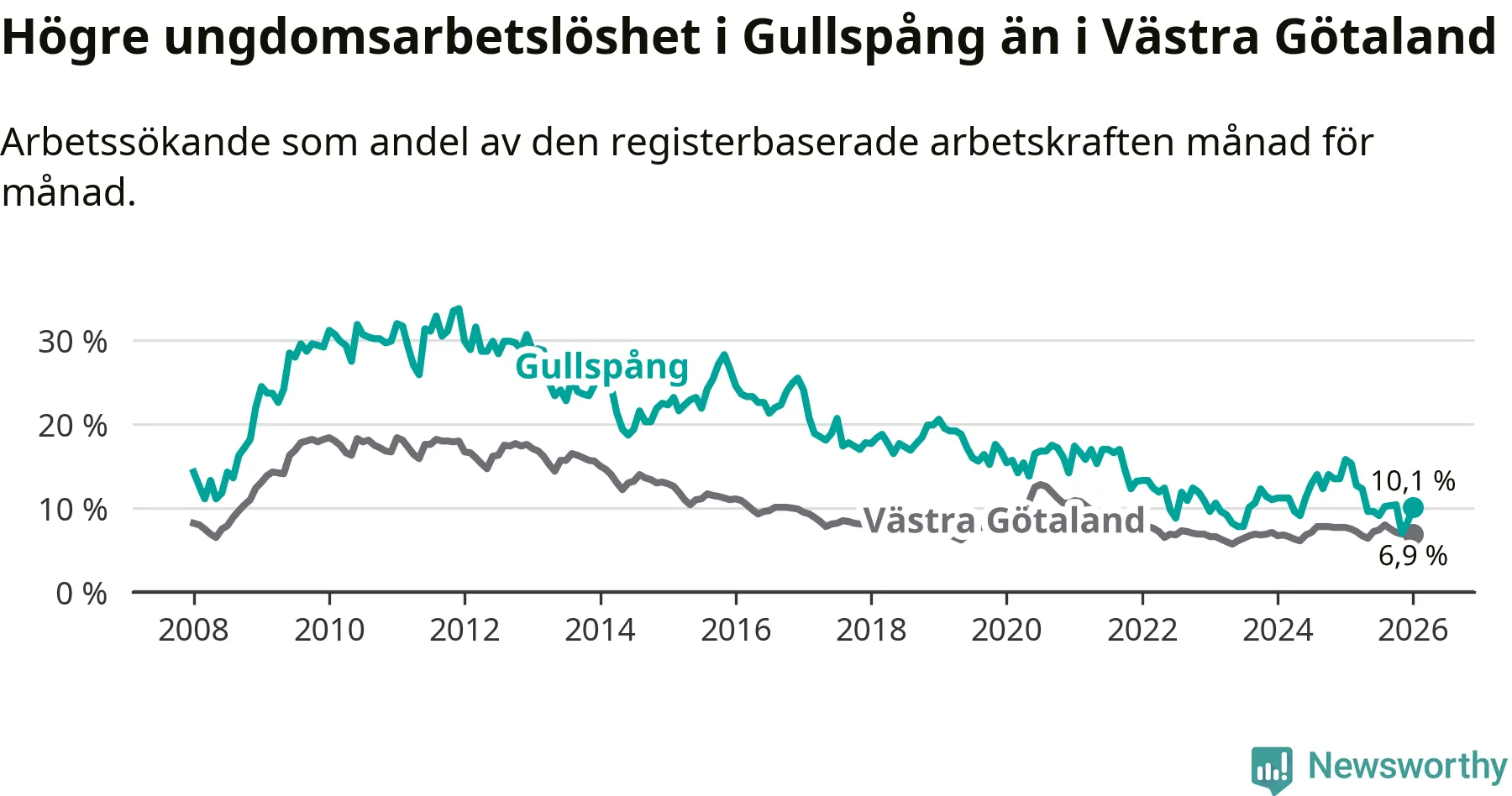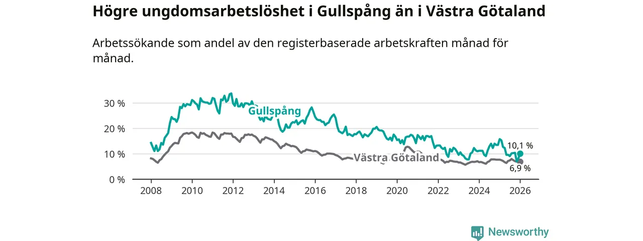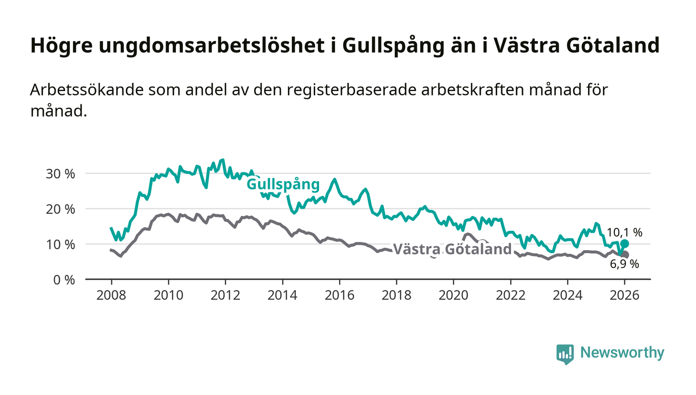 Precis som den totala arbetslösheten ligger ungdomsarbetslösheten i Gullspång högre än i Västra Götaland som helhet. Skillnaden mellan kommunen och länet är 3,2 procentenheter.