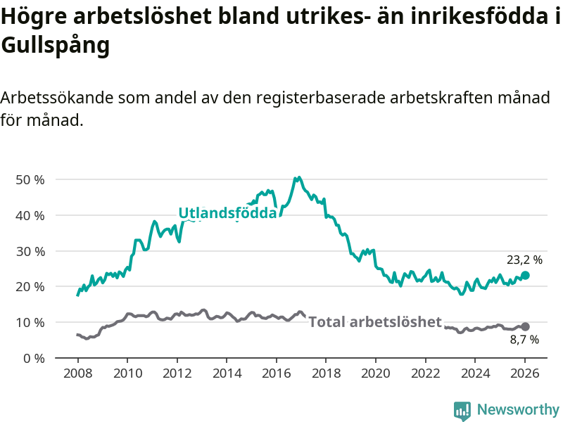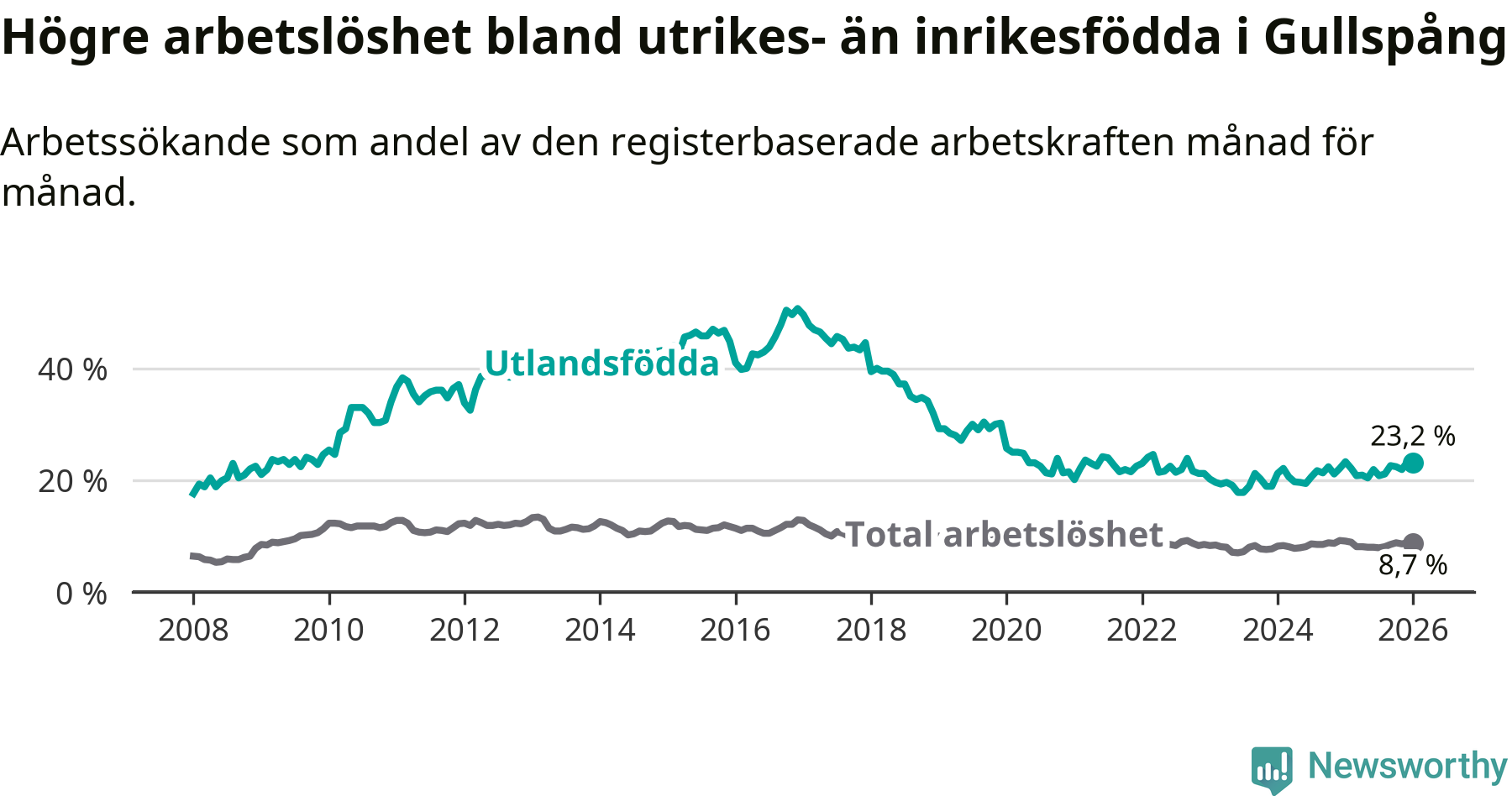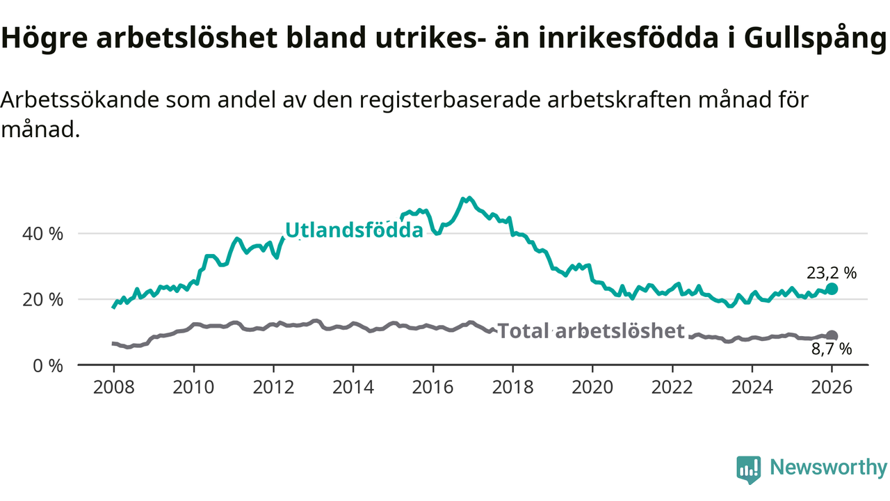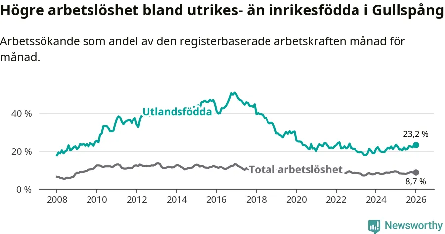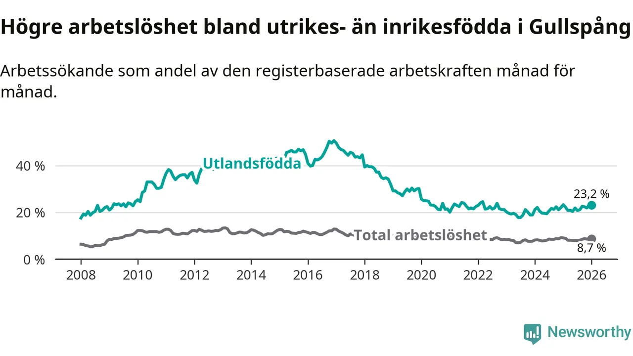 Arbetslösheten bland utlandsfödda var 23,2 procent i Gullspång under januari månad, motsvarande 87 av 375 personer. Det är 0,1 procentenheter färre än vid samma tidpunkt i fjol (−1 om man räknar personer). Den senaste månadens nedgång innebär ett trendbrott. Under de två föregående månaderna hade arbetslösheten bland utlandsfödda varit högre än motsvarande tidpunkt året innan.