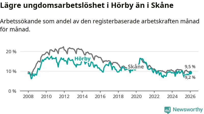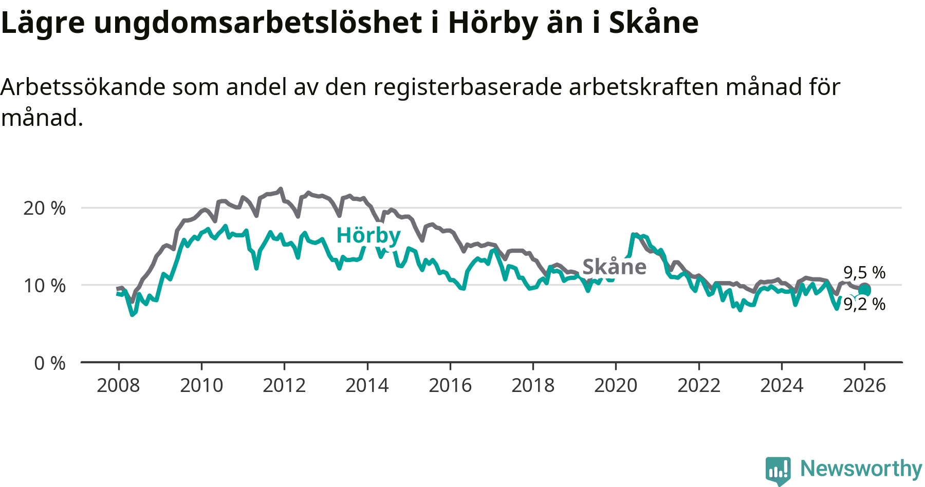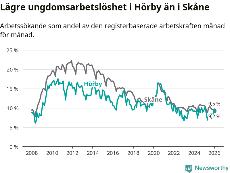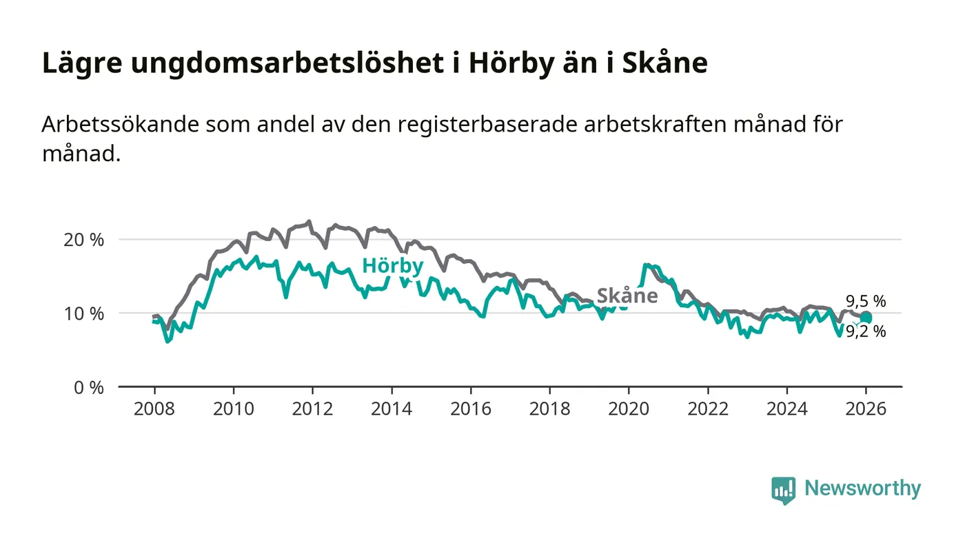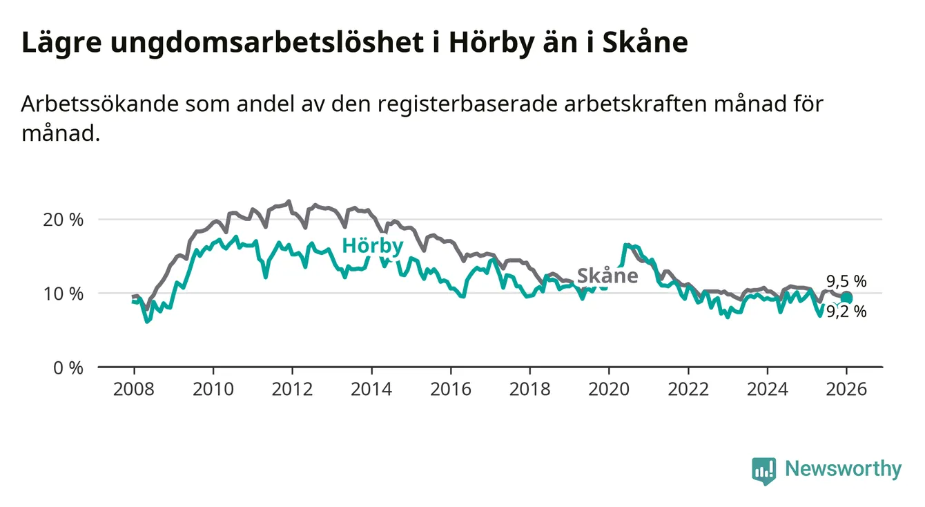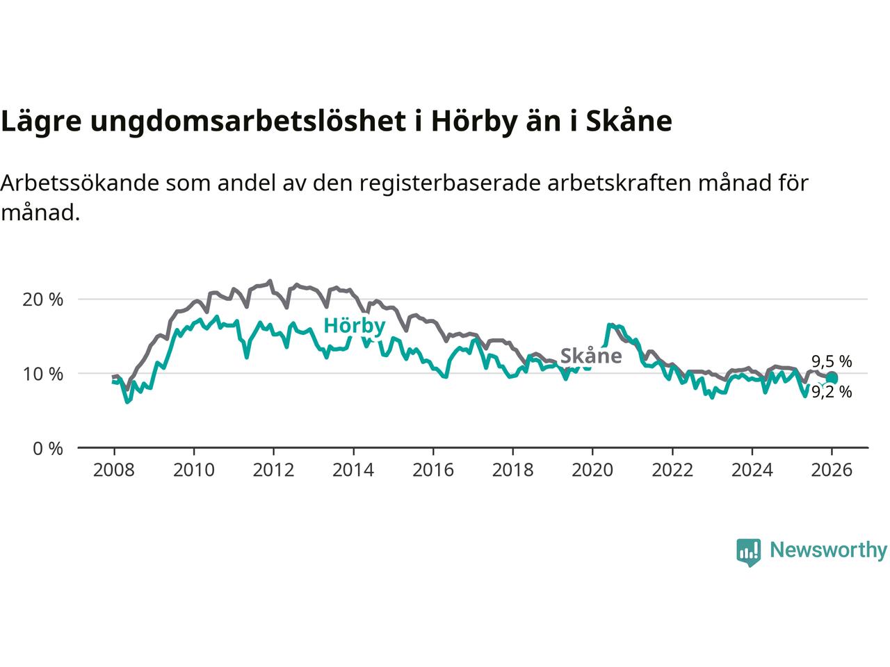I och med den senaste månadens nedgång har de ungas arbetslöshet i Hörby sjunkit tio månader i följd (ner från 9,2 procent i mars 2025 till 9,2 procent nu).