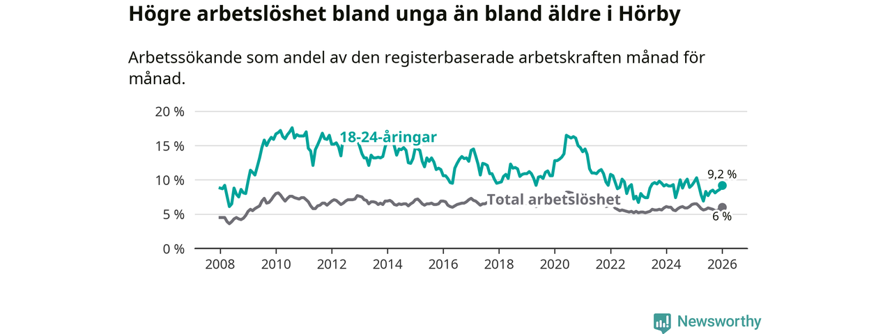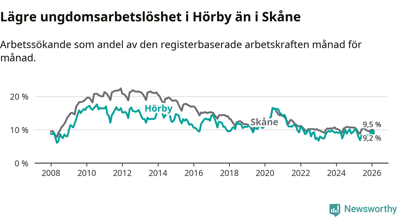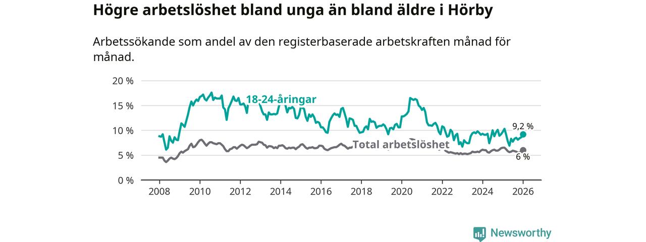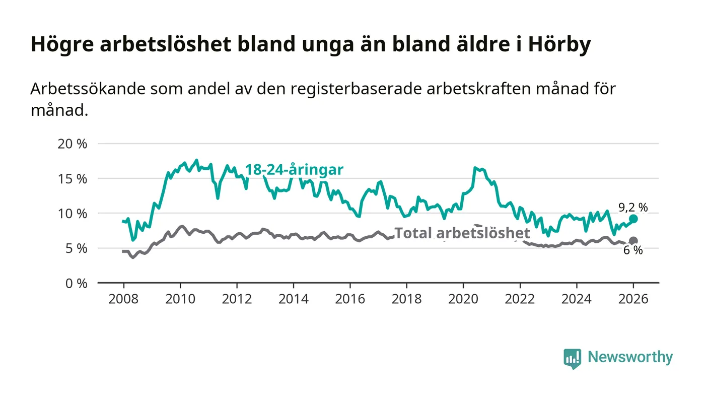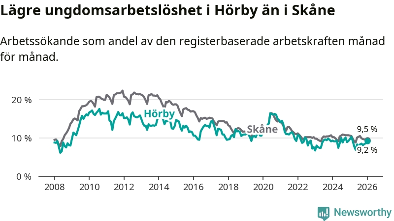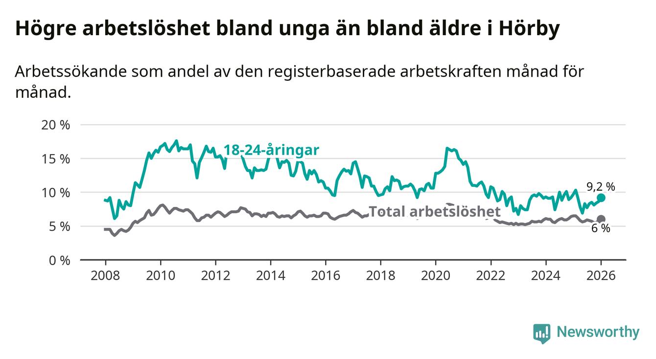 I och med den senaste månadens nedgång har de ungas arbetslöshet i Hörby sjunkit tio månader i följd (ner från 9,2 procent i mars 2025 till 9,2 procent nu).