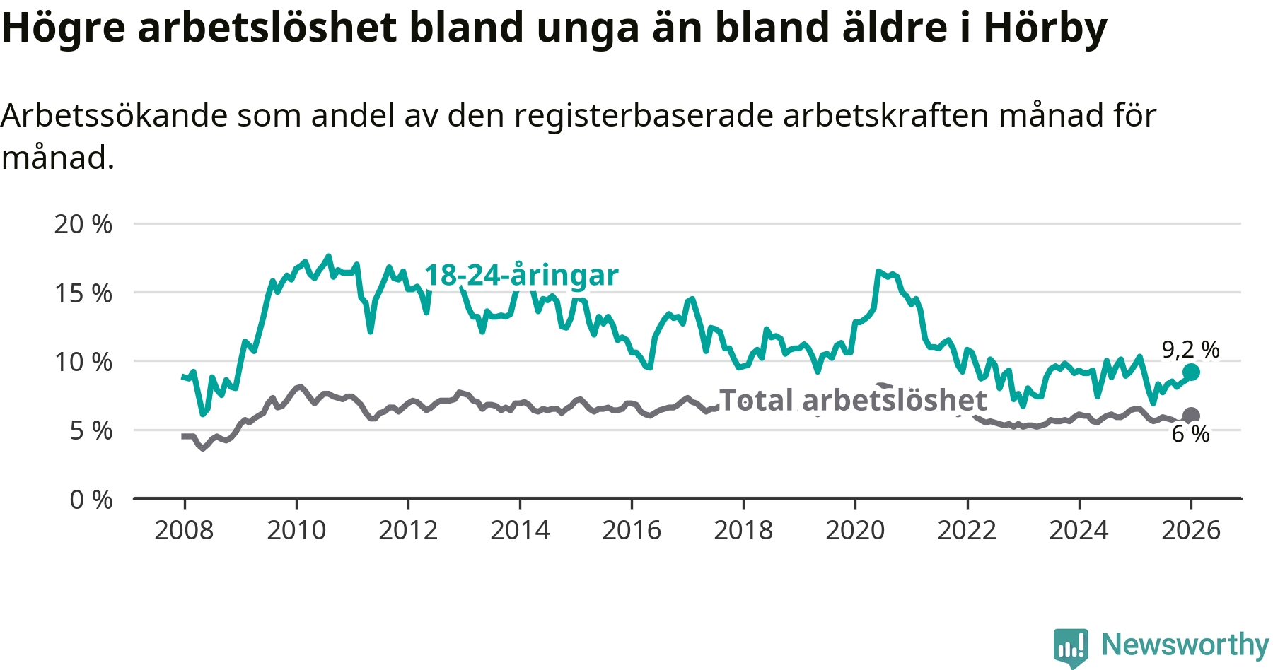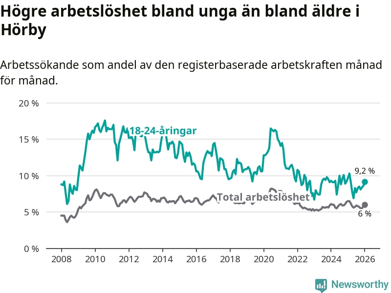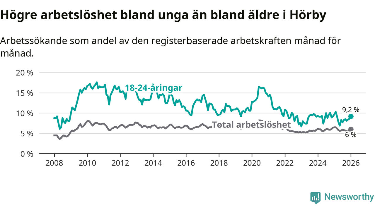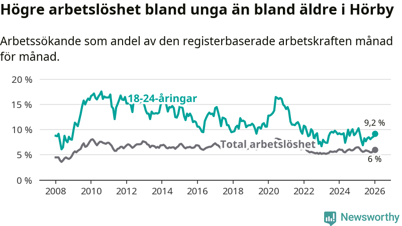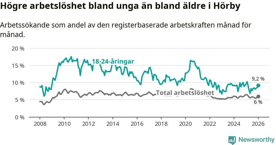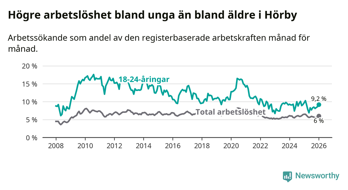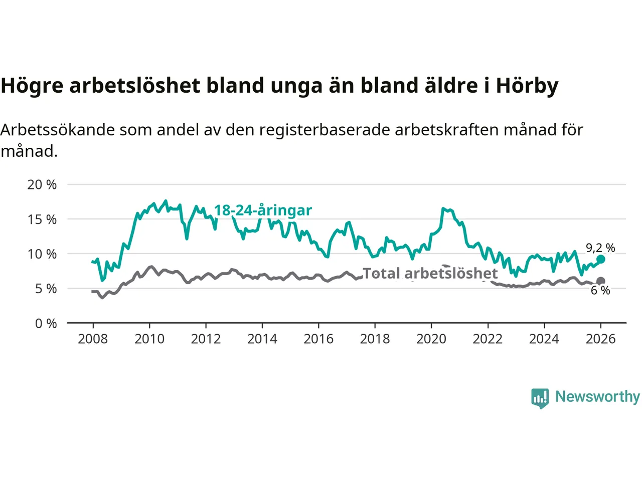 I och med den senaste månadens nedgång har de ungas arbetslöshet i Hörby sjunkit tio månader i följd (ner från 9,2 procent i mars 2025 till 9,2 procent nu).