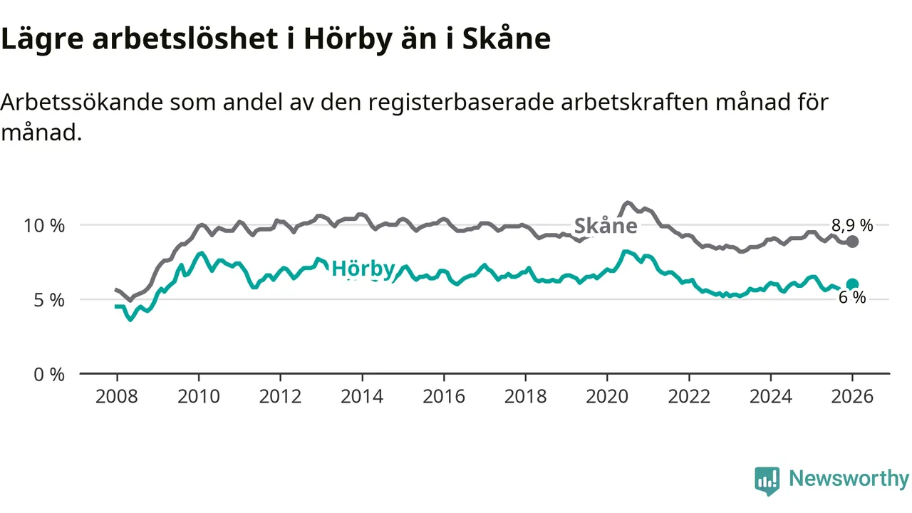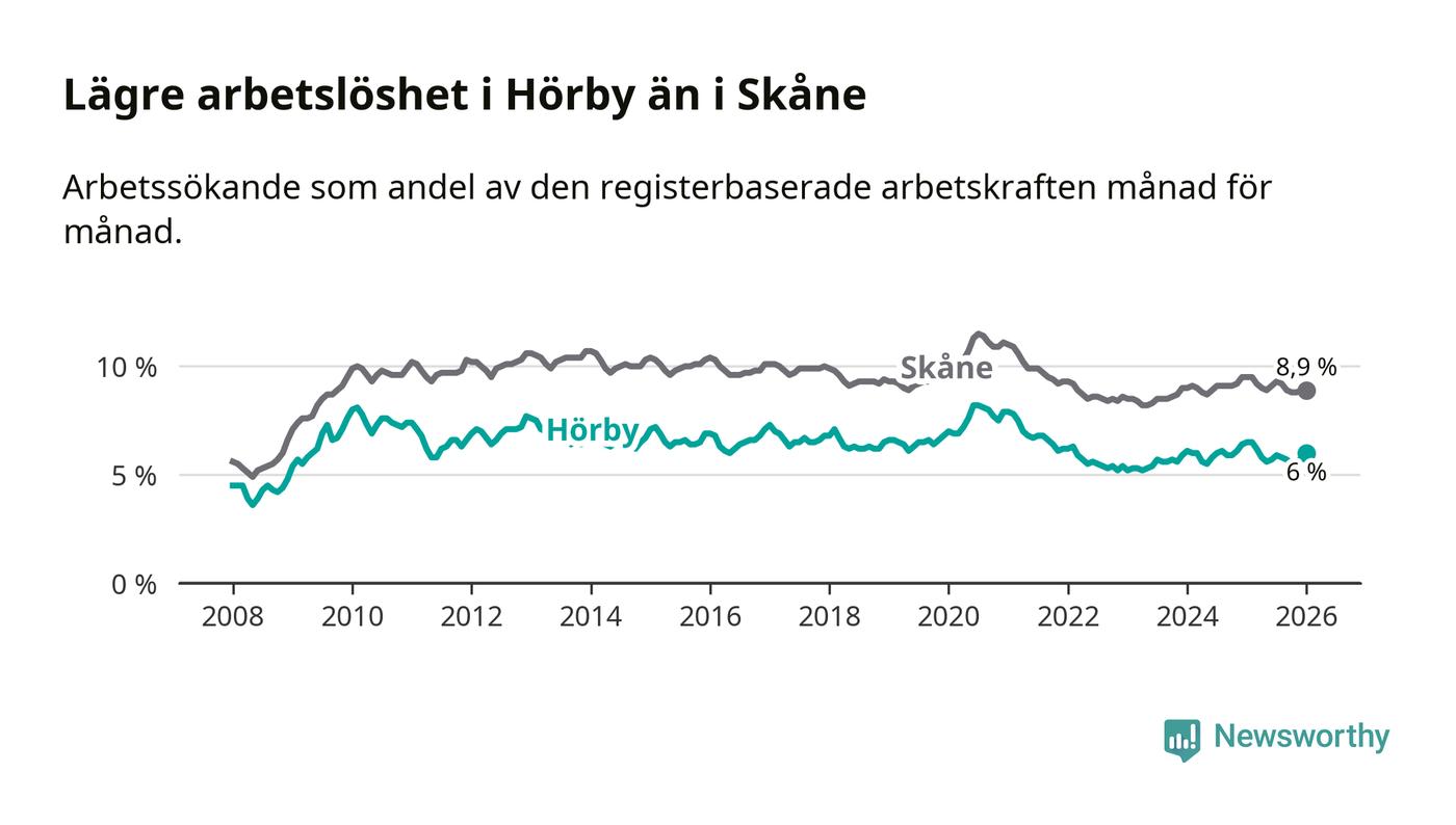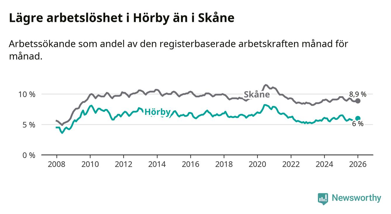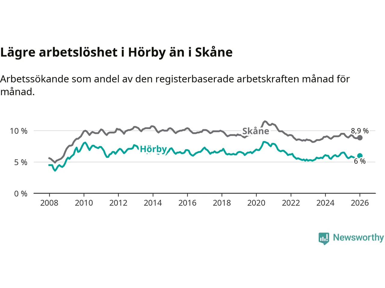 Hörby hade redan tidigare lägre arbetslöshet än snittet i hela Skåne län och nu växer klyftan (6,0 procent i kommunen, jämfört med 8,9 procent i hela länet). Lomma har den lägsta arbetslösheten i länet (3,9 procent), medan Perstorp har den högsta (13,4 procent). För att Hörby skulle komma ner i samma arbetslöshetsnivå som Lomma skulle 156 personer behöva sysselsättas.