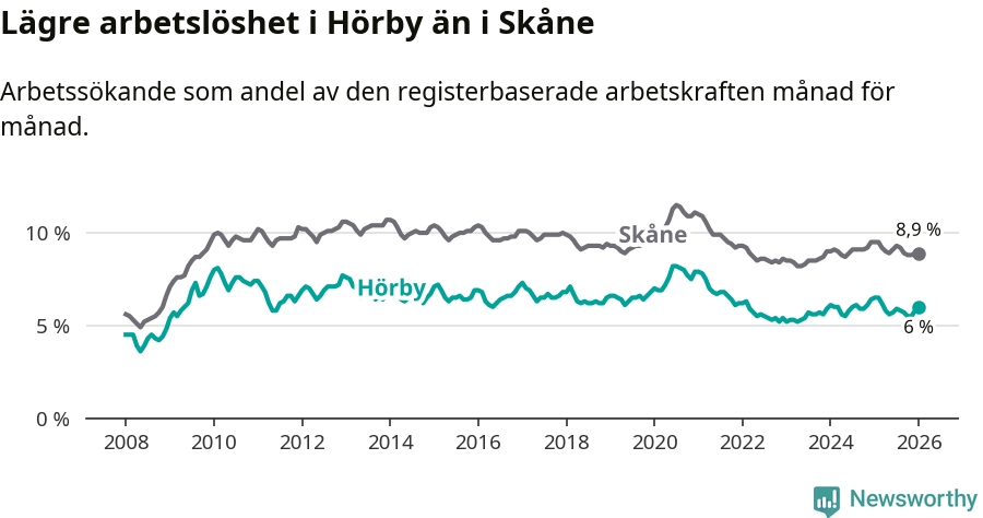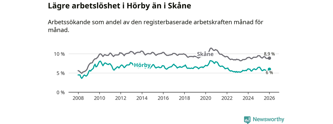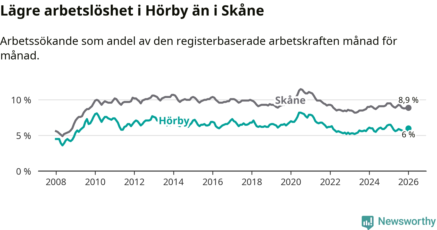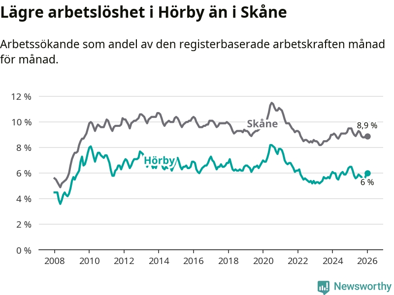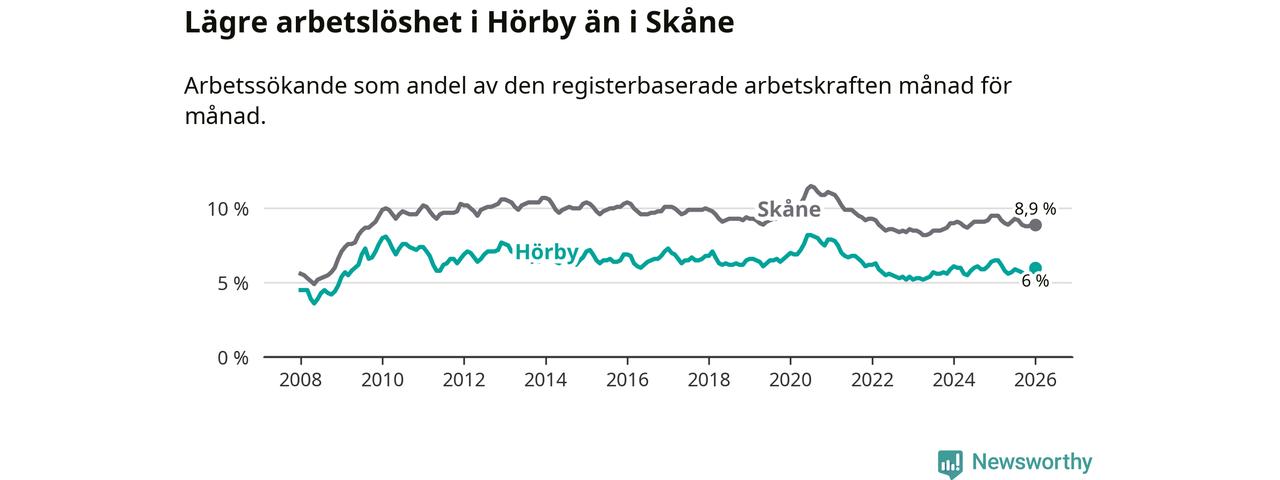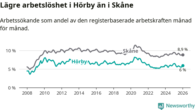 Hörby hade redan tidigare lägre arbetslöshet än snittet i hela Skåne län och nu växer klyftan (6,0 procent i kommunen, jämfört med 8,9 procent i hela länet). Lomma har den lägsta arbetslösheten i länet (3,9 procent), medan Perstorp har den högsta (13,4 procent). För att Hörby skulle komma ner i samma arbetslöshetsnivå som Lomma skulle 156 personer behöva sysselsättas.