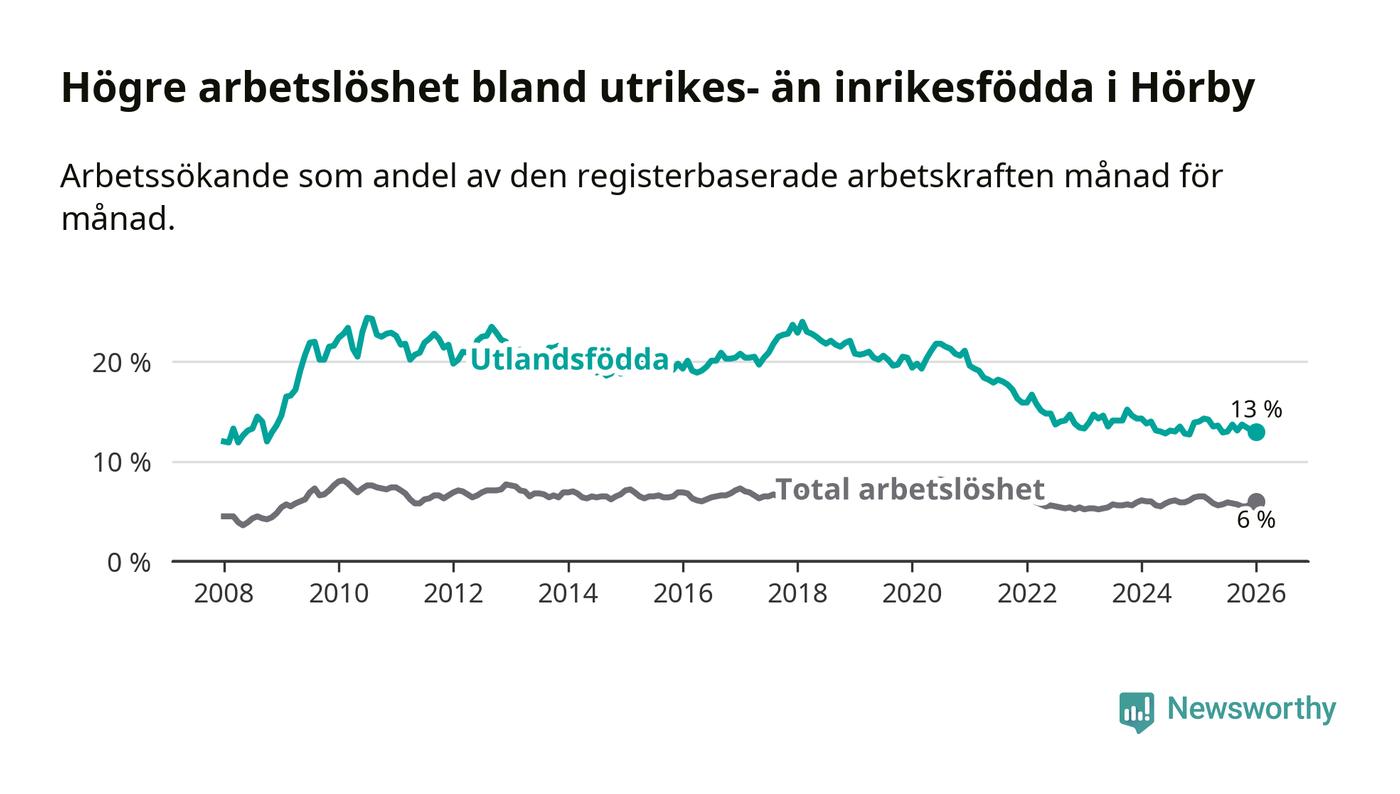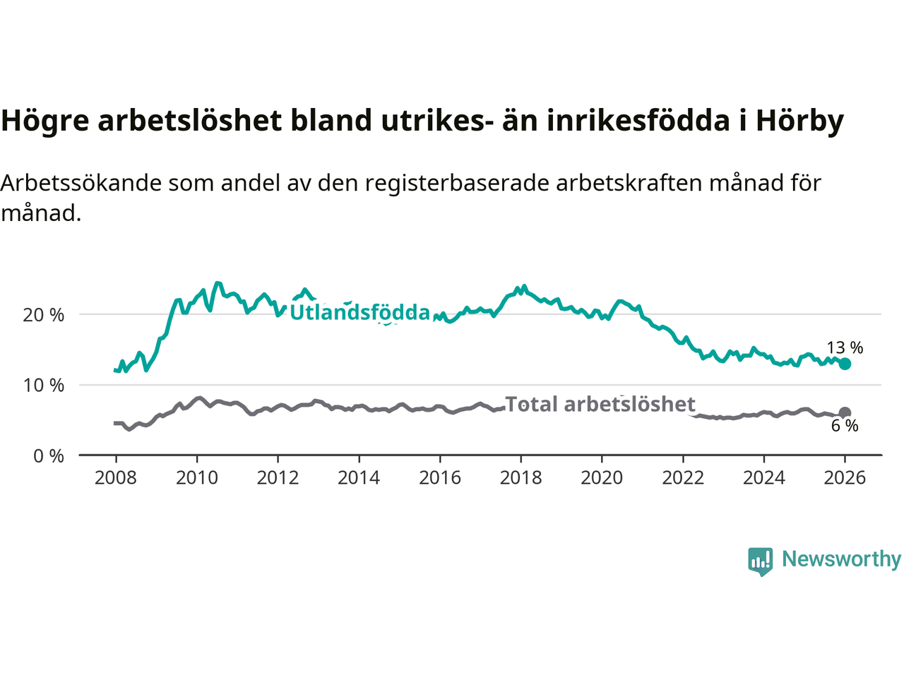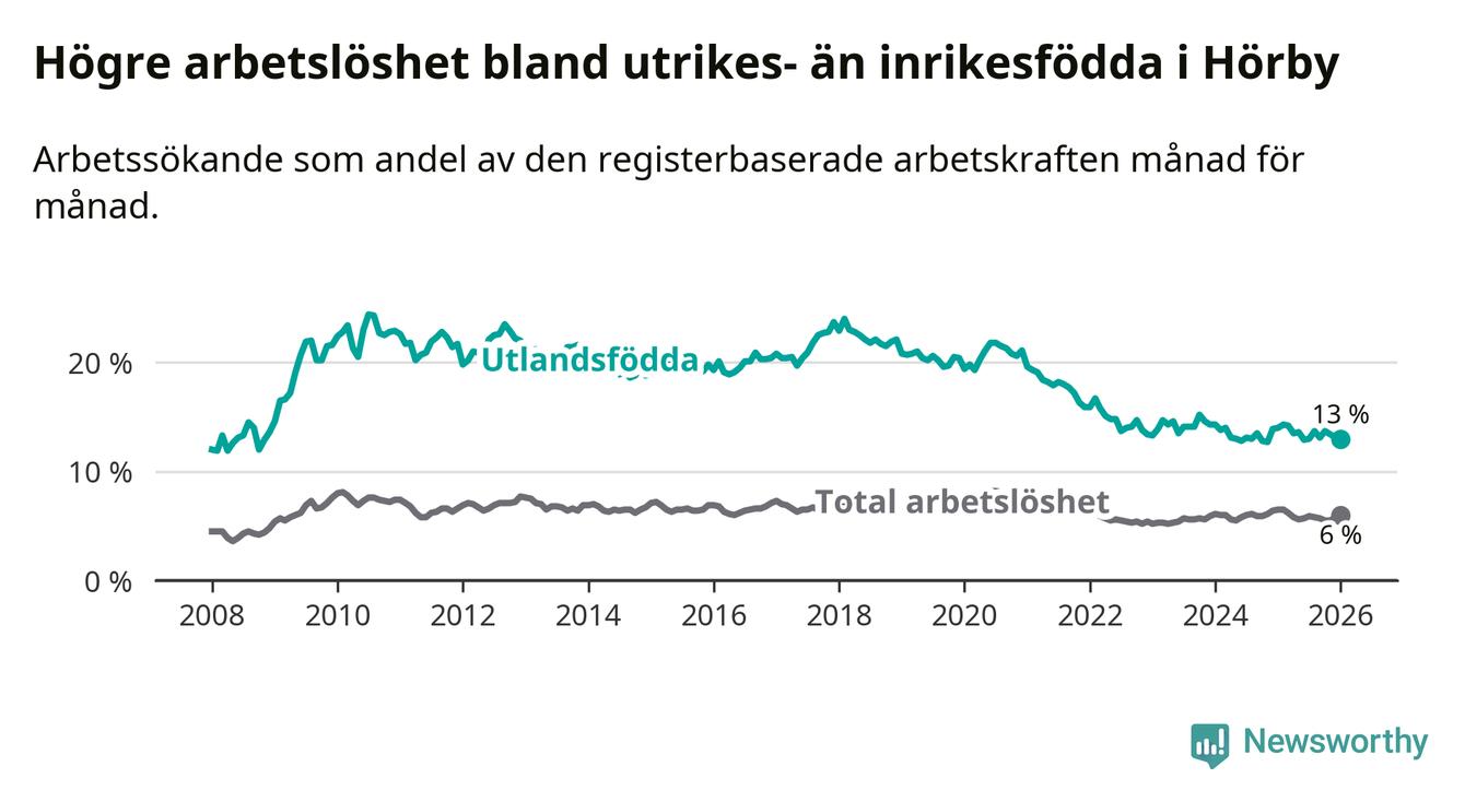 Arbetslösheten bland utlandsfödda var 13,0 procent i Hörby under januari månad, motsvarande 150 av 1 154 personer. Det är 1,0 procentenheter färre än vid samma tidpunkt i fjol (−11 om man räknar personer).