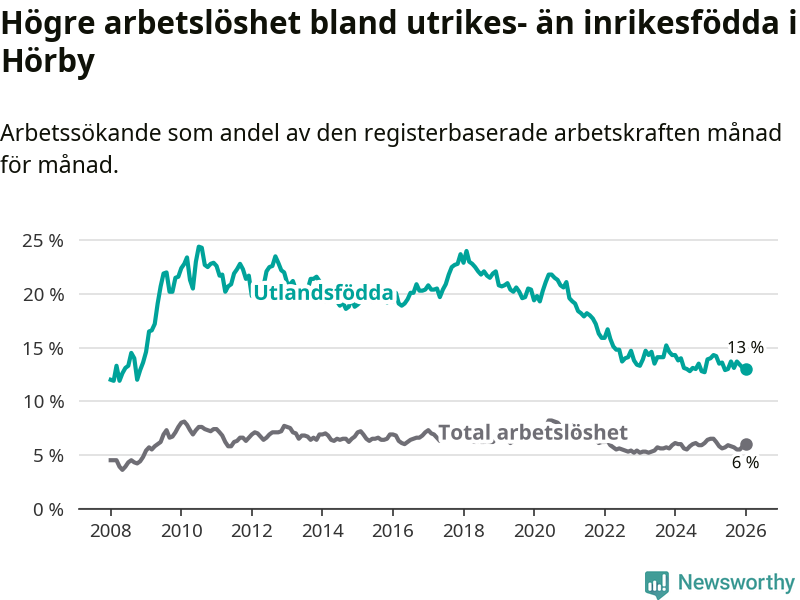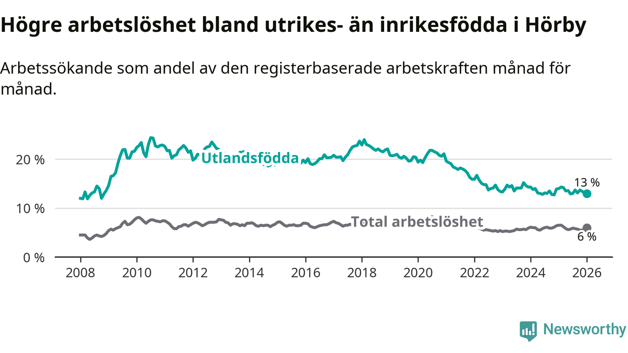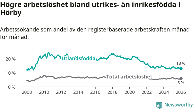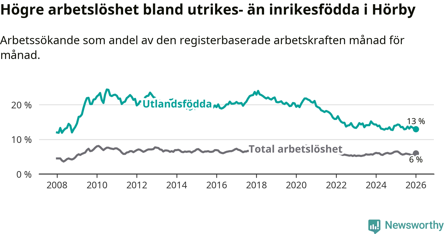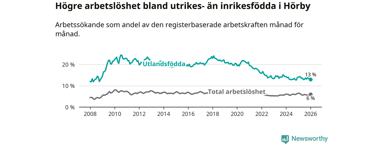 Arbetslösheten bland utlandsfödda var 13,0 procent i Hörby under januari månad, motsvarande 150 av 1 154 personer. Det är 1,0 procentenheter färre än vid samma tidpunkt i fjol (−11 om man räknar personer).