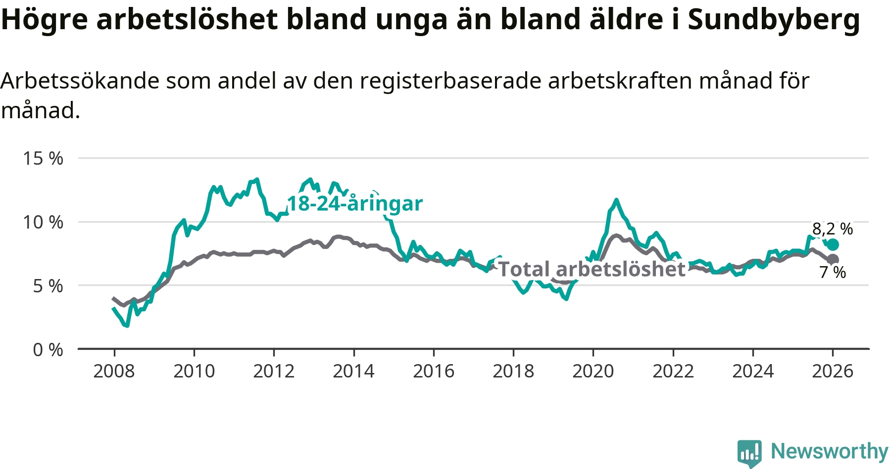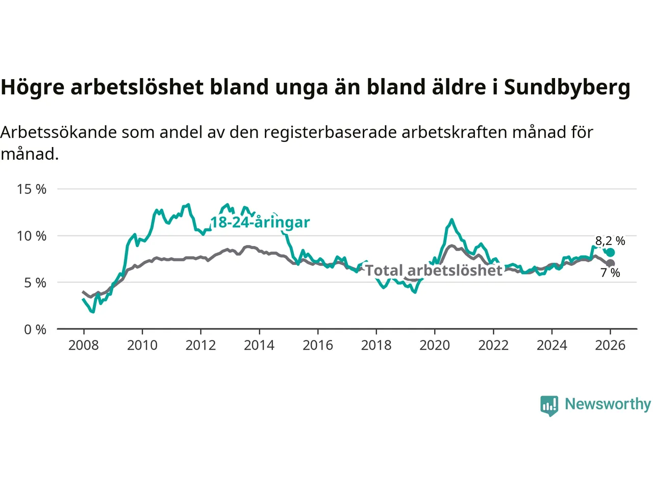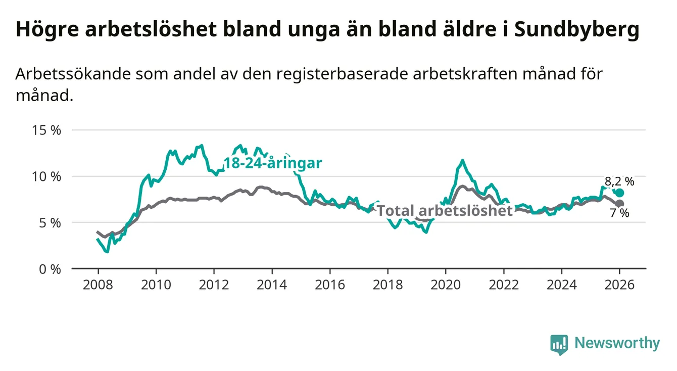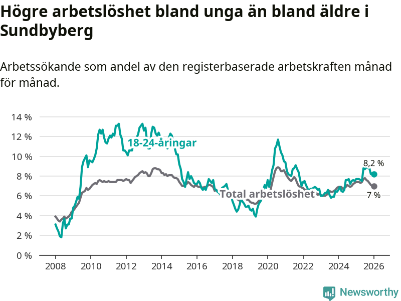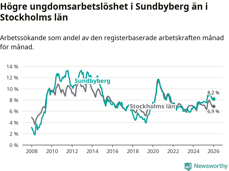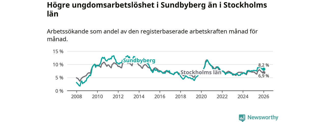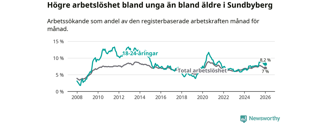 I och med den senaste månadens uppgång har de ungas arbetslöshet i Sundbyberg stigit över två år i sträck (upp från 6,4 procent i december 2023 till 8,2 procent nu).