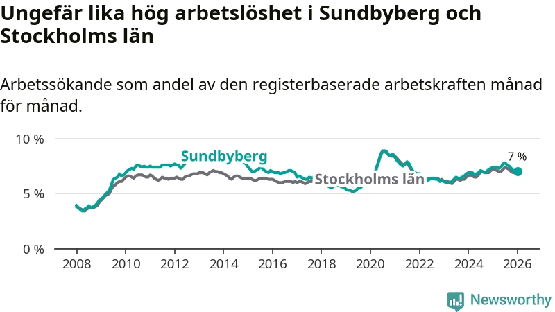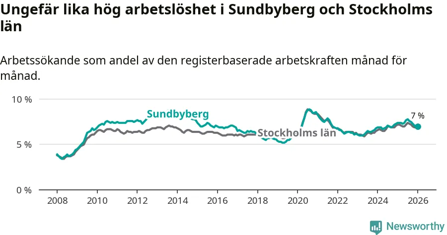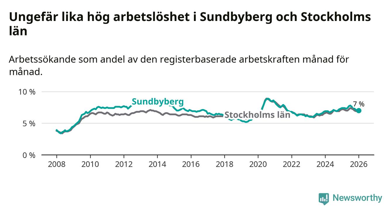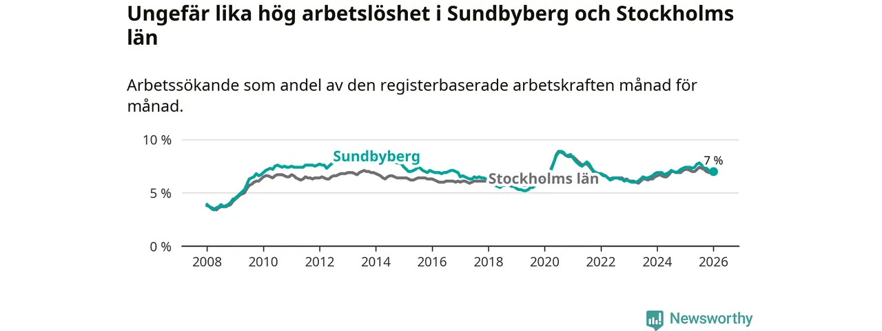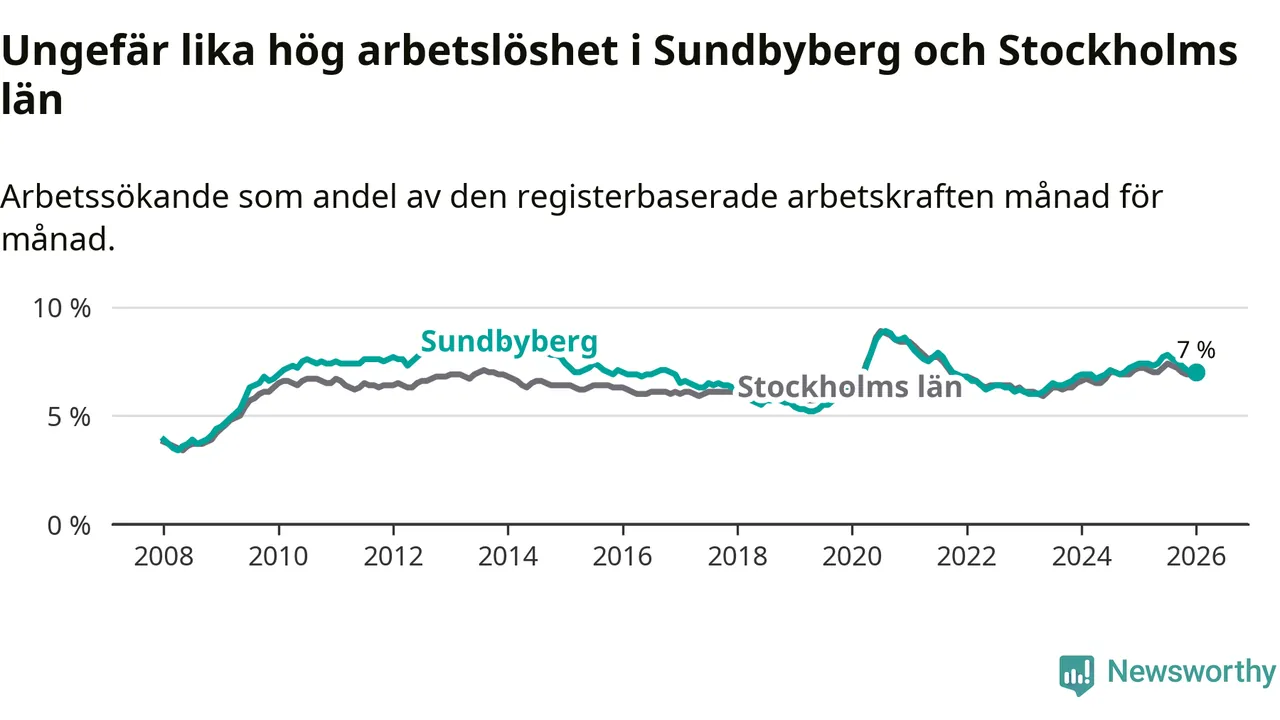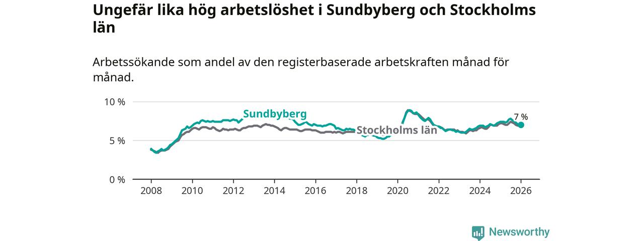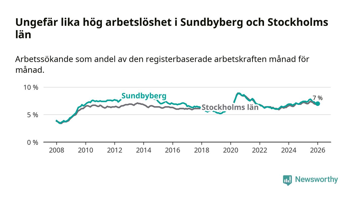 Under januari månad rapporterade Sundbybergs kommun en total arbetslöshet på 7,0 procent. Det är en minskning jämfört med samma tidpunkt i fjol (−0,4 procentenheter). Även i Stockholms län sjunker arbetslösheten något.