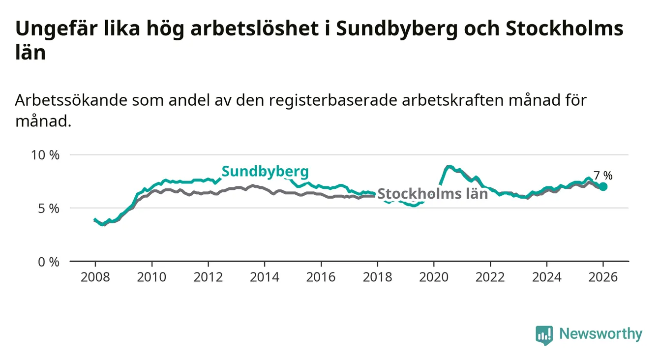Medan Sundbyberg har ungefär samma total arbetslöshet som Stockholms län, ligger ungdomsarbetslösheten 1,3 procentenheter högre i Sundbyberg.