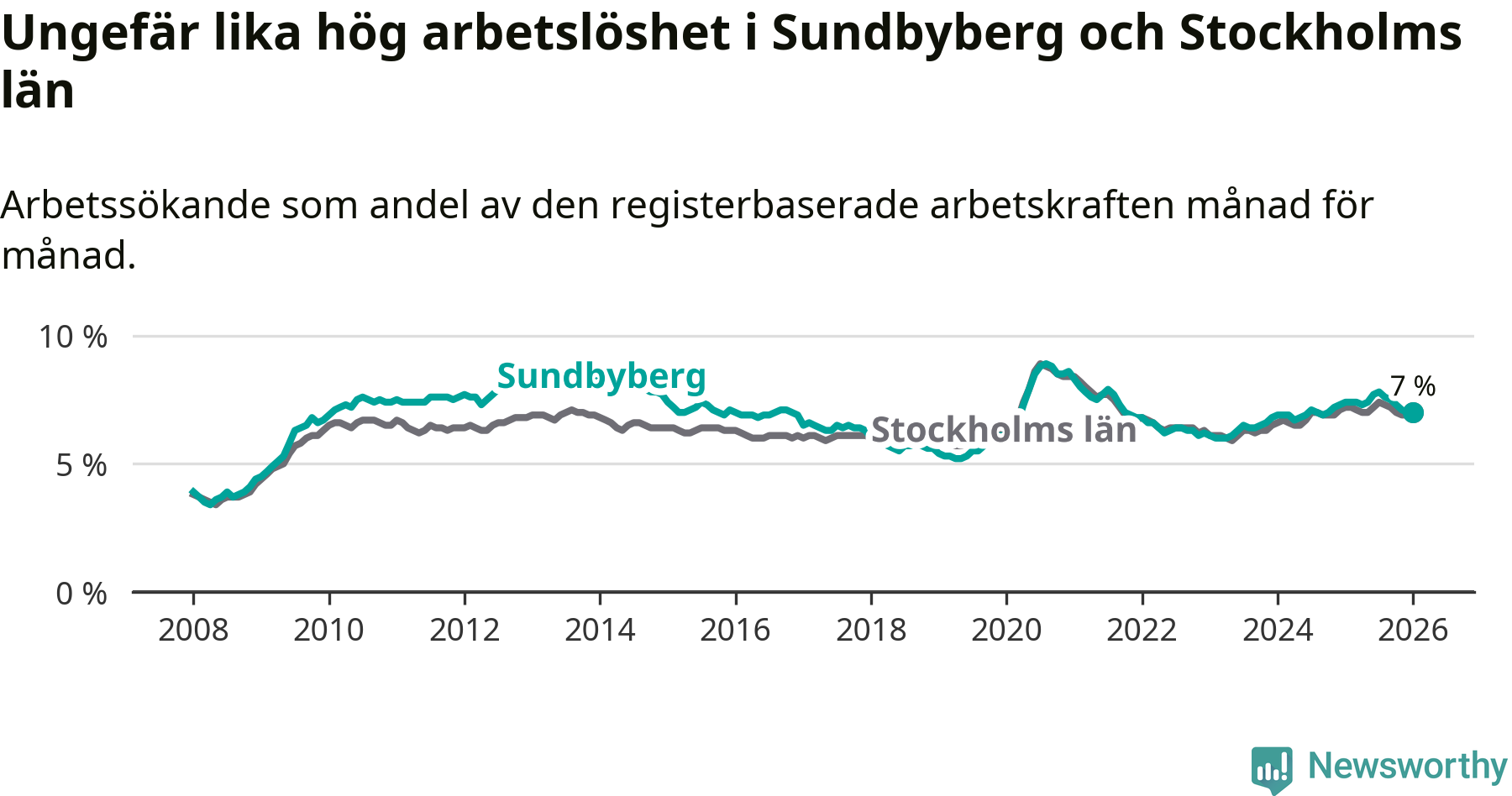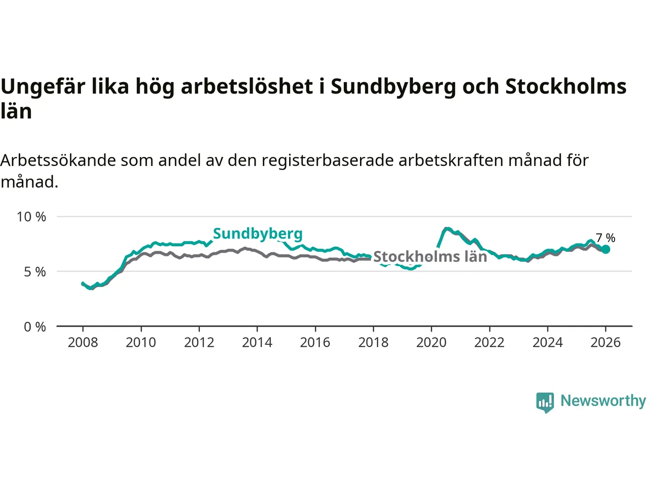 Den minskande arbetslösheten gör att Sundbyberg nu har i stort sett samma arbetslöshetsnivå som hela Stockholms län. Ekerö har den lägsta arbetslösheten i länet (3,7 procent), medan Södertälje har den högsta (10,9 procent). För att Sundbyberg skulle komma ner i samma arbetslöshetsnivå som Ekerö skulle 1 095 personer behöva sysselsättas.