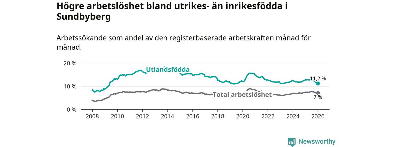 Arbetslösheten bland utlandsfödda var 11,2 procent i Sundbyberg under januari månad, motsvarande 1 438 av 12 839 personer. Det är 1,5 procentenheter färre än vid samma tidpunkt i fjol (−146 om man räknar personer).