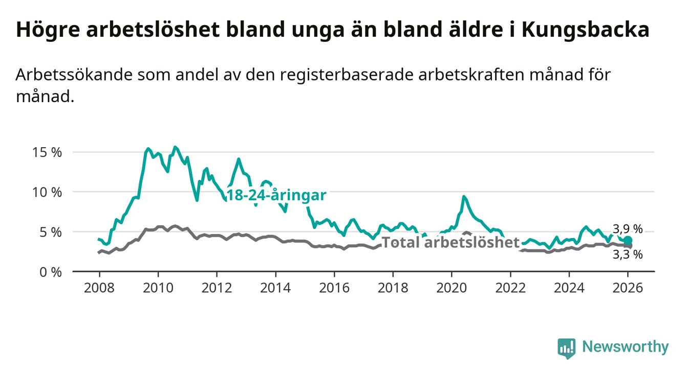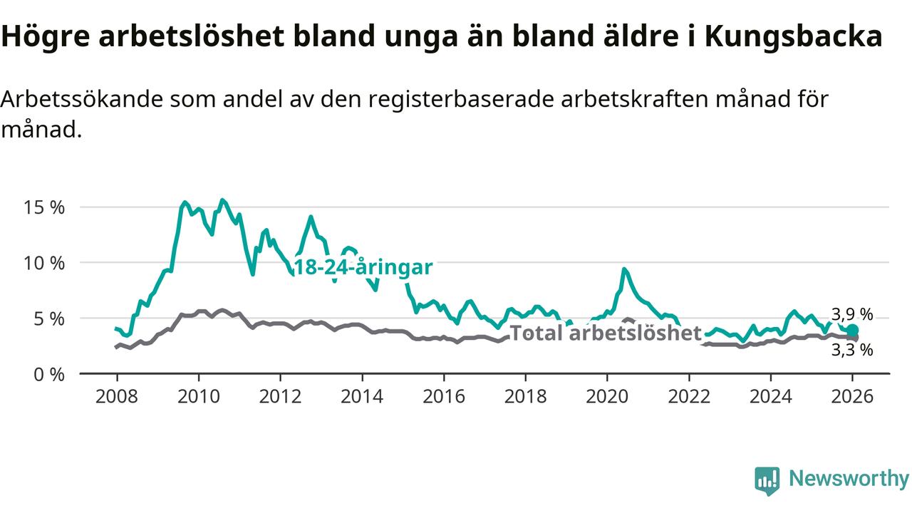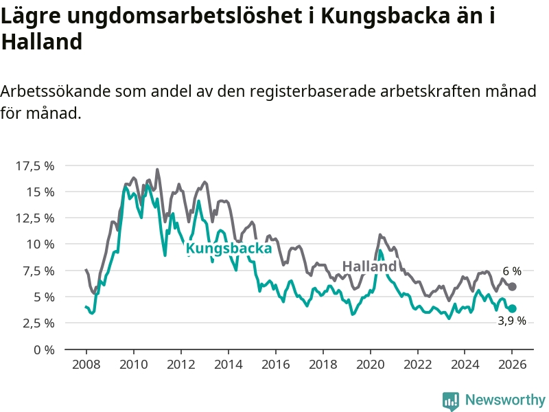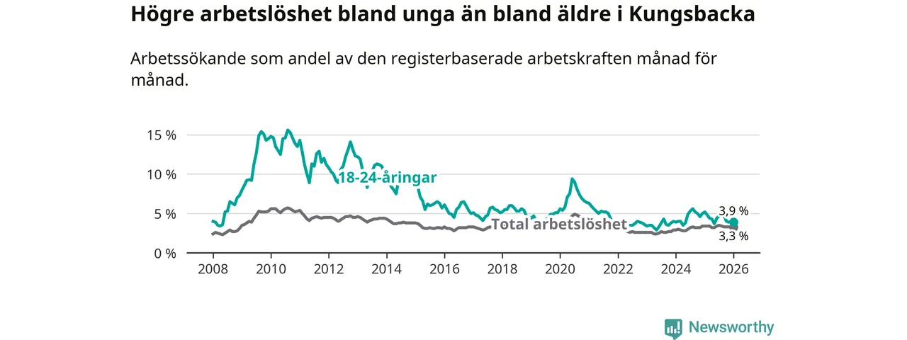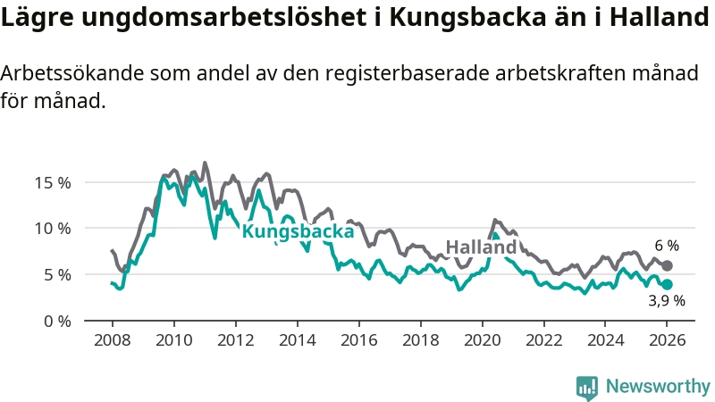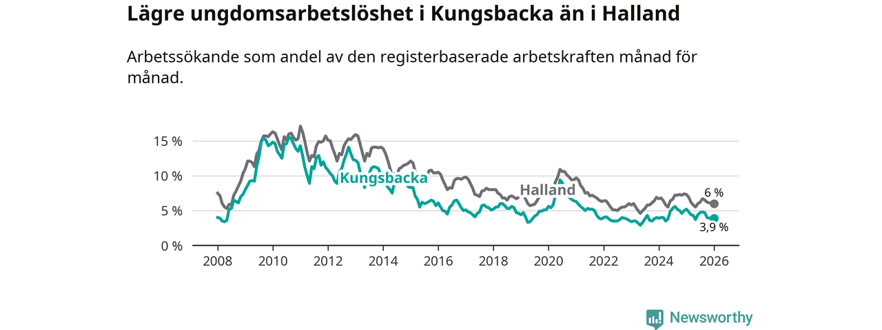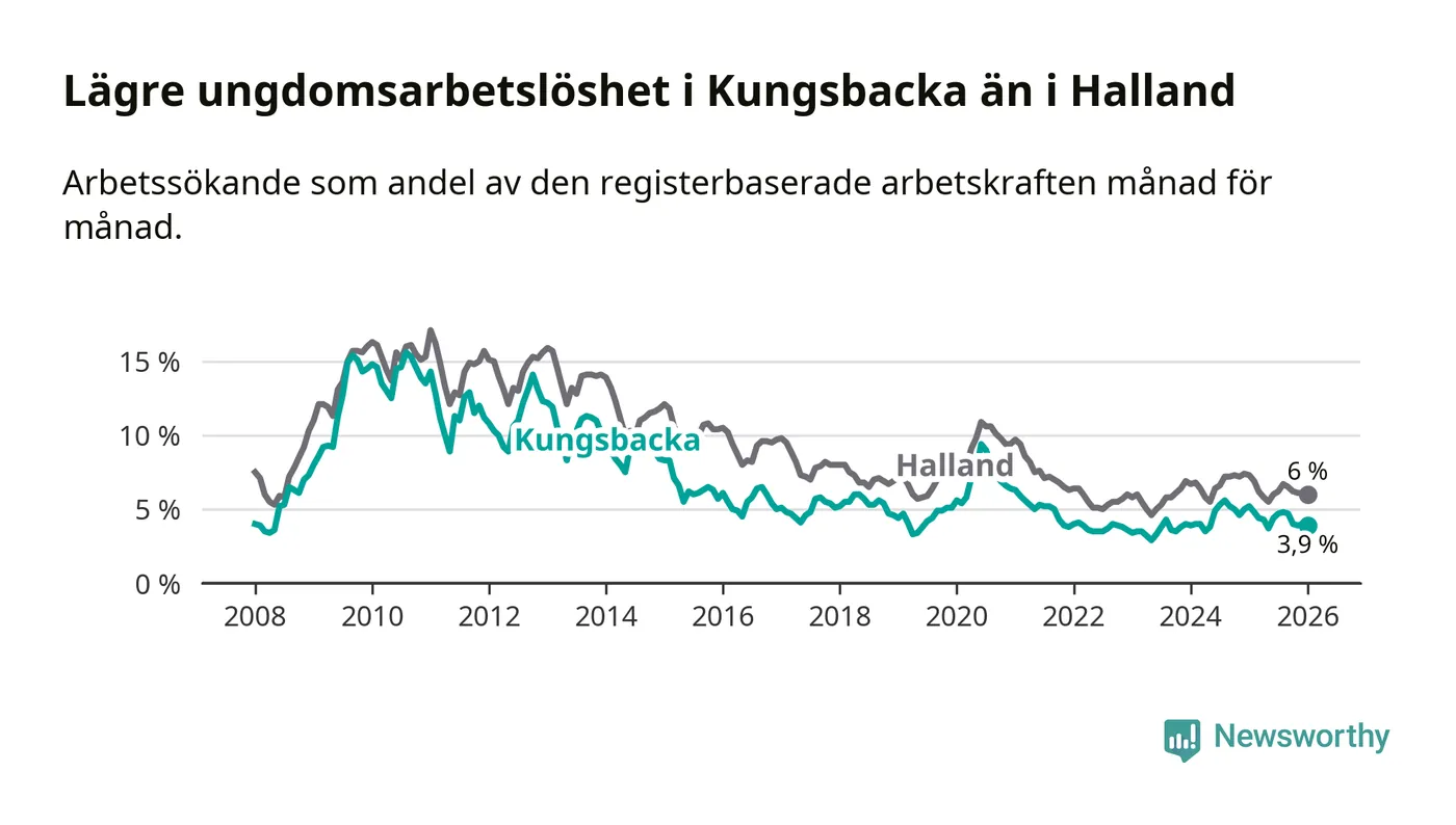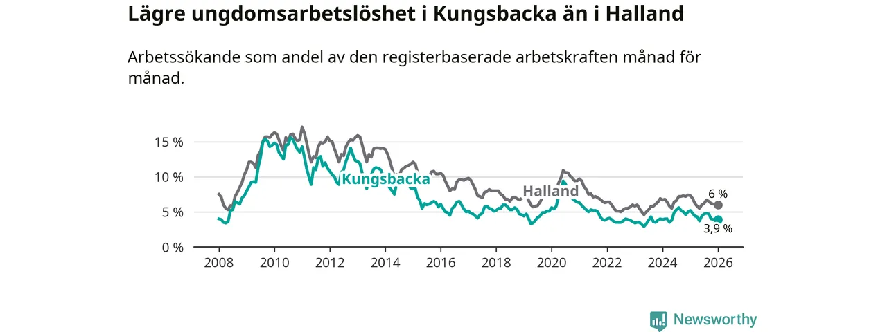 Graf: Arbetslöshet bland unga i Kungsbacka kommun och Hallands län