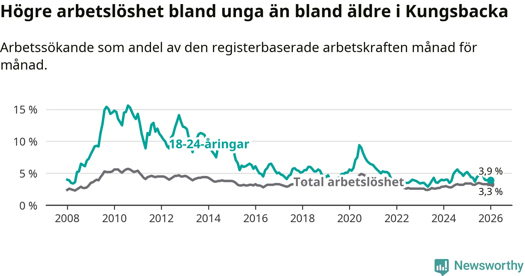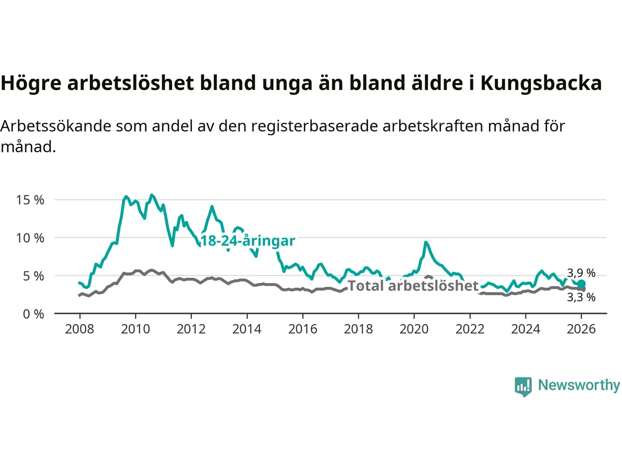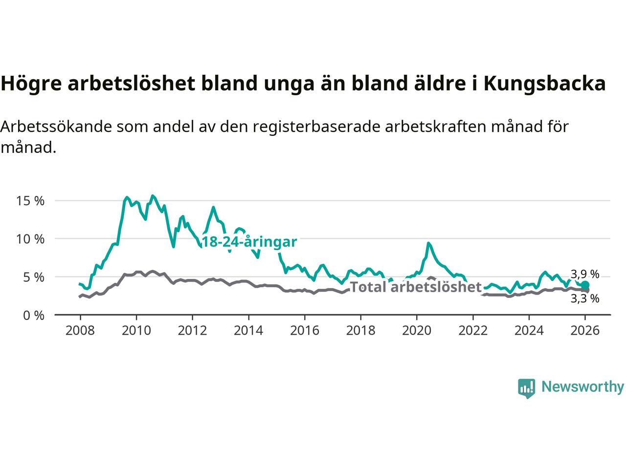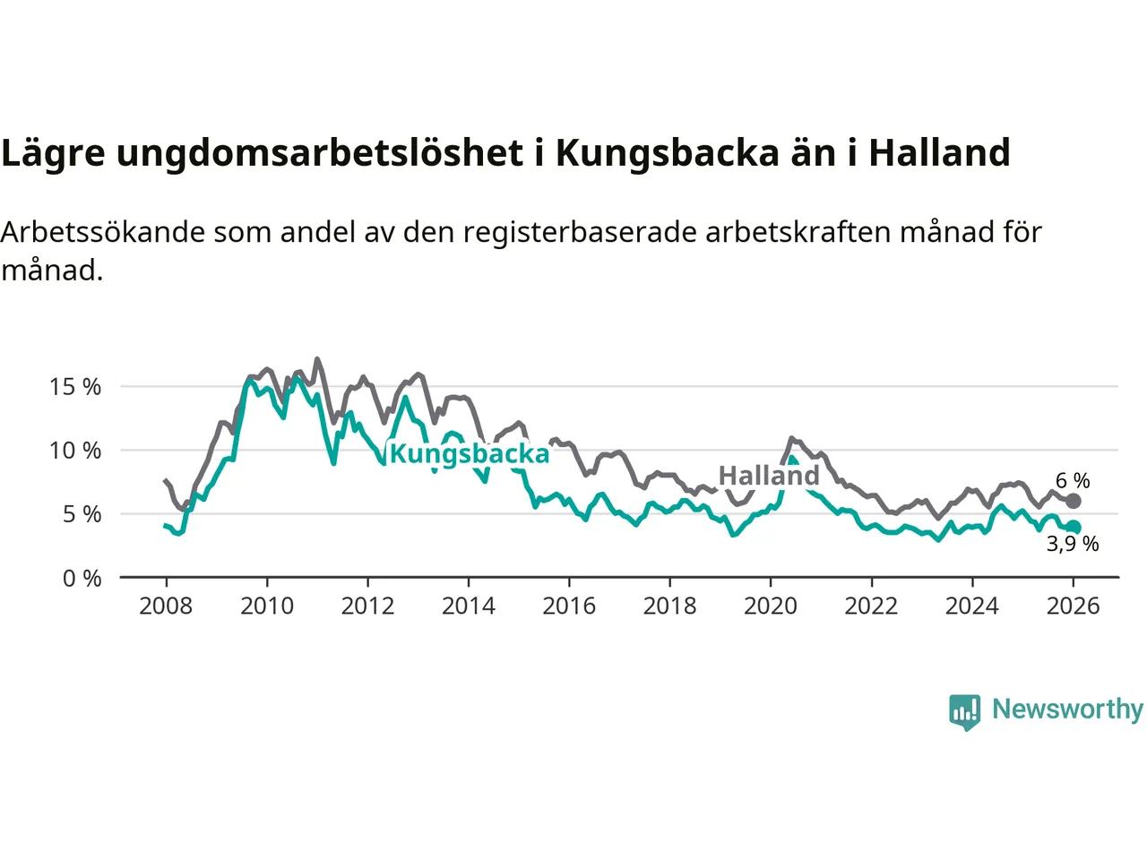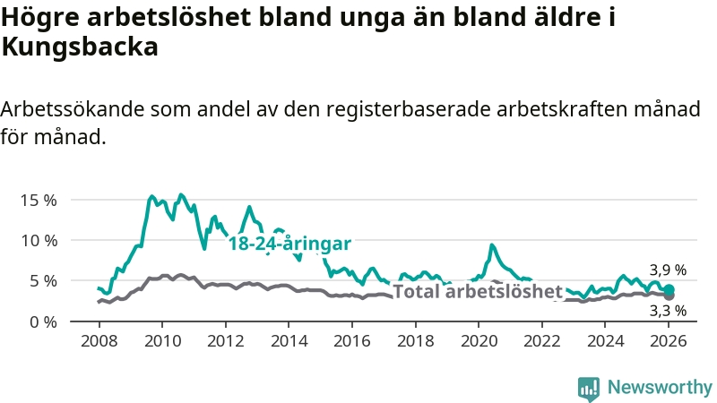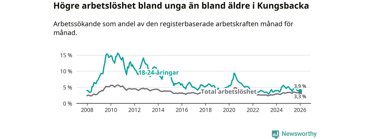 Graf: Arbetslöshet bland unga i Kungsbacka kommun och Hallands län