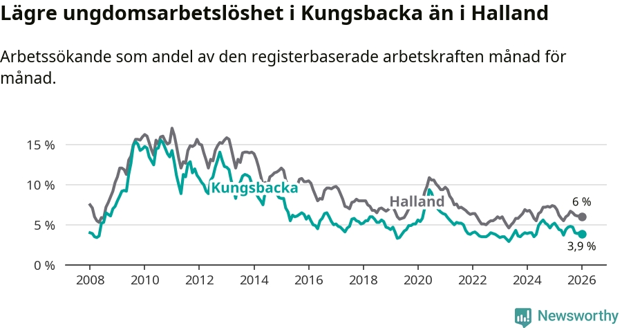 Precis som den totala arbetslösheten ligger ungdomsarbetslösheten i Kungsbacka lägre än i Halland som helhet. Skillnaden mellan kommunen och länet är 2,1 procentenheter.