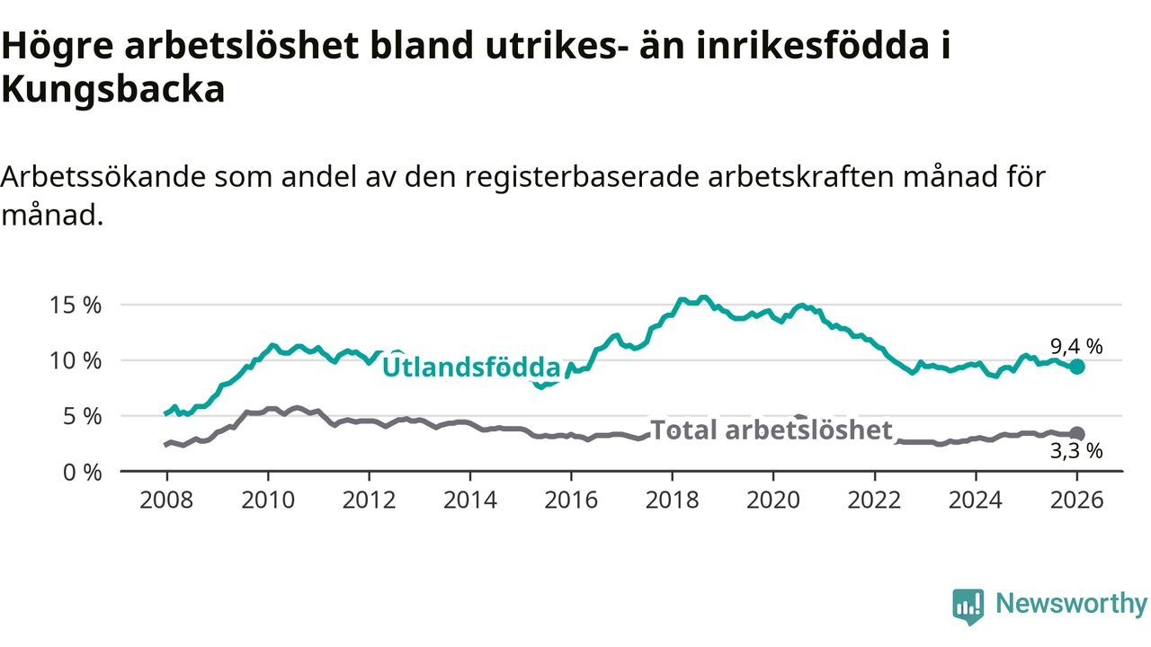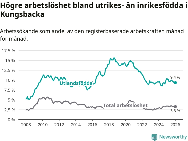 Arbetslösheten bland utlandsfödda var 9,4 procent i Kungsbacka under januari månad, motsvarande 445 av 4 734 personer. Det är 1,0 procentenheter färre än vid samma tidpunkt i fjol (−32 om man räknar personer).