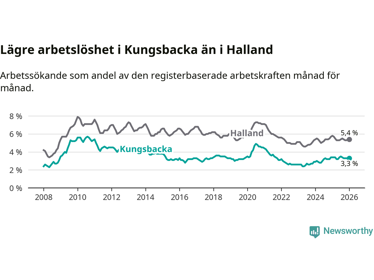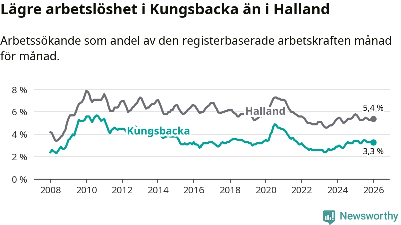 Kungsbacka hade redan tidigare lägre arbetslöshet än snittet i hela Hallands län och nu växer klyftan (3,3 procent i kommunen, jämfört med 5,4 procent i hela länet). Kungsbacka har därmed även den lägsta arbetslöshetsnivån i länet. Hylte har den högsta (8,0 procent).
