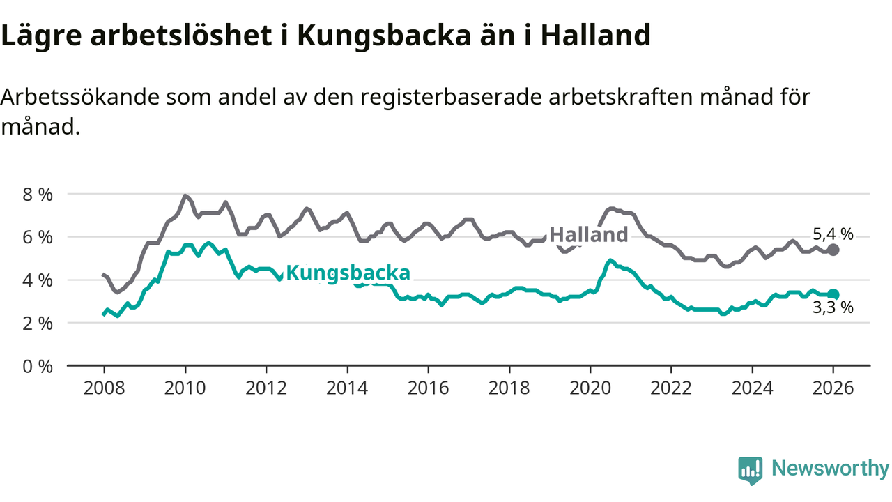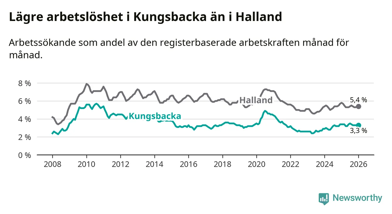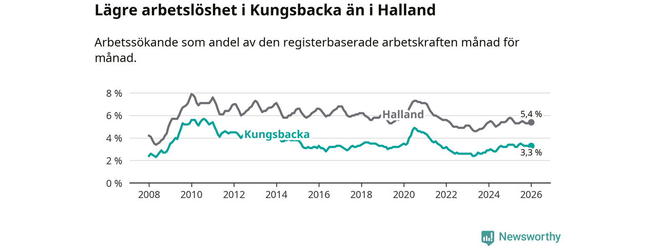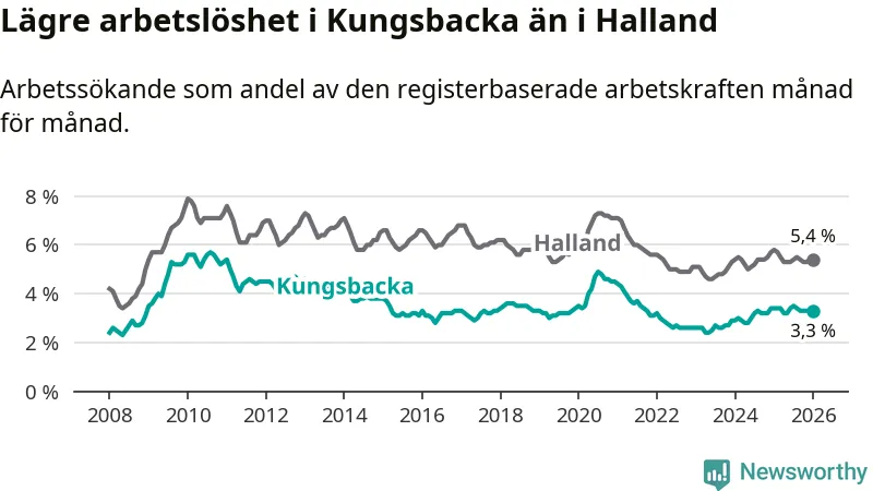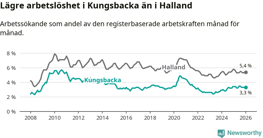 Under januari månad rapporterade Kungsbacka kommun en total arbetslöshet på 3,3 procent. Det är en minskning jämfört med samma tidpunkt i fjol (−0,1 procentenheter). Även i Hallands län sjunker arbetslösheten .