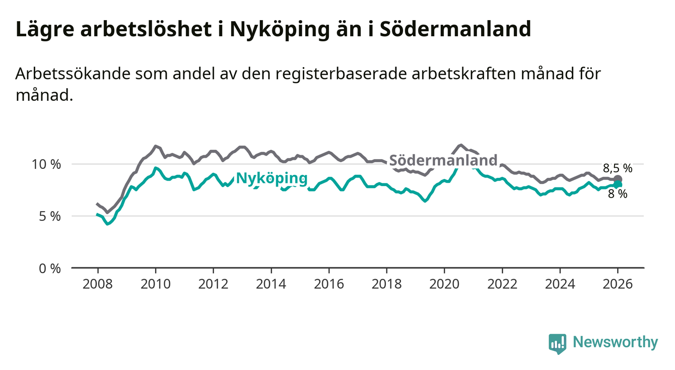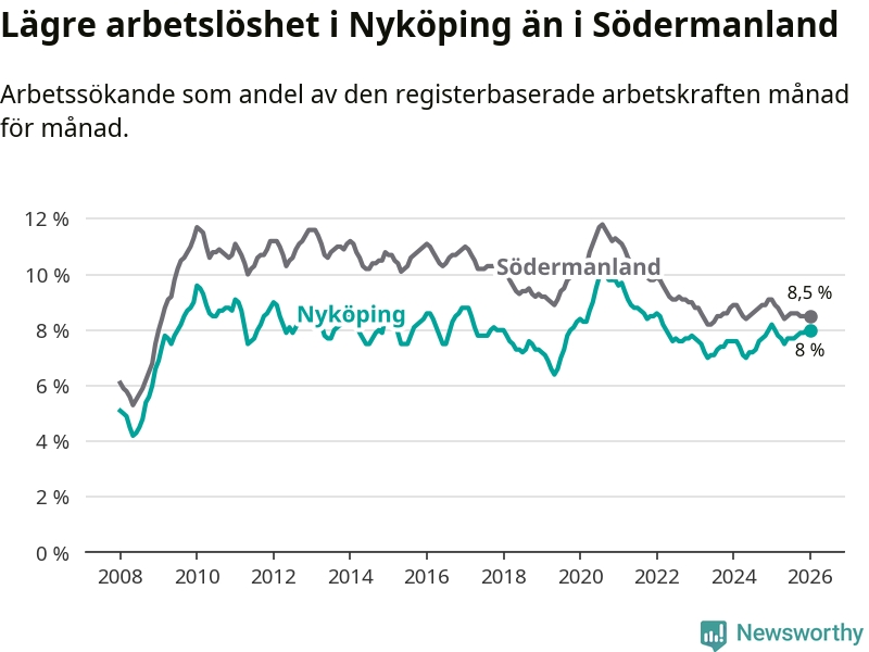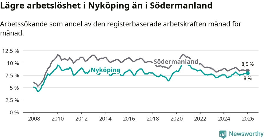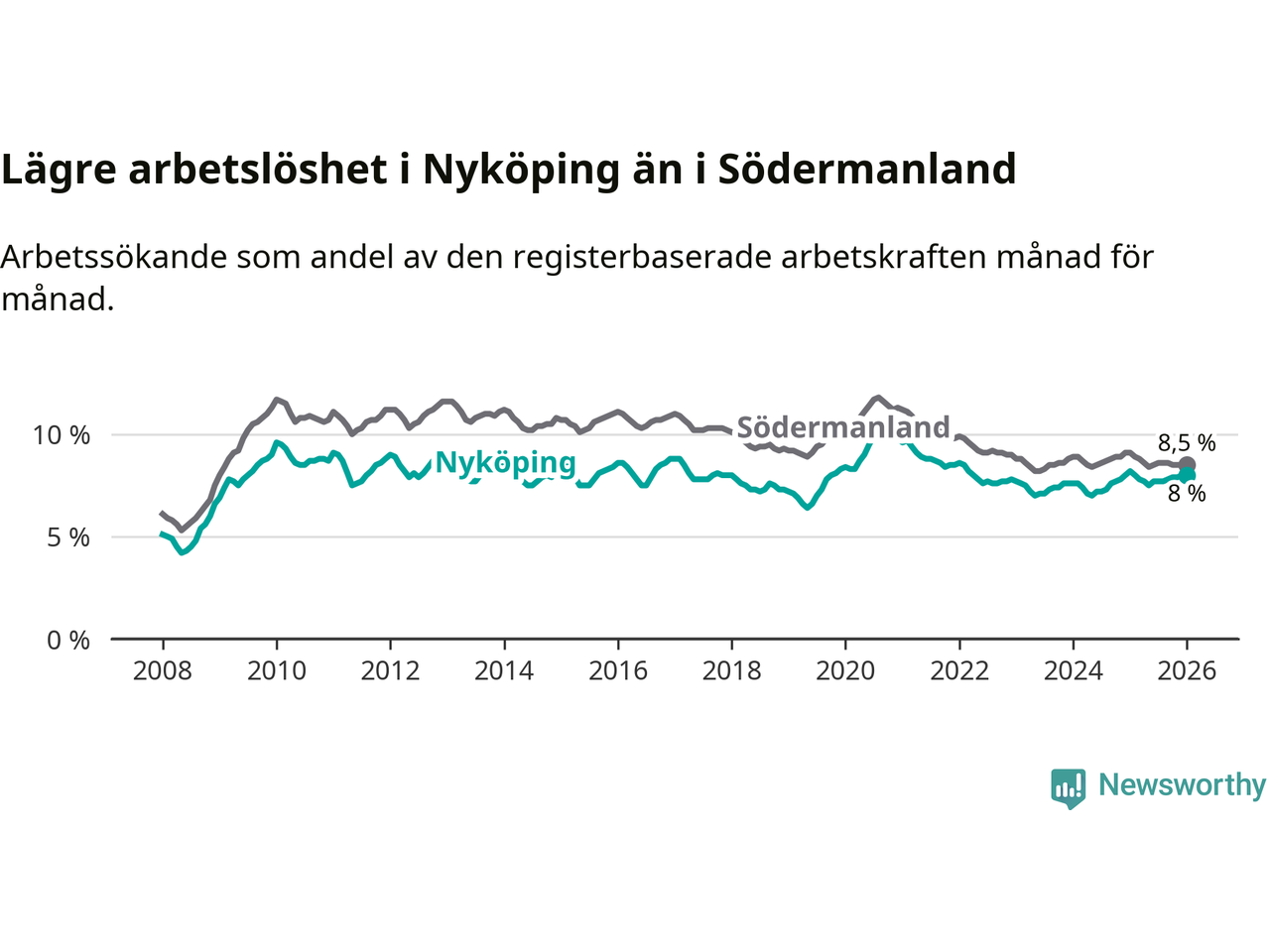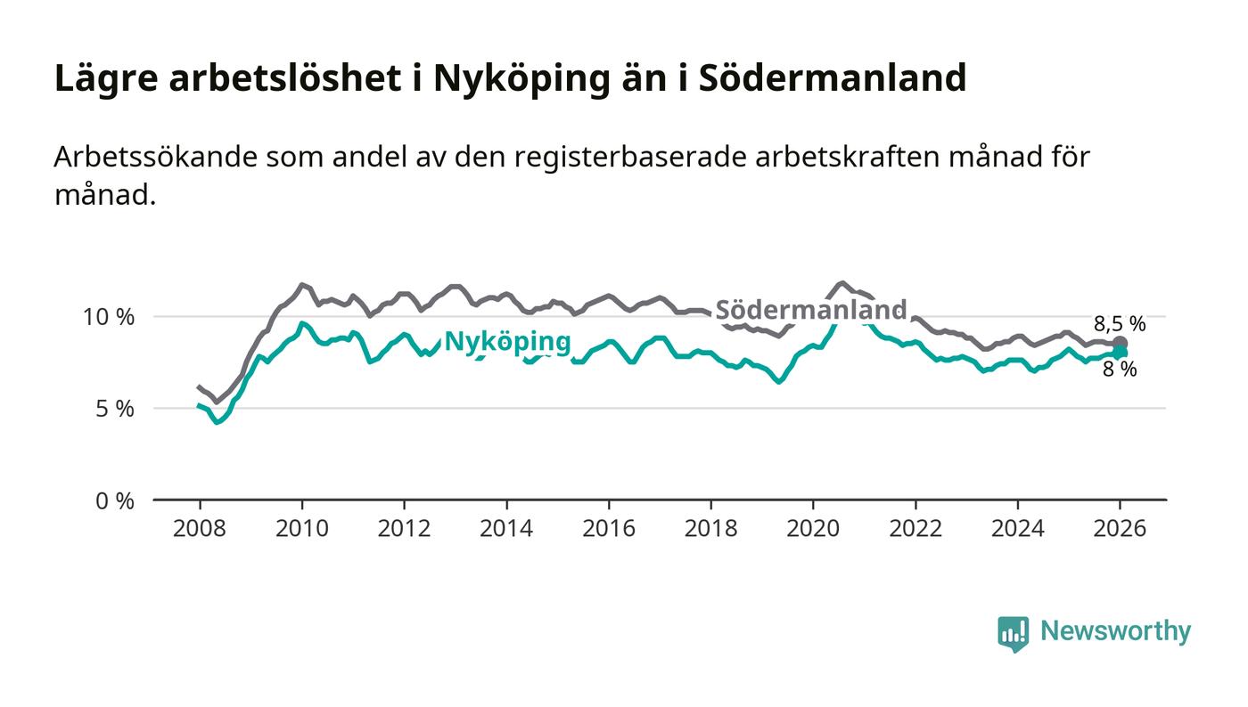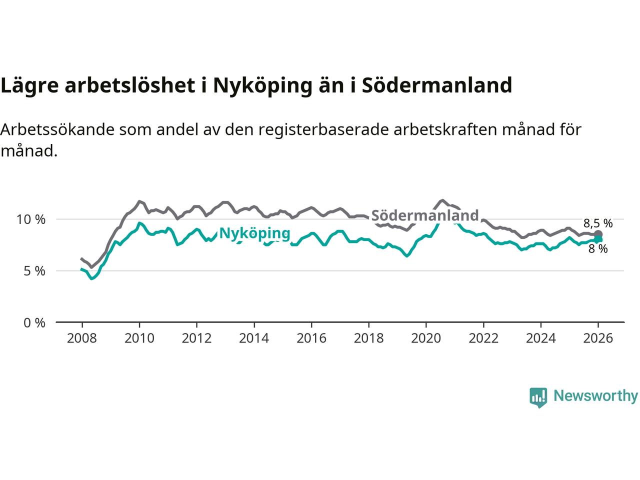 Under januari månad rapporterade Nyköpings kommun en total arbetslöshet på 8,0 procent. Det är en minskning jämfört med samma tidpunkt i fjol (−0,2 procentenheter). Även i Södermanlands län sjunker arbetslösheten .