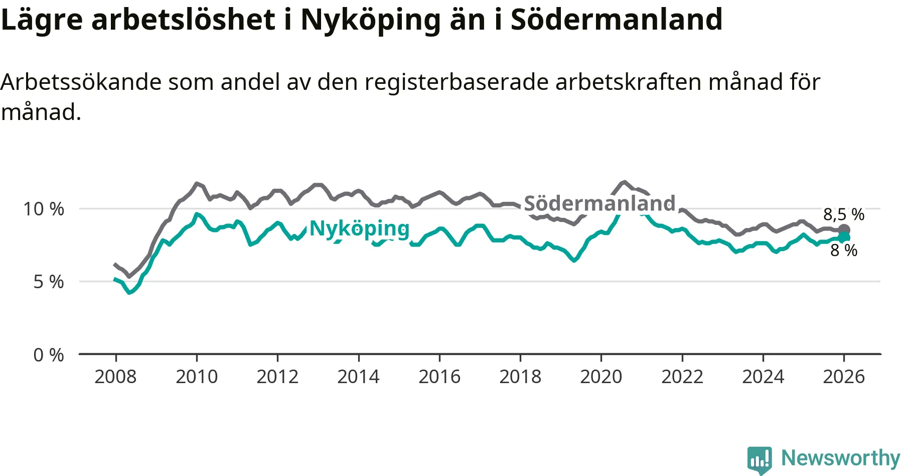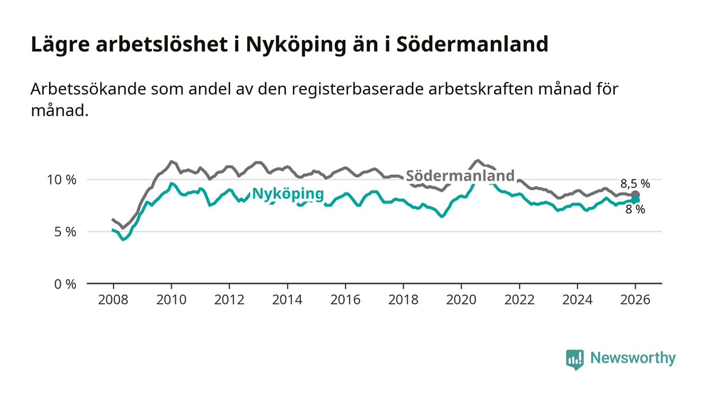 Nyköping hade redan tidigare lägre arbetslöshet än snittet i hela Södermanlands län och nu växer klyftan (8,0 procent i kommunen, jämfört med 8,5 procent i hela länet). Trosa har den lägsta arbetslösheten i länet (3,6 procent), medan Eskilstuna har den högsta (10,7 procent). För att Nyköping skulle komma ner i samma arbetslöshetsnivå som Trosa skulle 1 213 personer behöva sysselsättas.