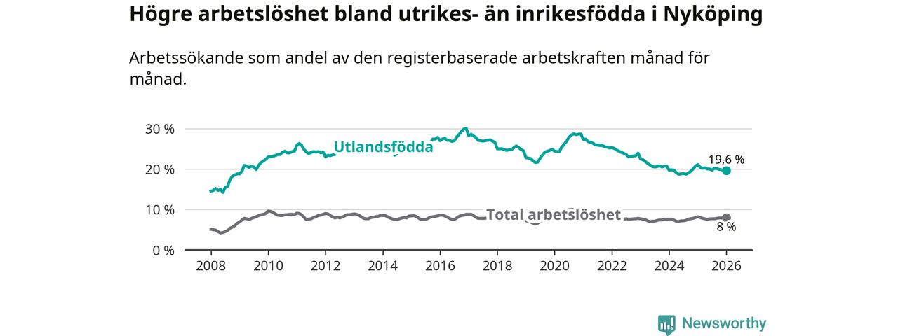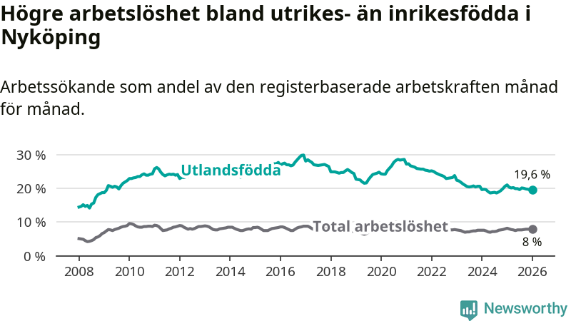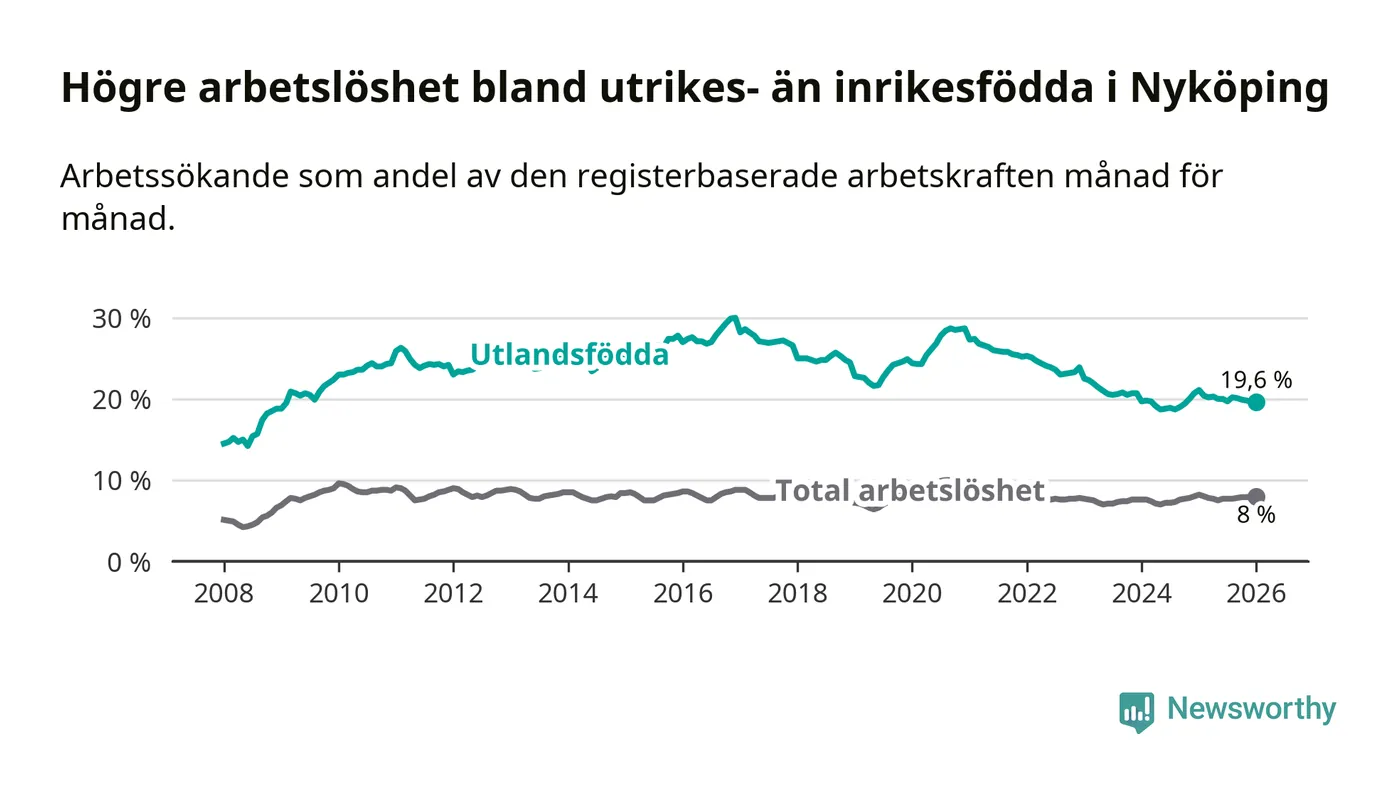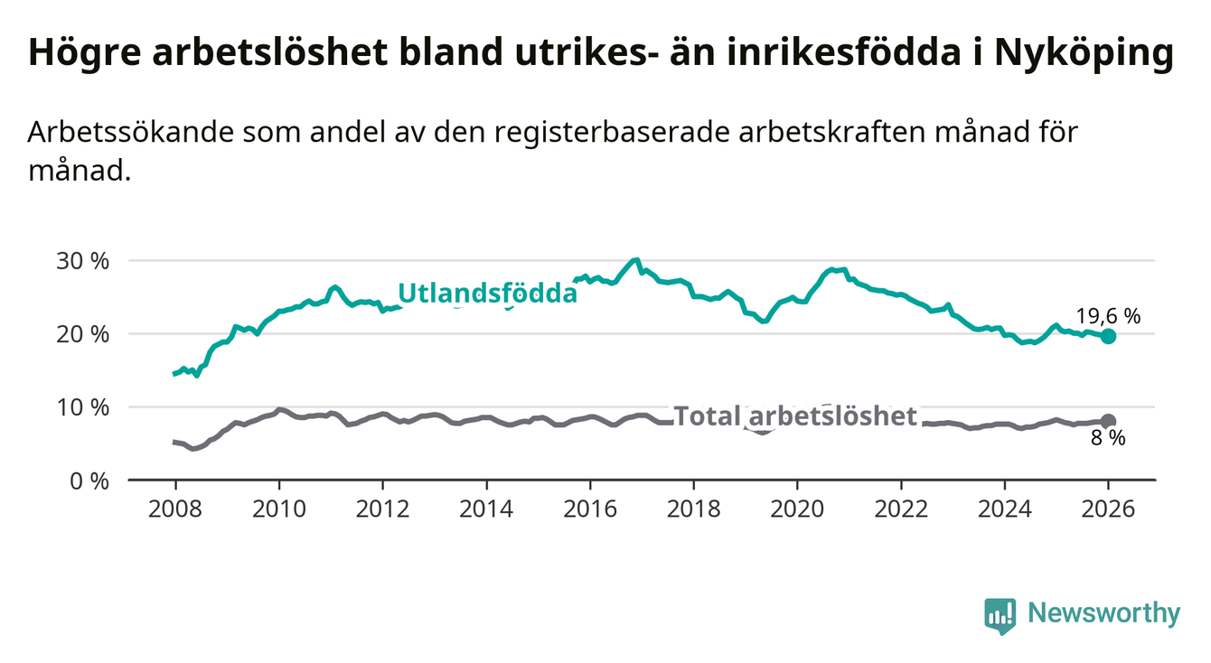 Arbetslösheten bland utlandsfödda var 19,6 procent i Nyköping under januari månad, motsvarande 1 112 av 5 673 personer. Det är 1,5 procentenheter färre än vid samma tidpunkt i fjol (−62 om man räknar personer).