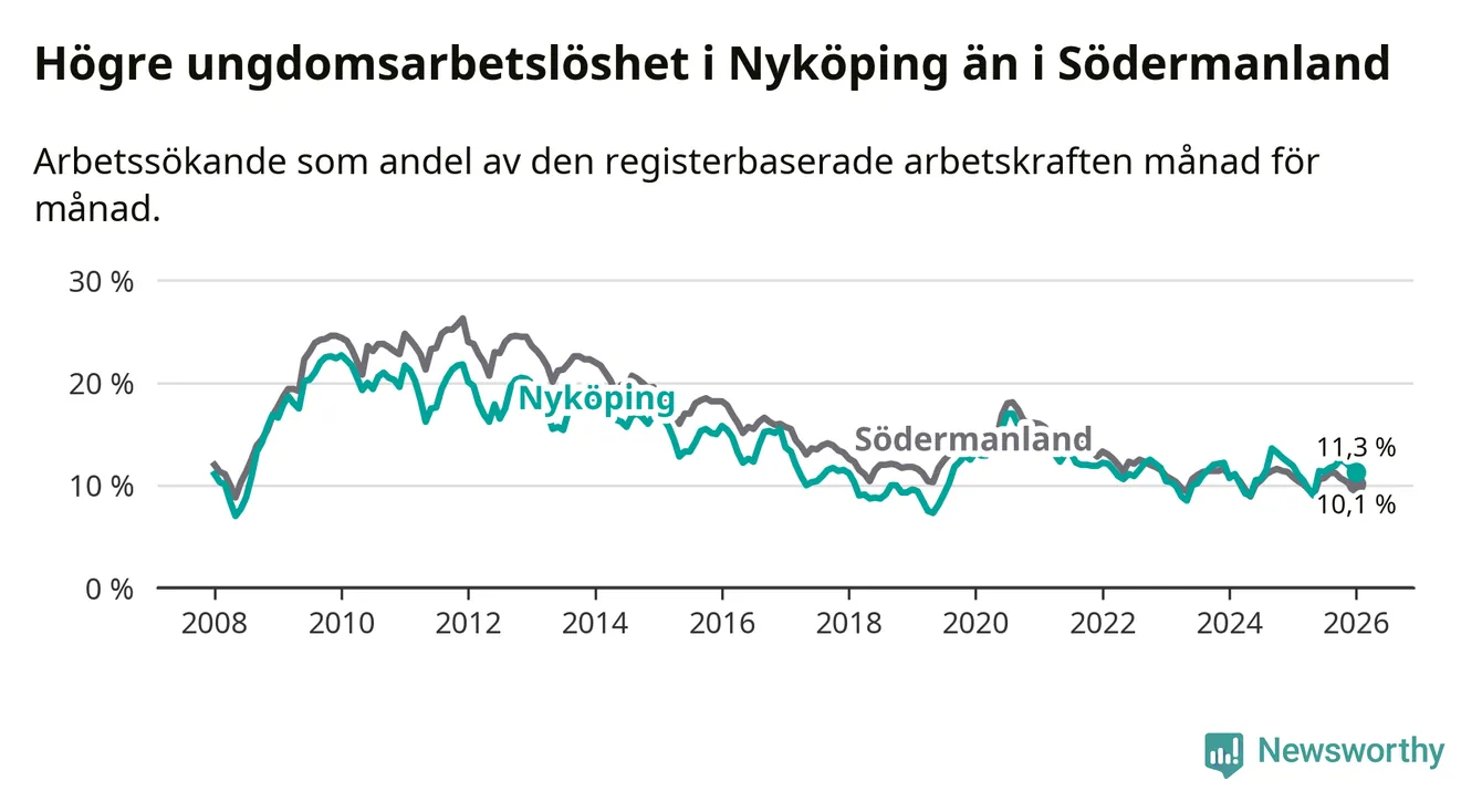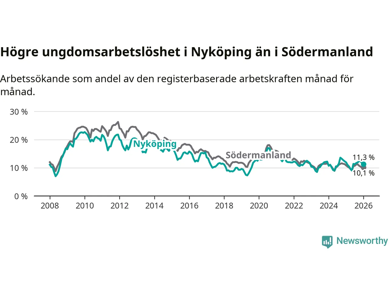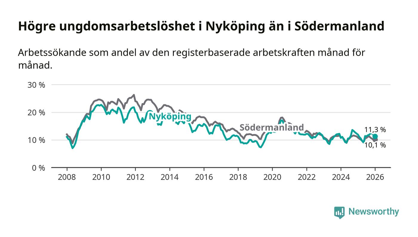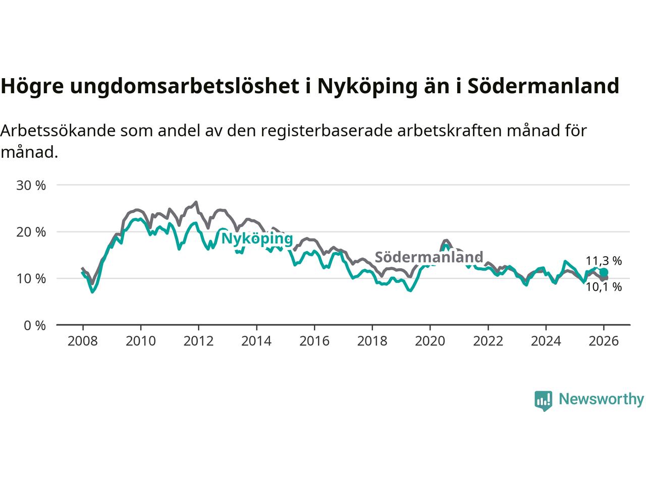 Medan Nyköping har lägre total arbetslöshet än Södermanland, ligger ungdomsarbetslösheten 1,2 procentenheter högre i Nyköping.