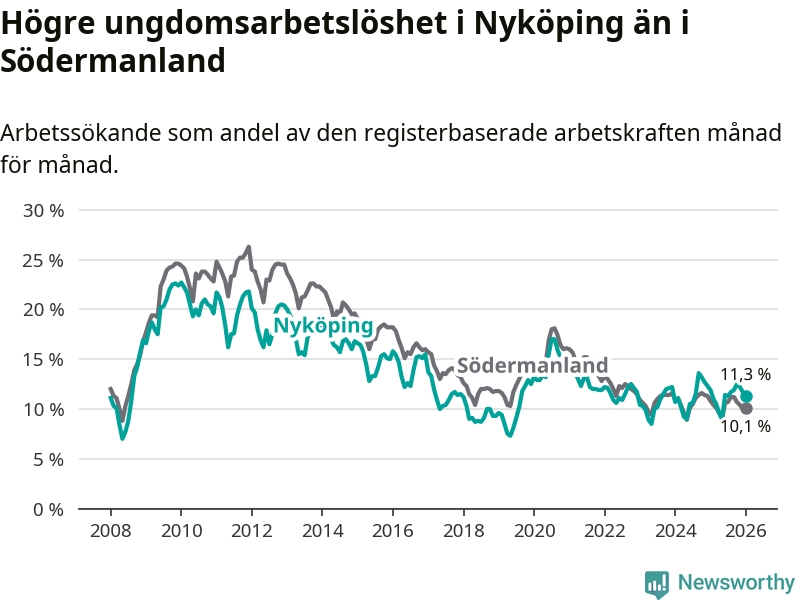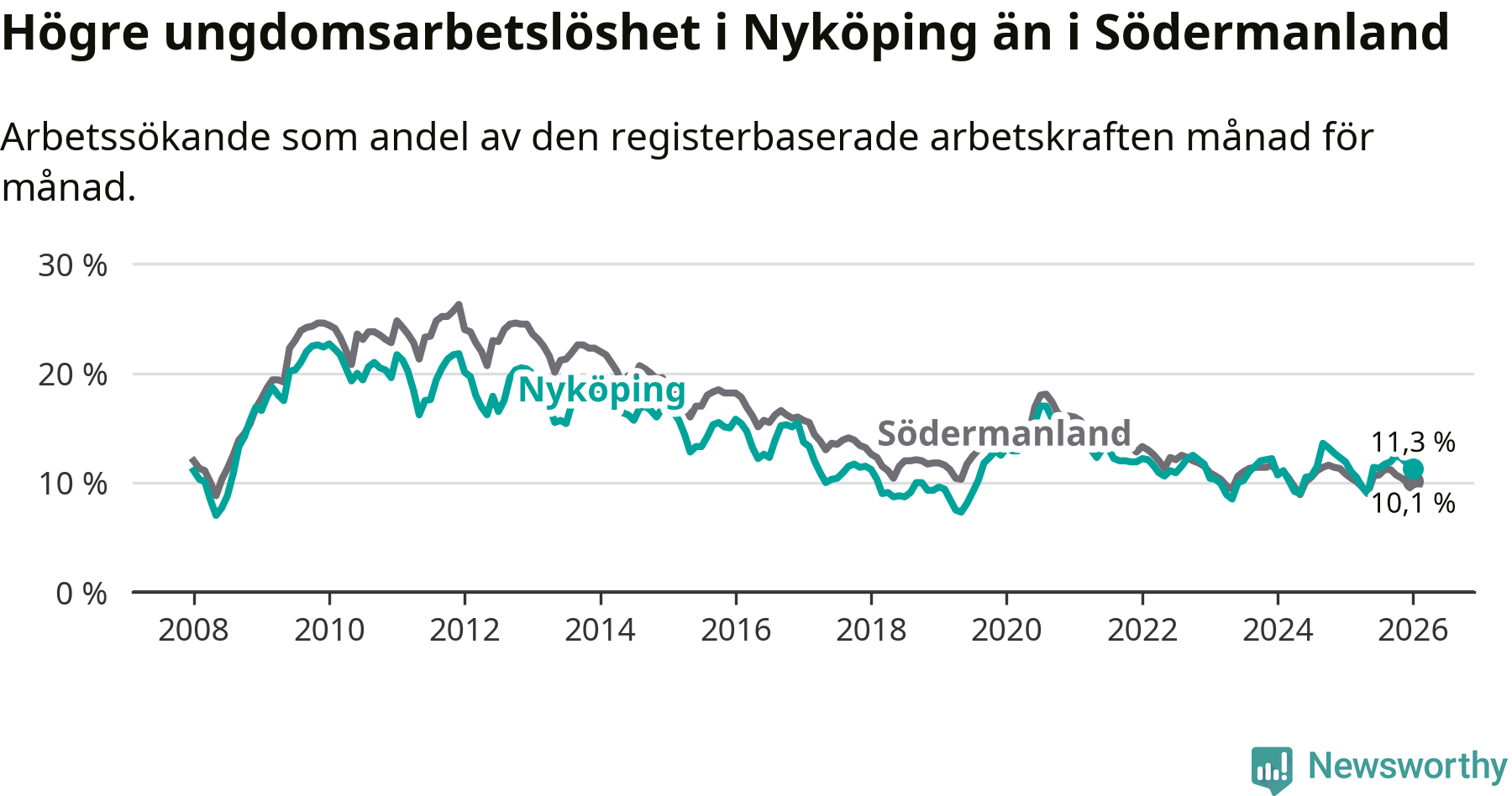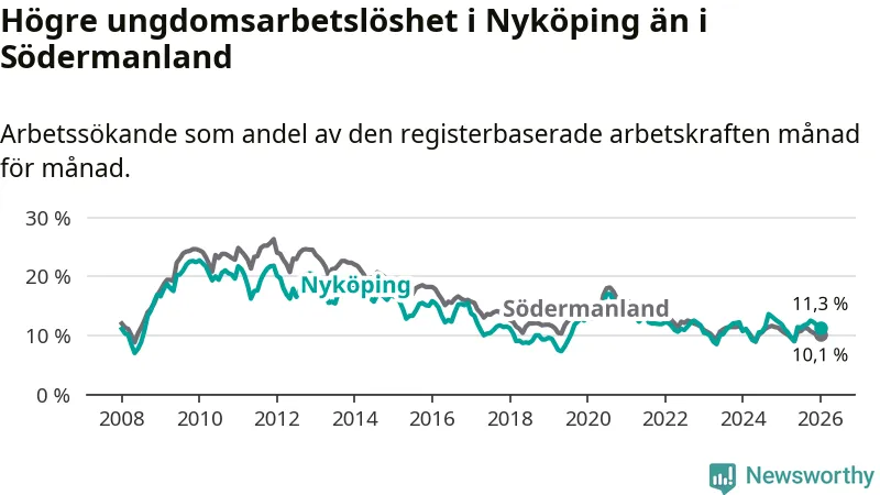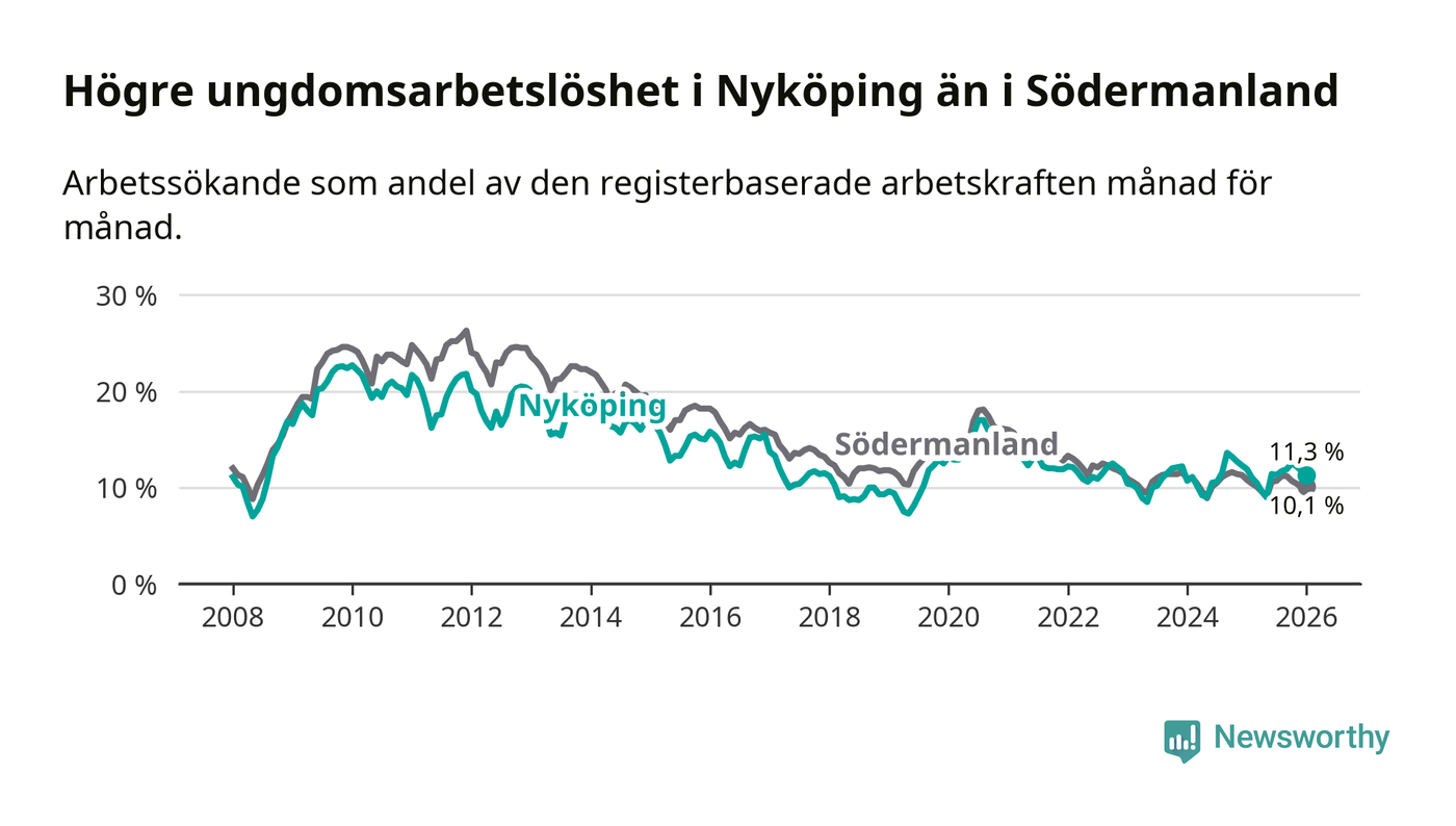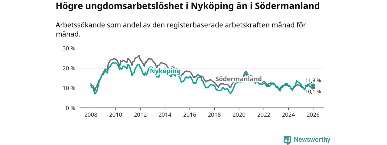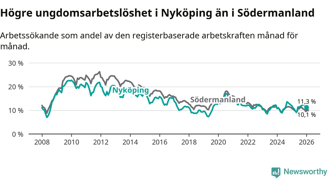 Medan Nyköping har lägre total arbetslöshet än Södermanland, ligger ungdomsarbetslösheten 1,2 procentenheter högre i Nyköping.