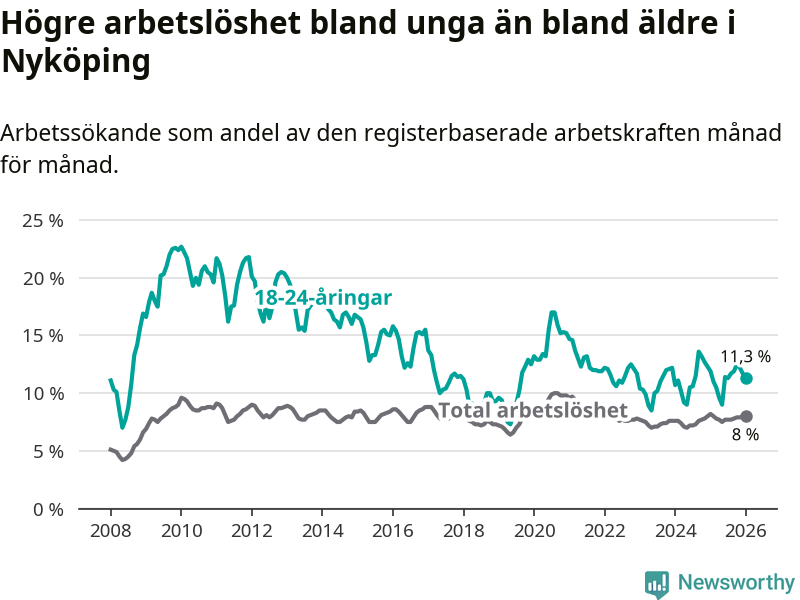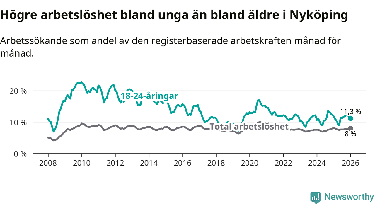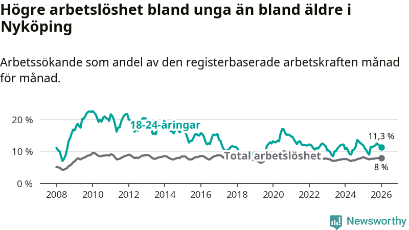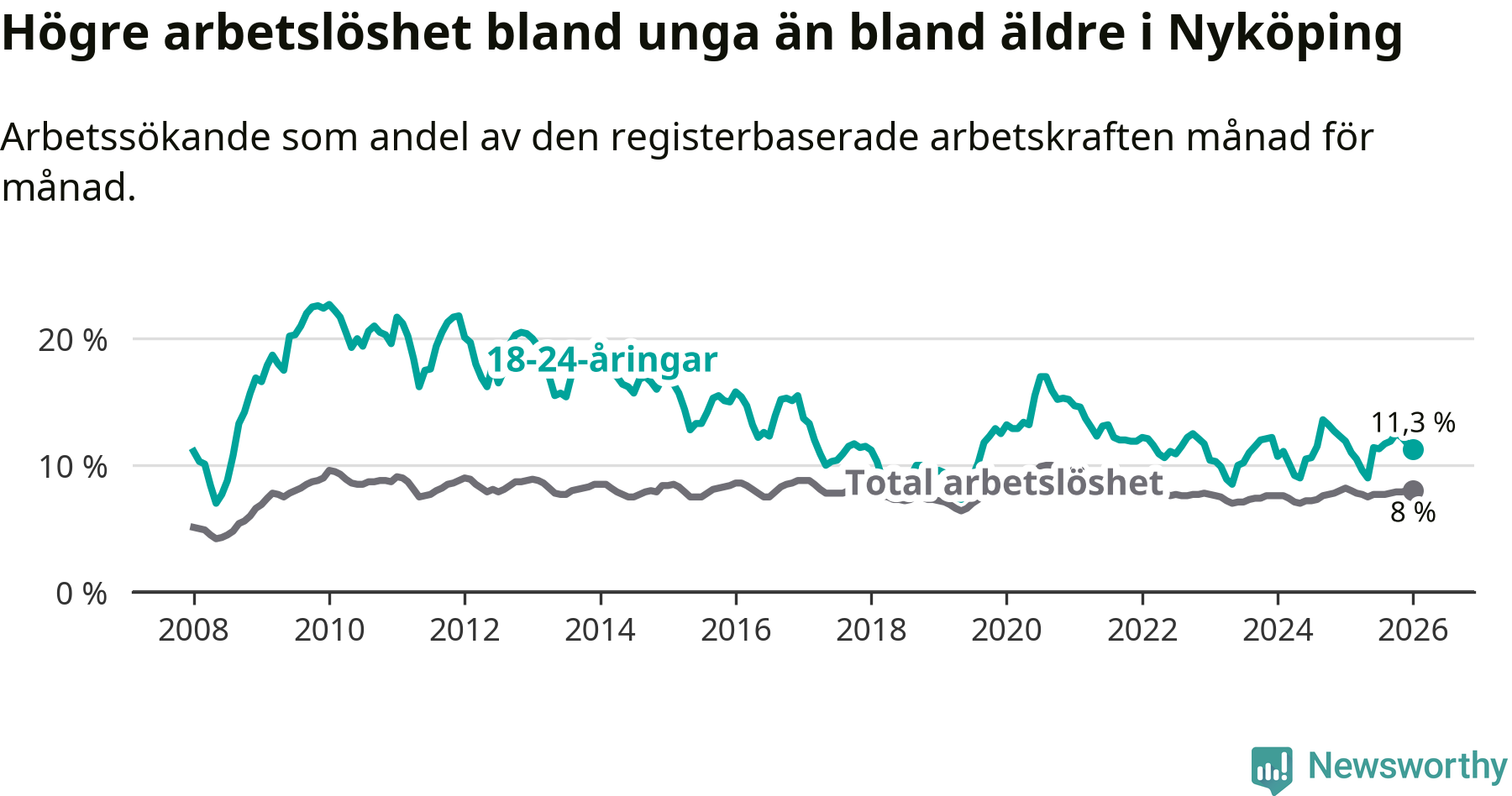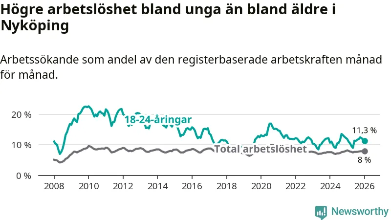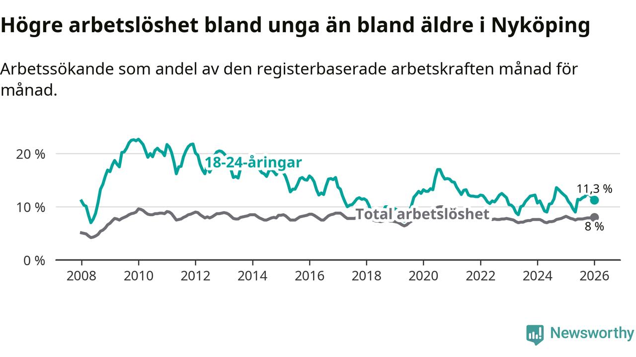 Medan Nyköping har lägre total arbetslöshet än Södermanland, ligger ungdomsarbetslösheten 1,2 procentenheter högre i Nyköping.