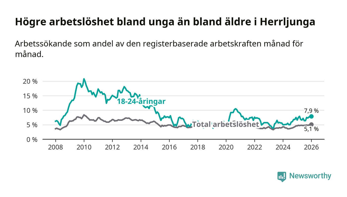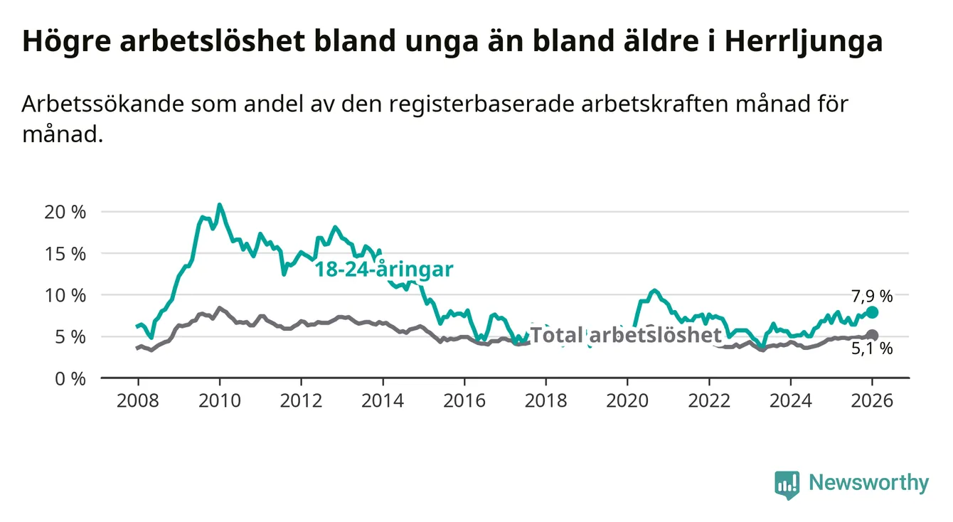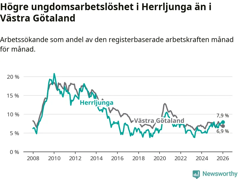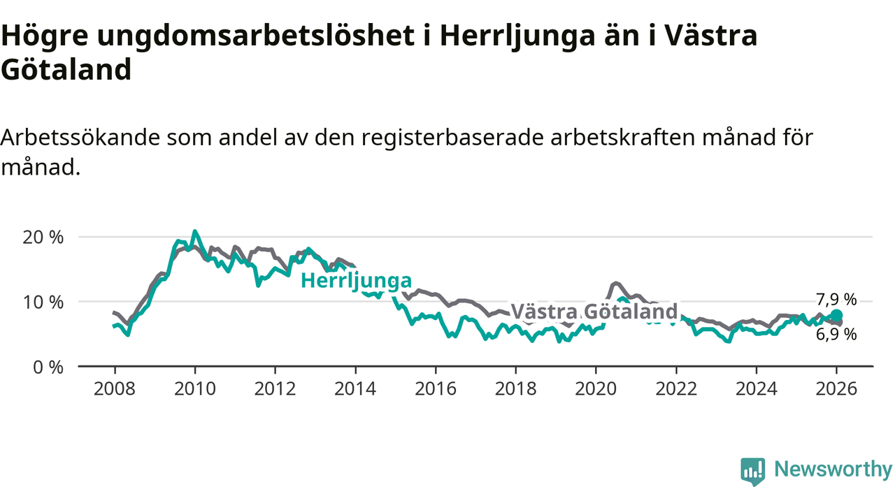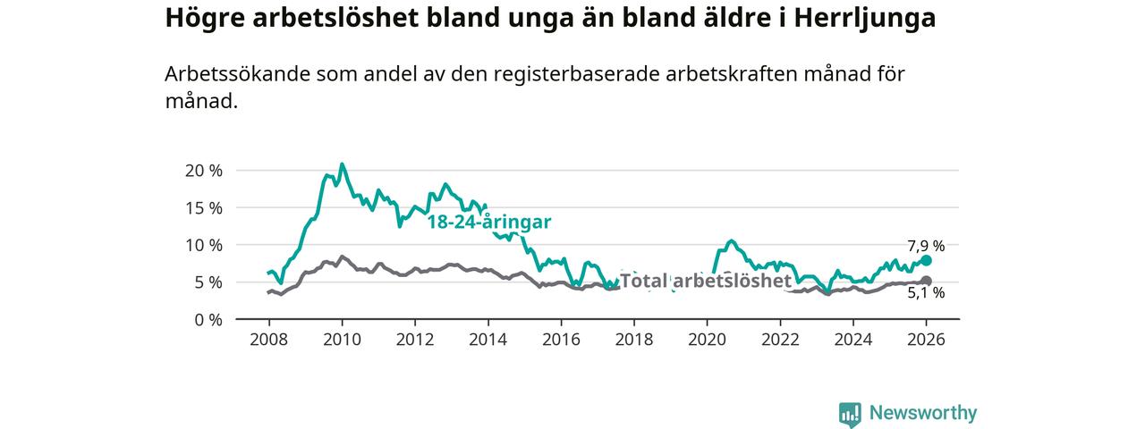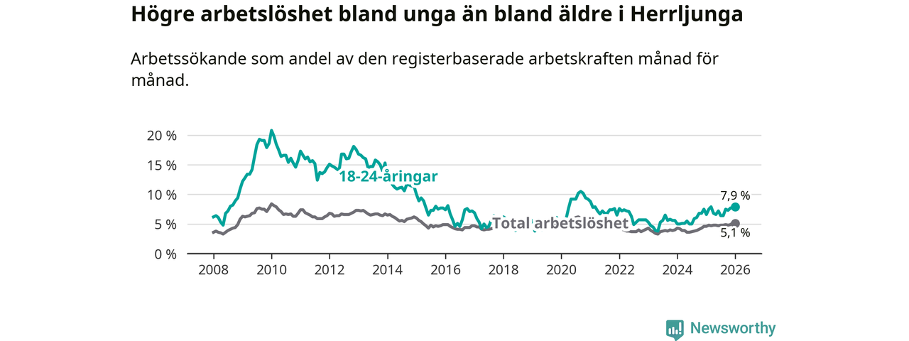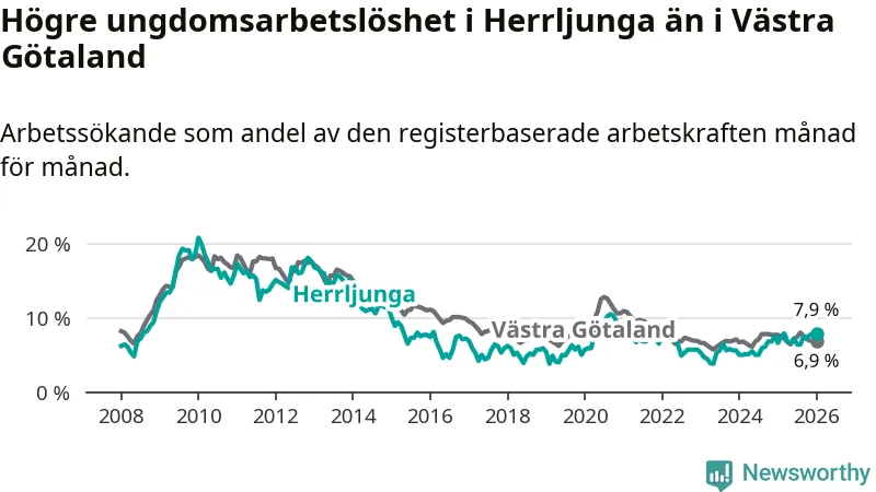 Medan Herrljunga har lägre total arbetslöshet än Västra Götaland, ligger ungdomsarbetslösheten 1,0 procentenheter högre i Herrljunga.