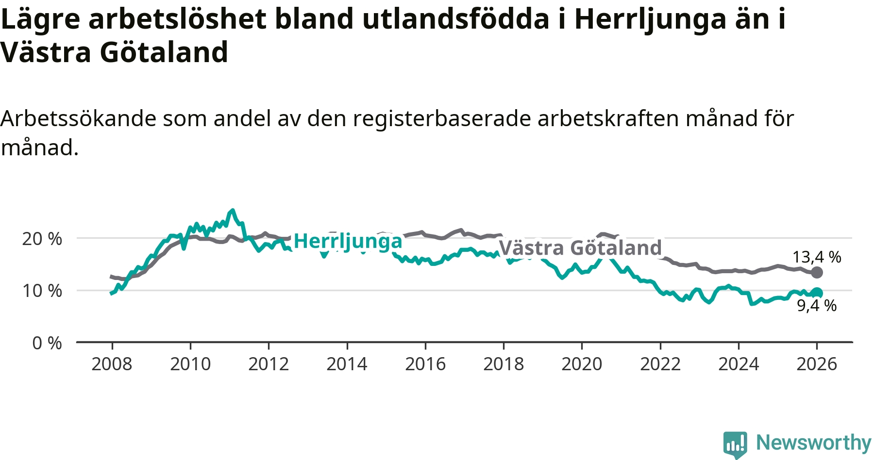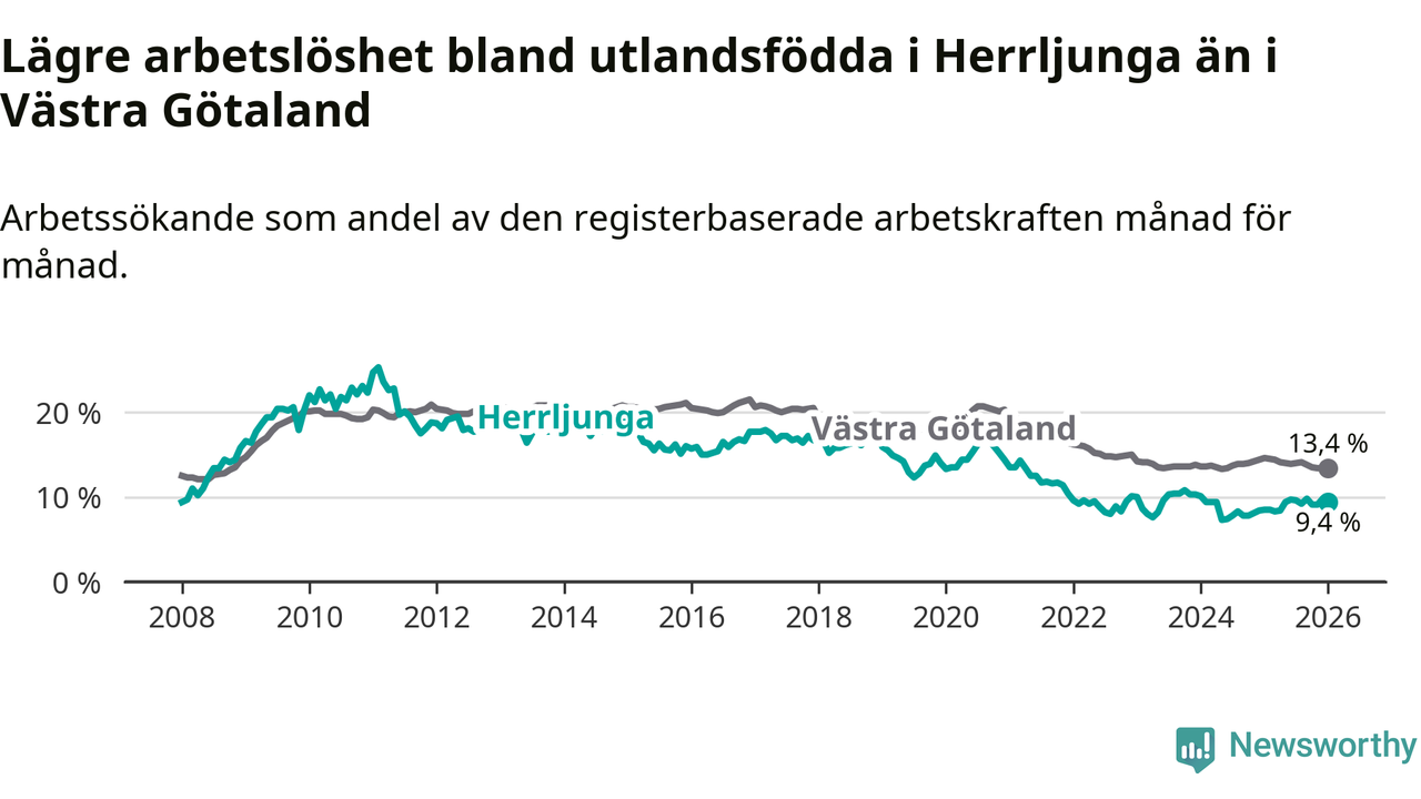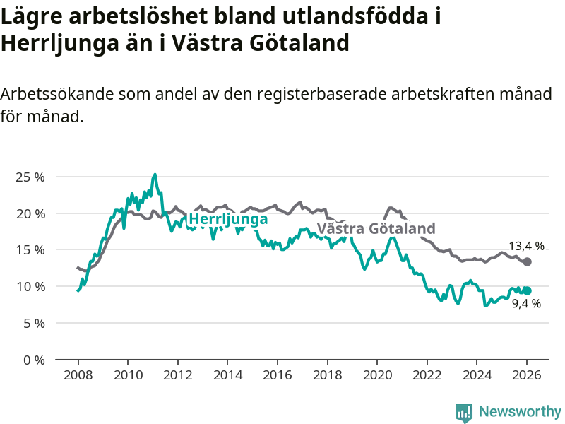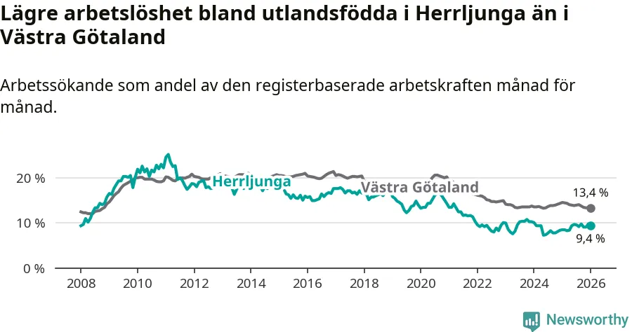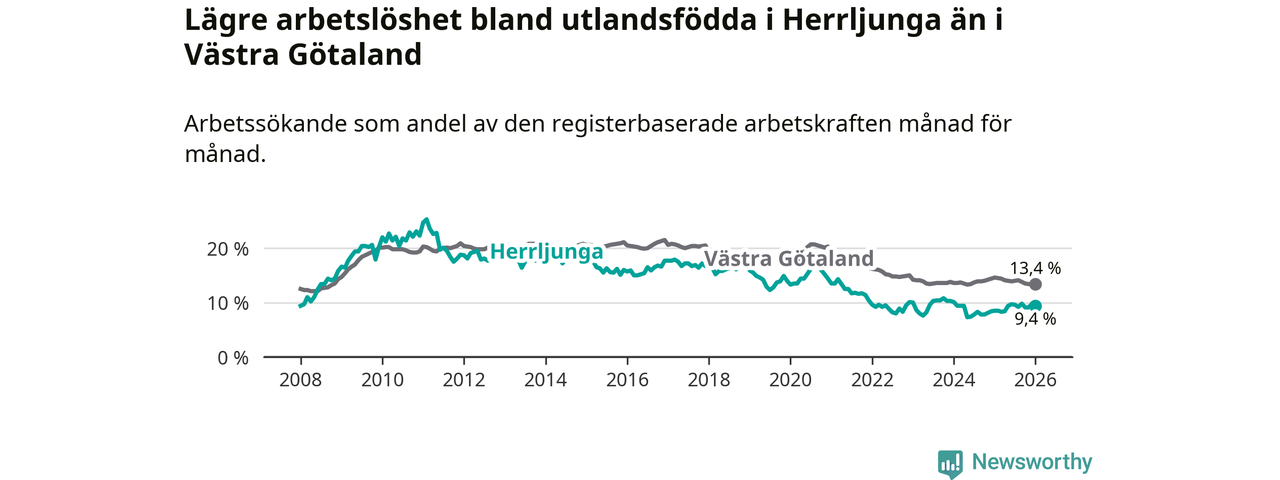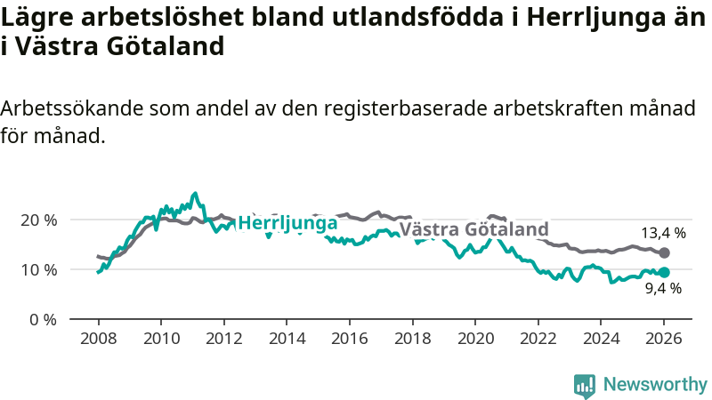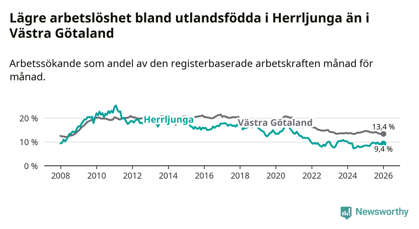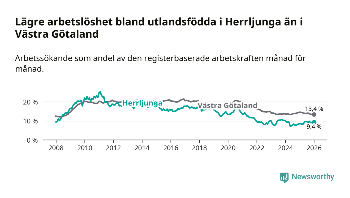 Medan arbetslösheten bland utlandsfödda alltså ökar i Herrljunga så minskar den i Västra Götaland. Jämfört med januari förra året har andelen arbetslösa utlandsfödda i länet minskat med 1,2 procentenheter (till 13,4 procent). Trots den senaste uppgången har Herrljunga med andra ord fortfarande lägre arbetslöshet bland utlandsfödda än Västra Götaland.