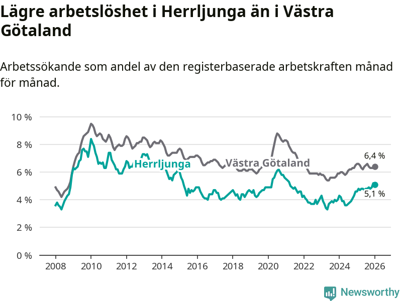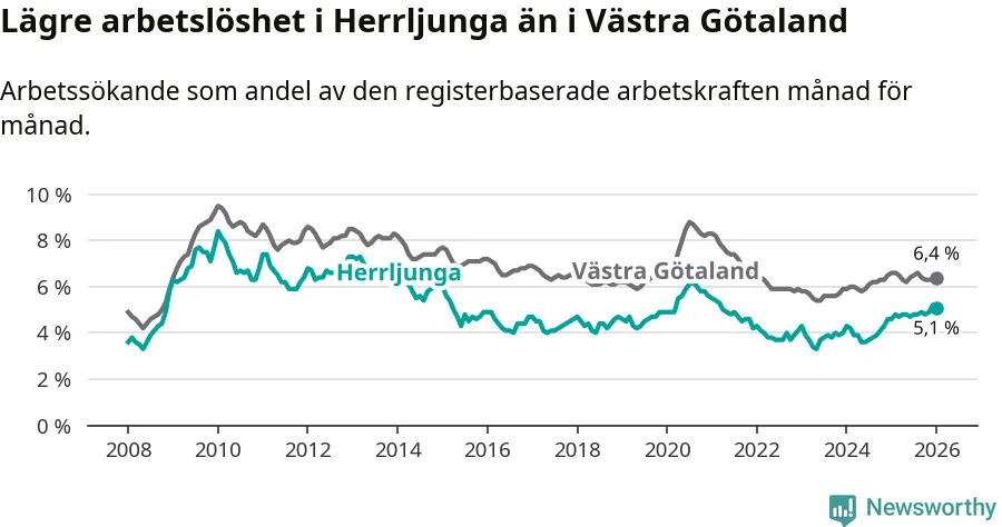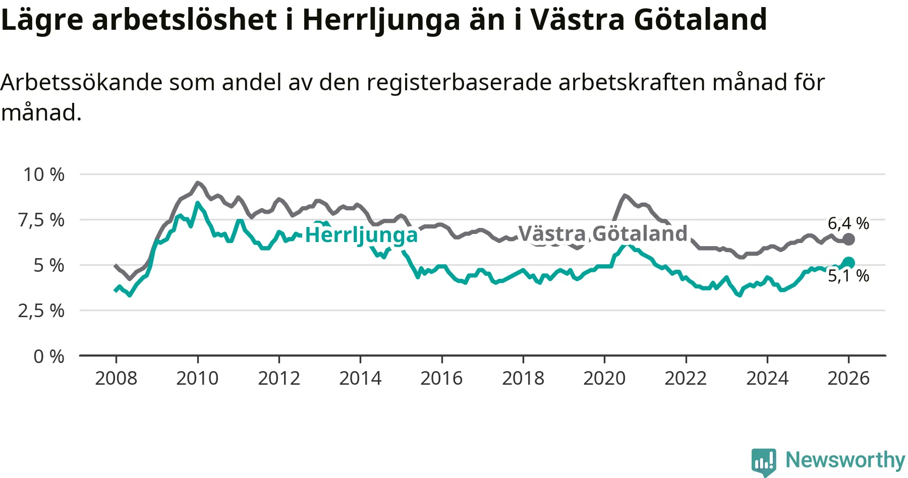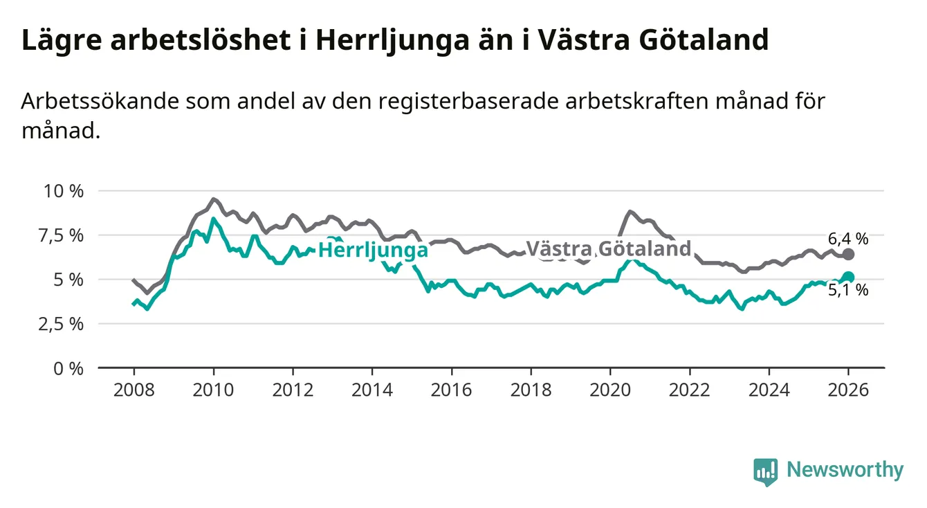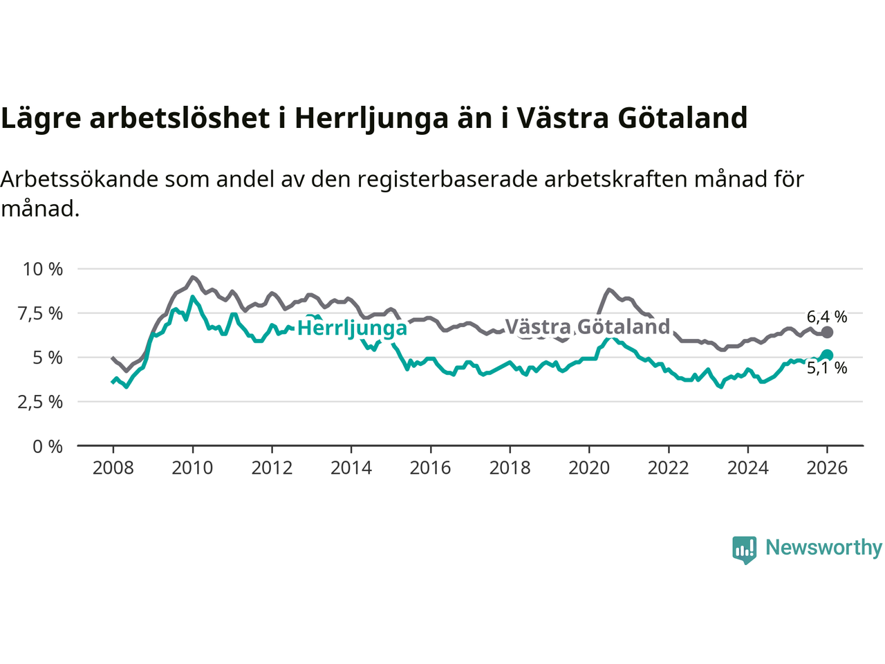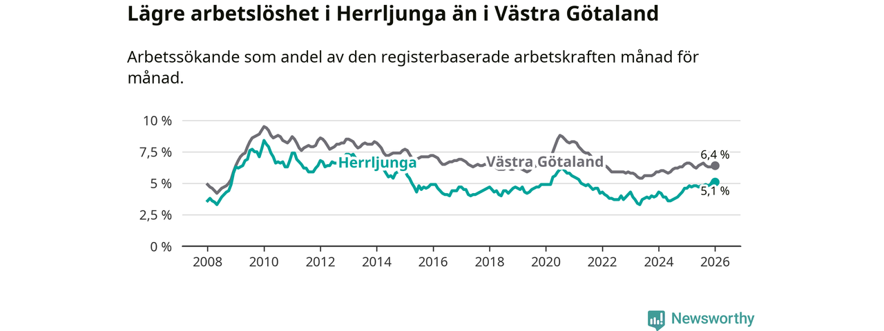 Under januari månad rapporterade Herrljunga kommun en total arbetslöshet på 5,1 procent. Det är en ökning jämfört med samma tidpunkt i fjol (+0,5 procentenheter). I Västra Götalands län däremot sjunker arbetslösheten .