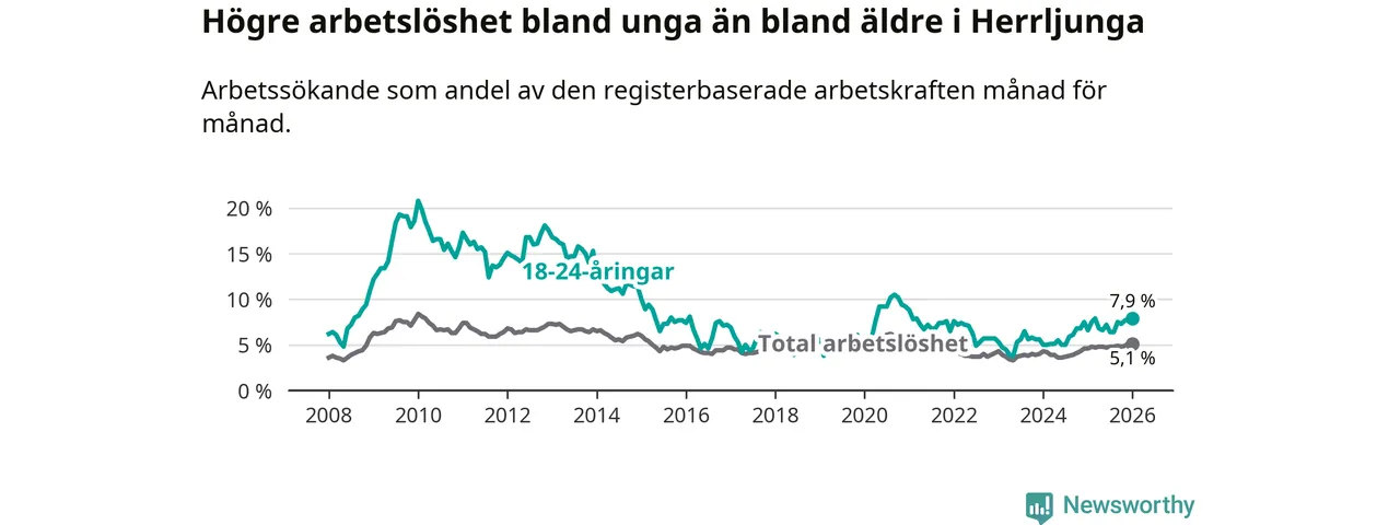 Det är 17:e månaden i följd som arbetslösheten i Herrljunga är högre än den var under samma tidpunkt året innan. Sedan augusti 2024 har arbetslösheten gått upp från 3,8 till 5,1 procent.