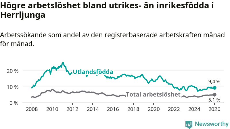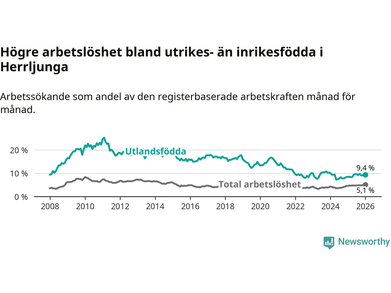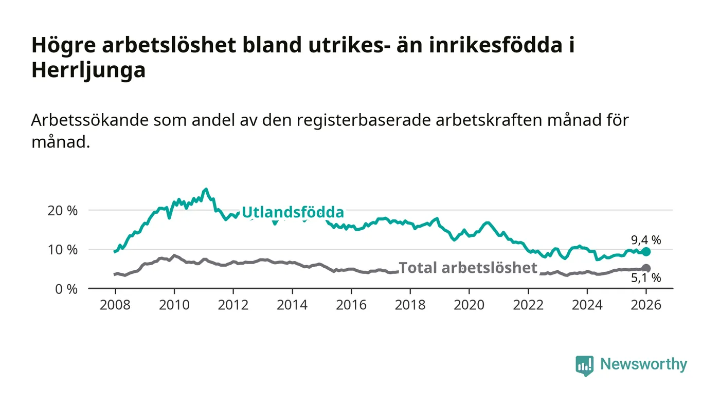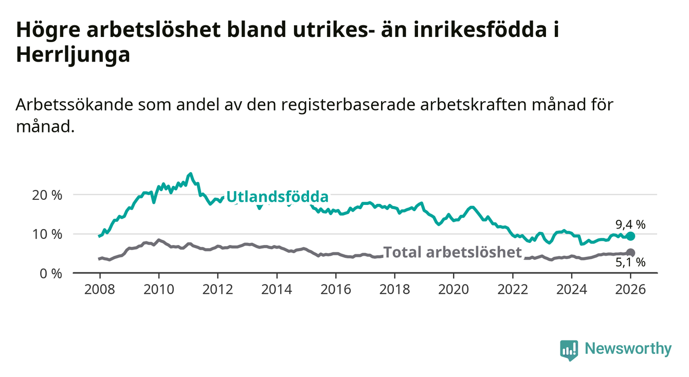 Arbetslösheten bland utlandsfödda var 9,4 procent i Herrljunga under januari månad, motsvarande 66 av 702 personer. Det är 0,9 procentenheter fler än vid samma tidpunkt i fjol (+9 om man räknar personer). Därmed är de utlandsföddas arbetslöshet högre än vid samma tidpunkt i fjol för nionde månaden i följd.
