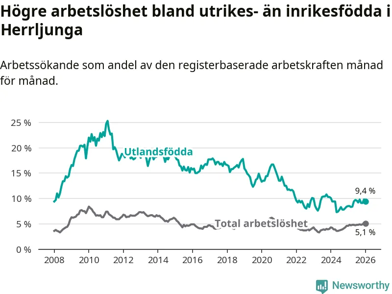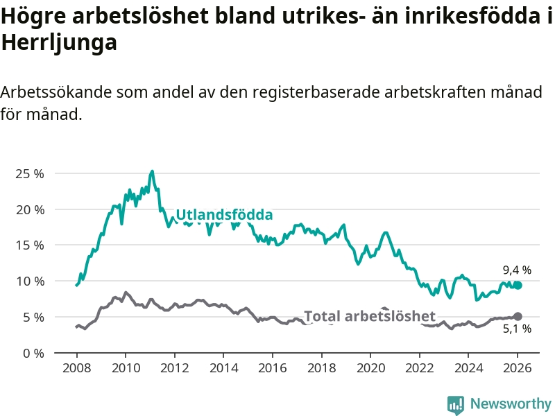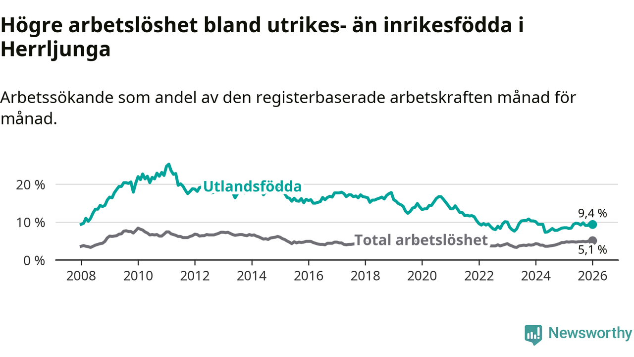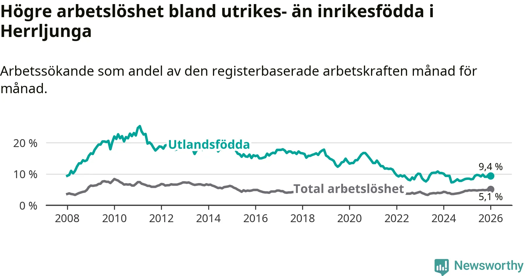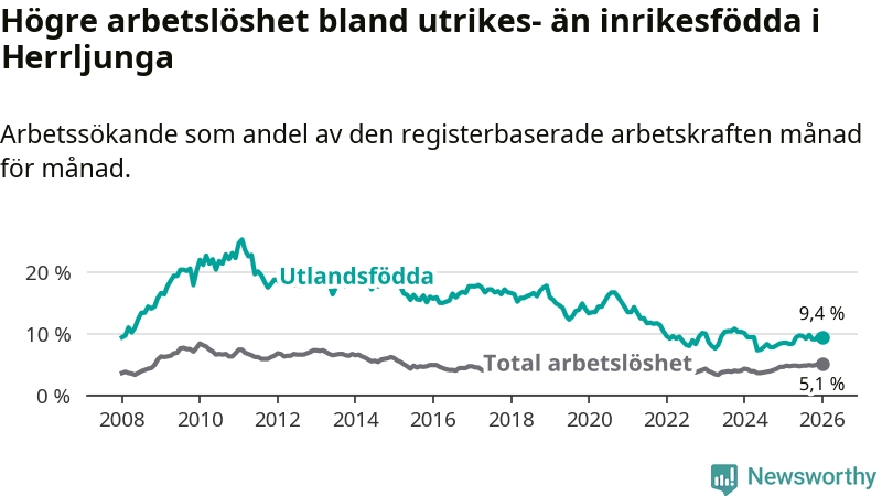 Arbetslösheten bland utlandsfödda var 9,4 procent i Herrljunga under januari månad, motsvarande 66 av 702 personer. Det är 0,9 procentenheter fler än vid samma tidpunkt i fjol (+9 om man räknar personer). Därmed är de utlandsföddas arbetslöshet högre än vid samma tidpunkt i fjol för nionde månaden i följd.