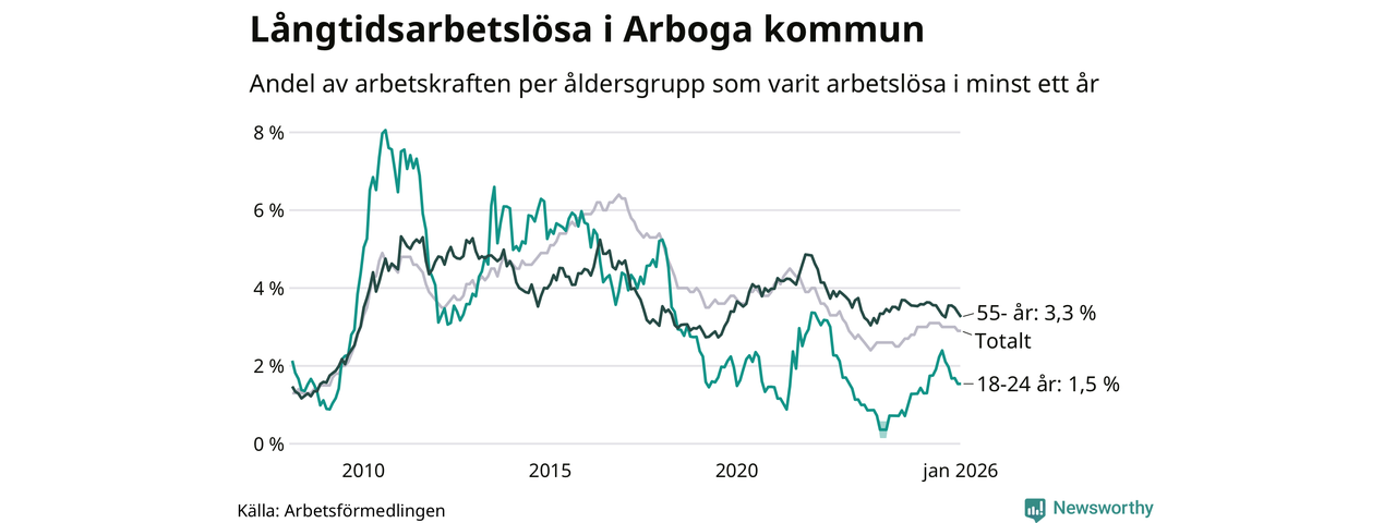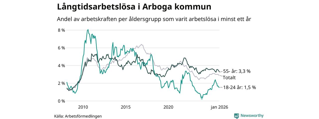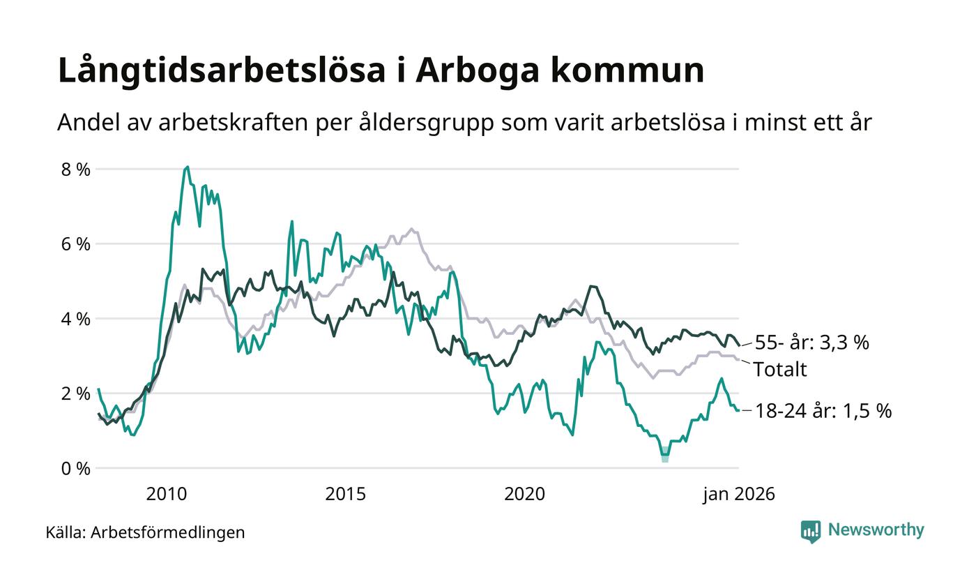 Av de 188 personerna som varit arbetslösa i mer än ett år i Arboga kommun är 54 personer mellan 55 och 661 år och tio är mellan 18 och 24 år. För den äldre gruppen är andelen arbetslösa 3,3 procent medan den i den yngre gruppen är 1,5 procent. Även i riket som helhet är långtidsarbetslösheten högre i gruppen äldre.