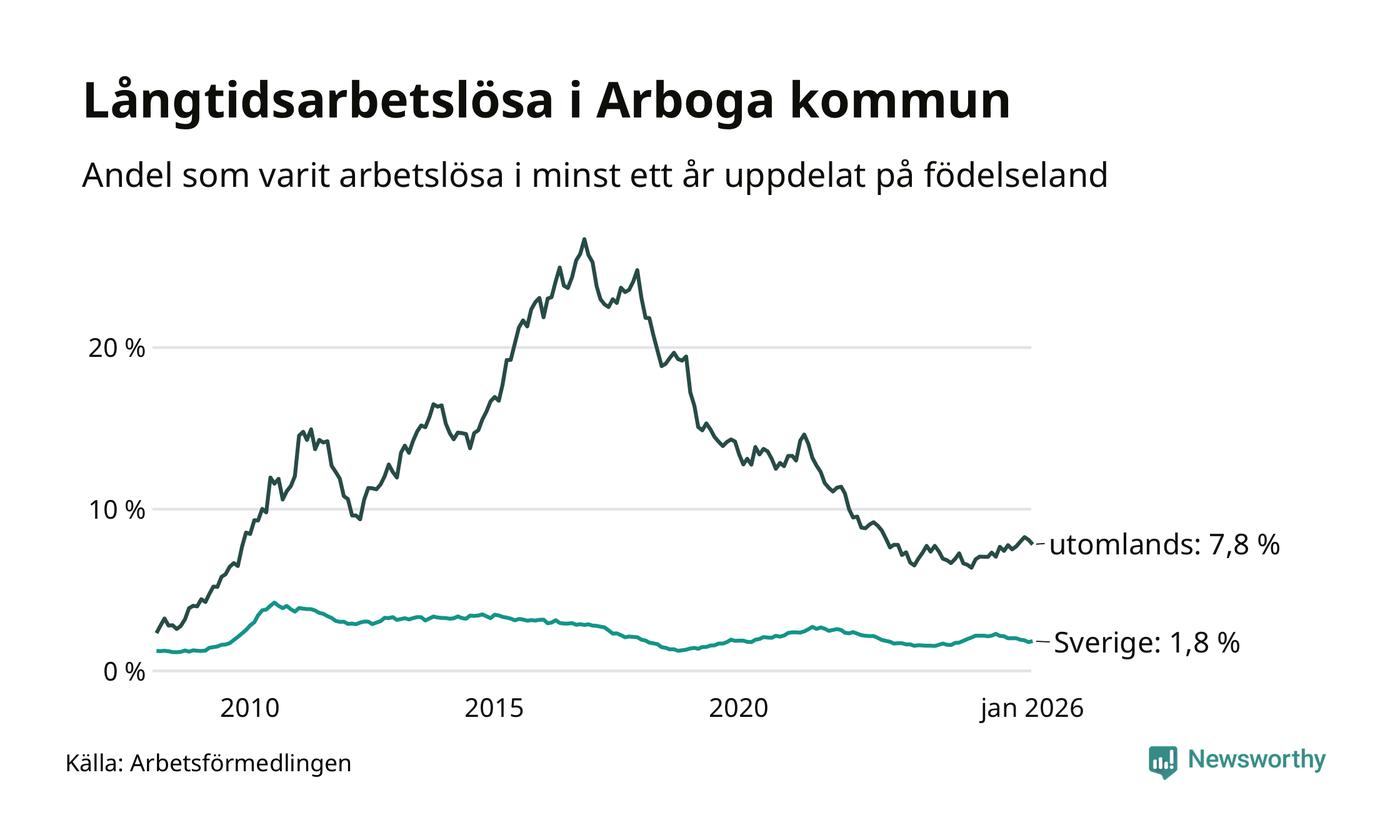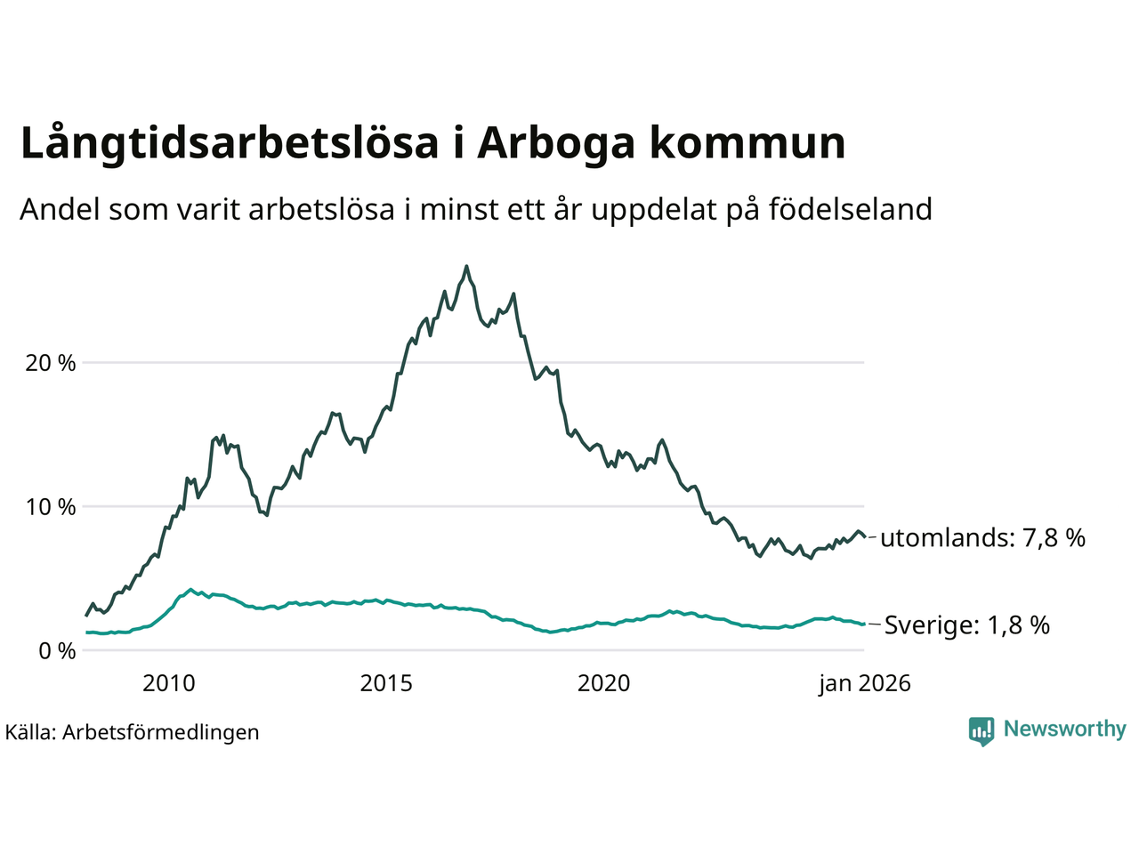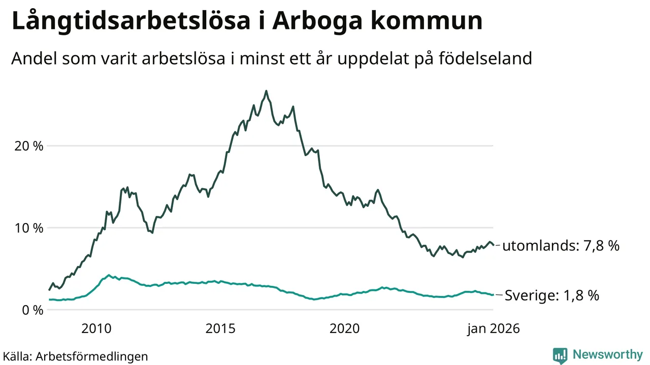 99 av de långtidsarbetslösa i Arboga är födda i Sverige, medan 89 är födda utomlands. Det innebär att långtidsarbetslösheten bland Sverigefödda är 1,8 procent, medan den är fyra gånger så hög – 7,8 procent – bland födda utomlands. Även i riket som helhet är arbetslösheten högre bland utrikesfödda.
