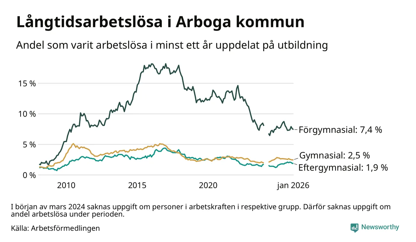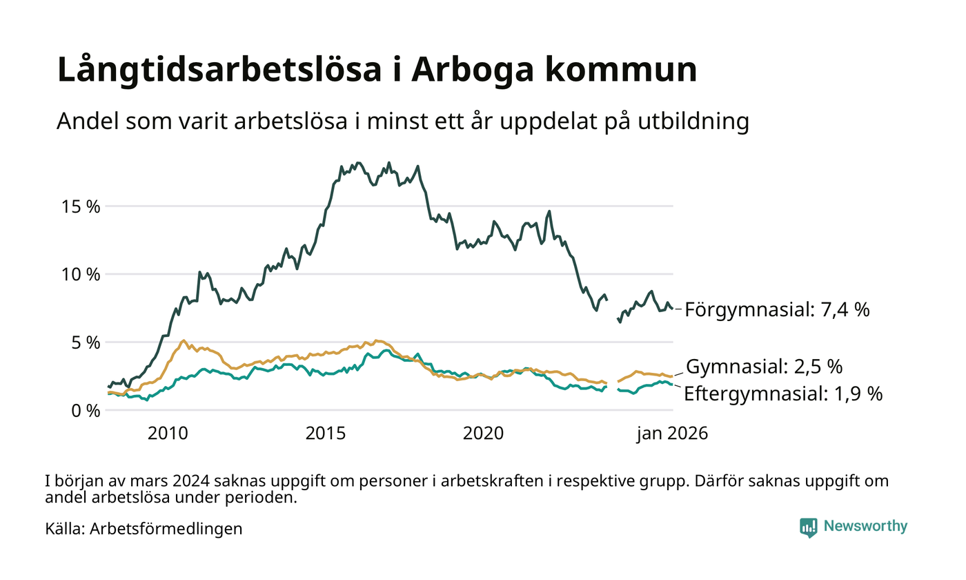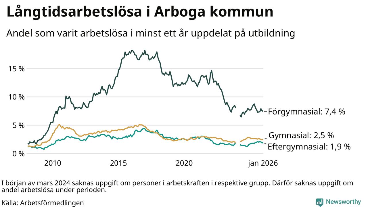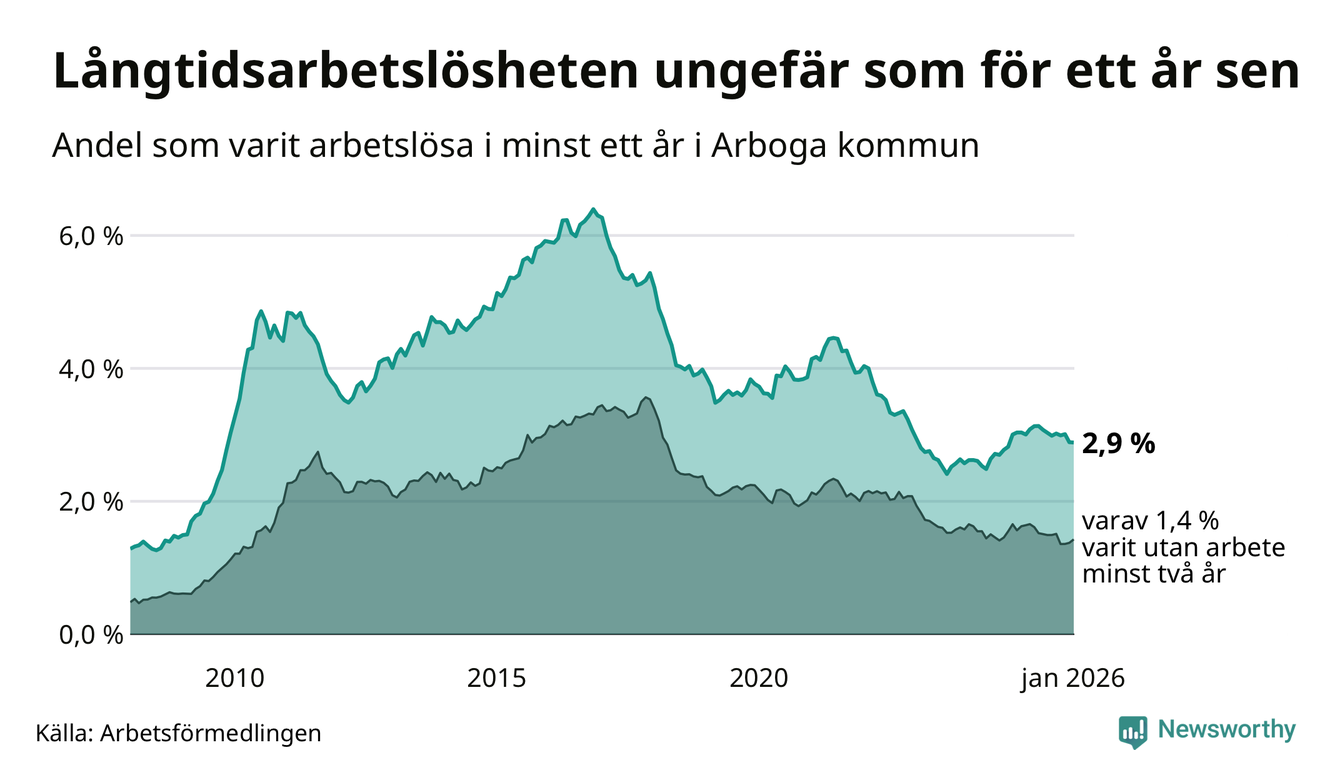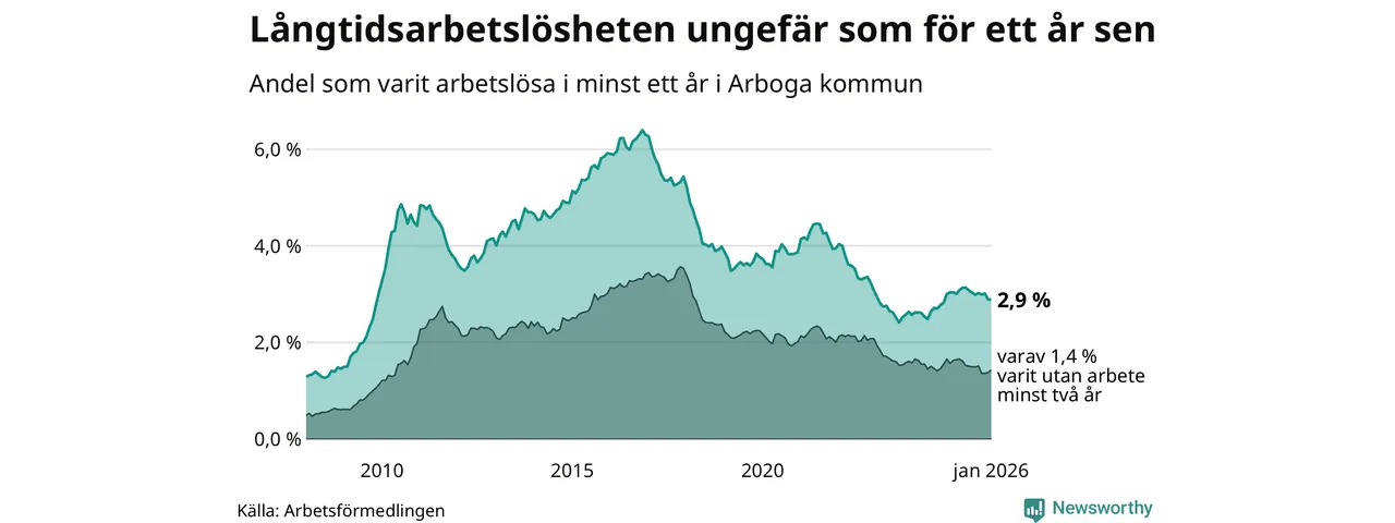 I januari hade 188 Arbogabor varit arbetslösa i minst ett år, vilket är en fler än månaden innan. 188 personer motsvarar 2,9 procent av arbetskraften i kommunen – andelen långtidsarbetslösa är ungefär på samma nivå som för ett år sedan.
