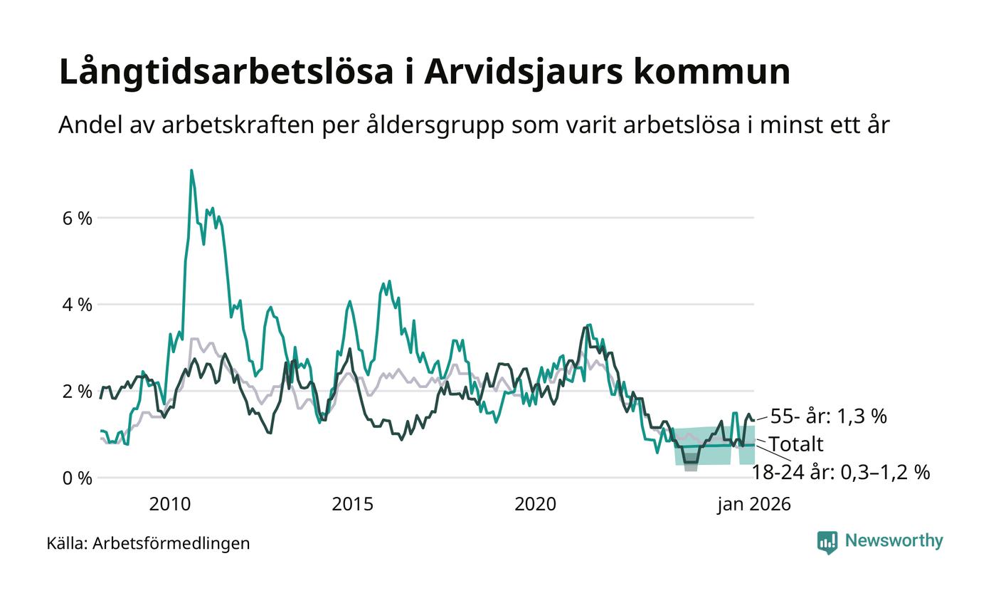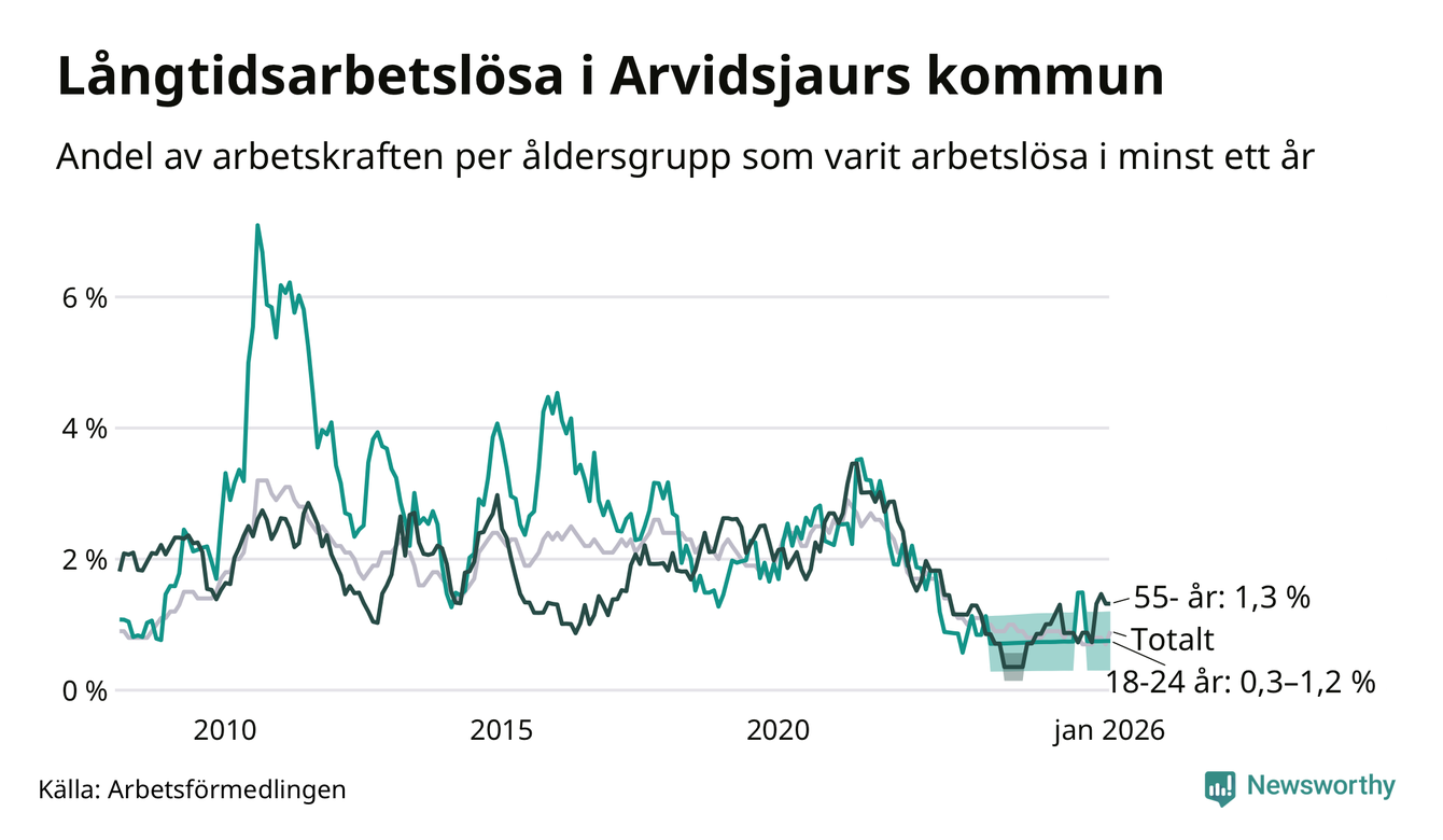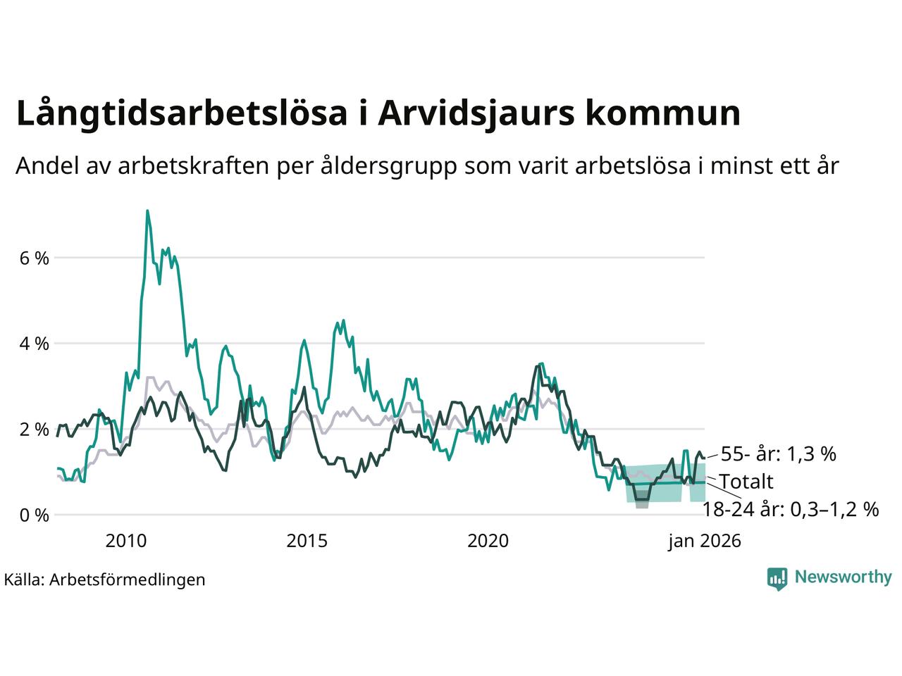 Av de 25 personerna som varit arbetslösa i mer än ett år i Arvidsjaurs kommun är nio personer mellan 55 och 661 år och mellan en och fyra är mellan 18 och 24 år. För den äldre gruppen är andelen arbetslösa 1,3 procent medan den i den yngre gruppen är mellan 0,3 och 1,2 procent. Även i riket som helhet är långtidsarbetslösheten högre i gruppen äldre.