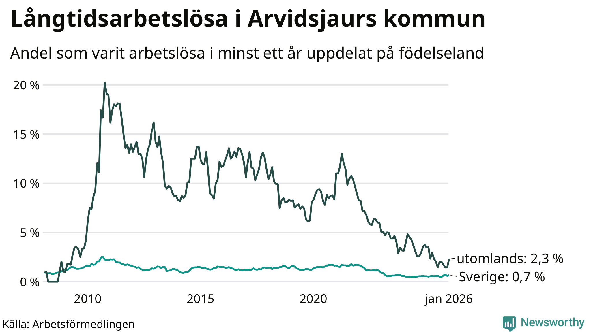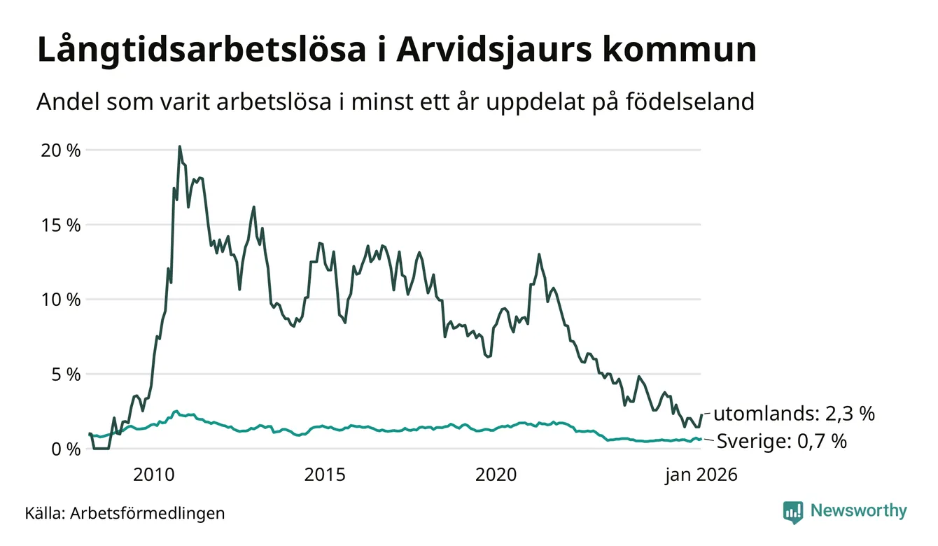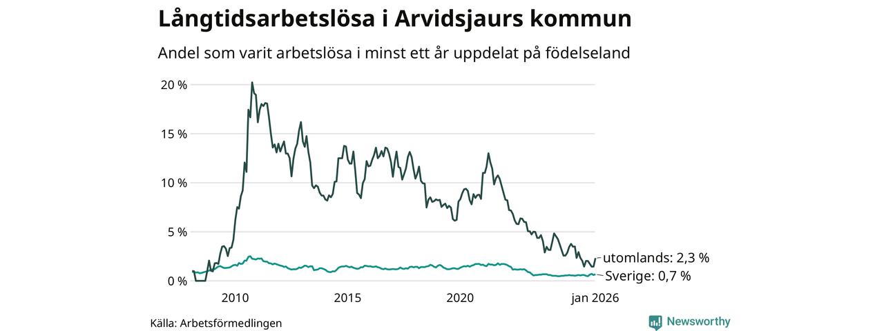 17 av de långtidsarbetslösa i Arvidsjaur är födda i Sverige, medan åtta är födda utomlands. Det innebär att långtidsarbetslösheten bland Sverigefödda är 0,7 procent, medan den är tre gånger så hög – 2,3 procent – bland födda utomlands. Även i riket som helhet är arbetslösheten högre bland utrikesfödda.