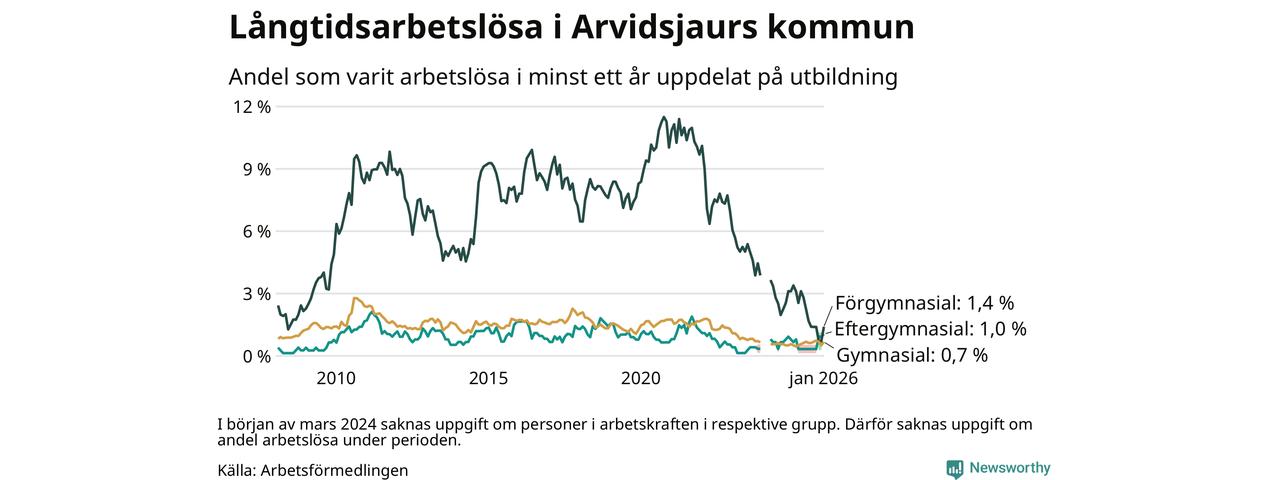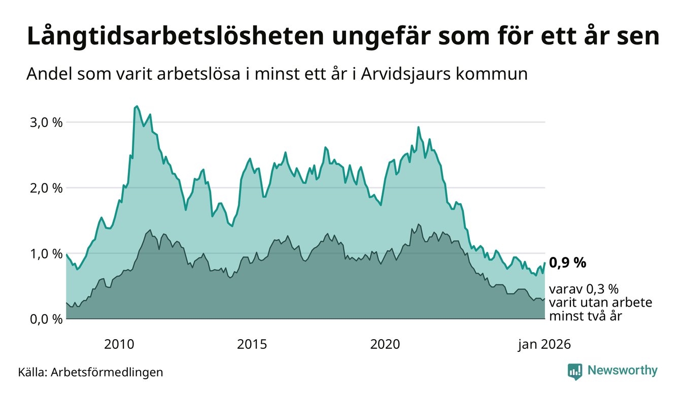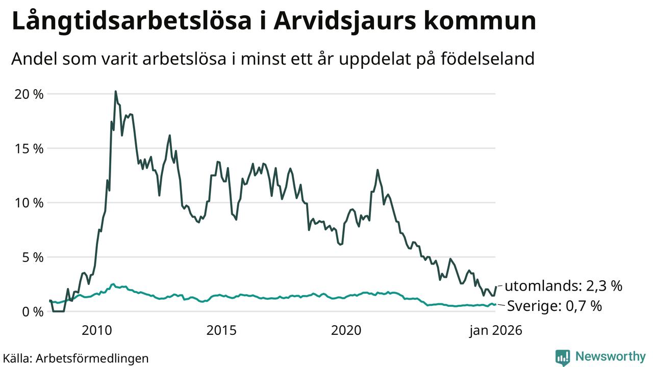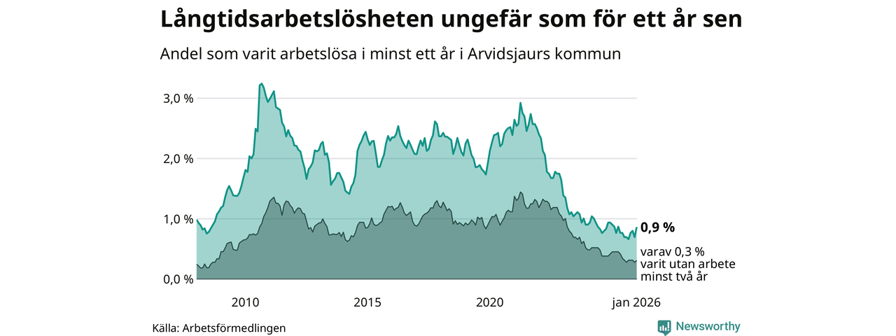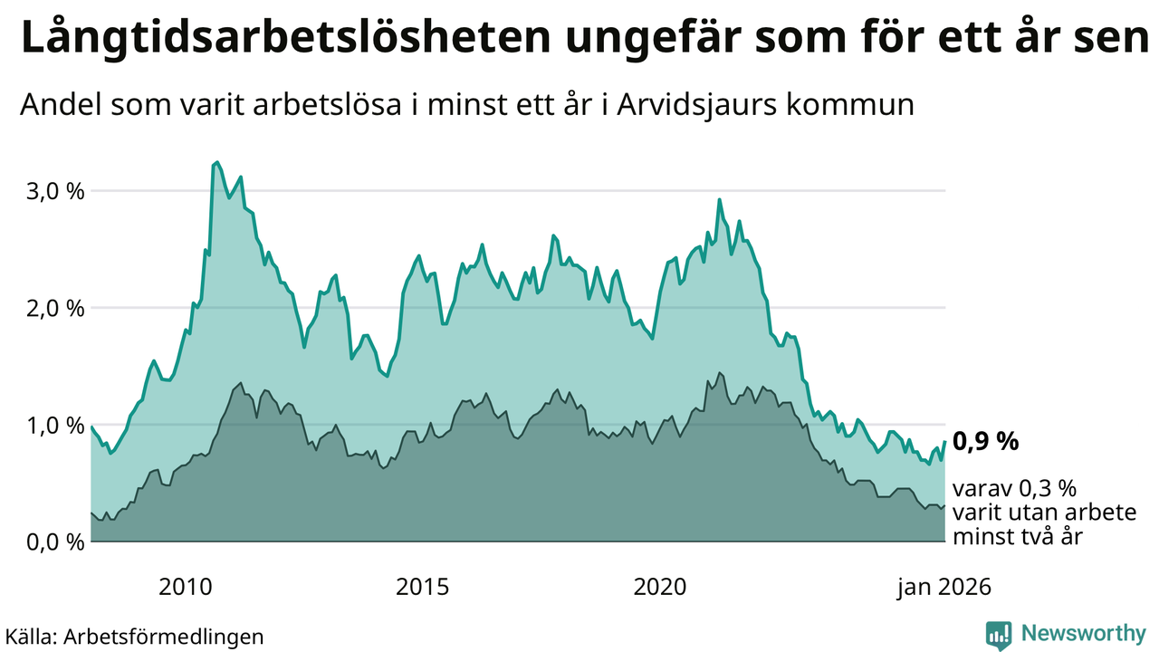 I januari hade 25 Arvidsjaursbor varit arbetslösa i minst ett år, vilket är fem fler än månaden innan. 25 personer motsvarar 0,9 procent av arbetskraften i kommunen – andelen långtidsarbetslösa är ungefär på samma nivå som för ett år sedan. Arvidsjaur tillhör de kommuner som har lägst andel långtidsarbetslösa i hela landet just nu.