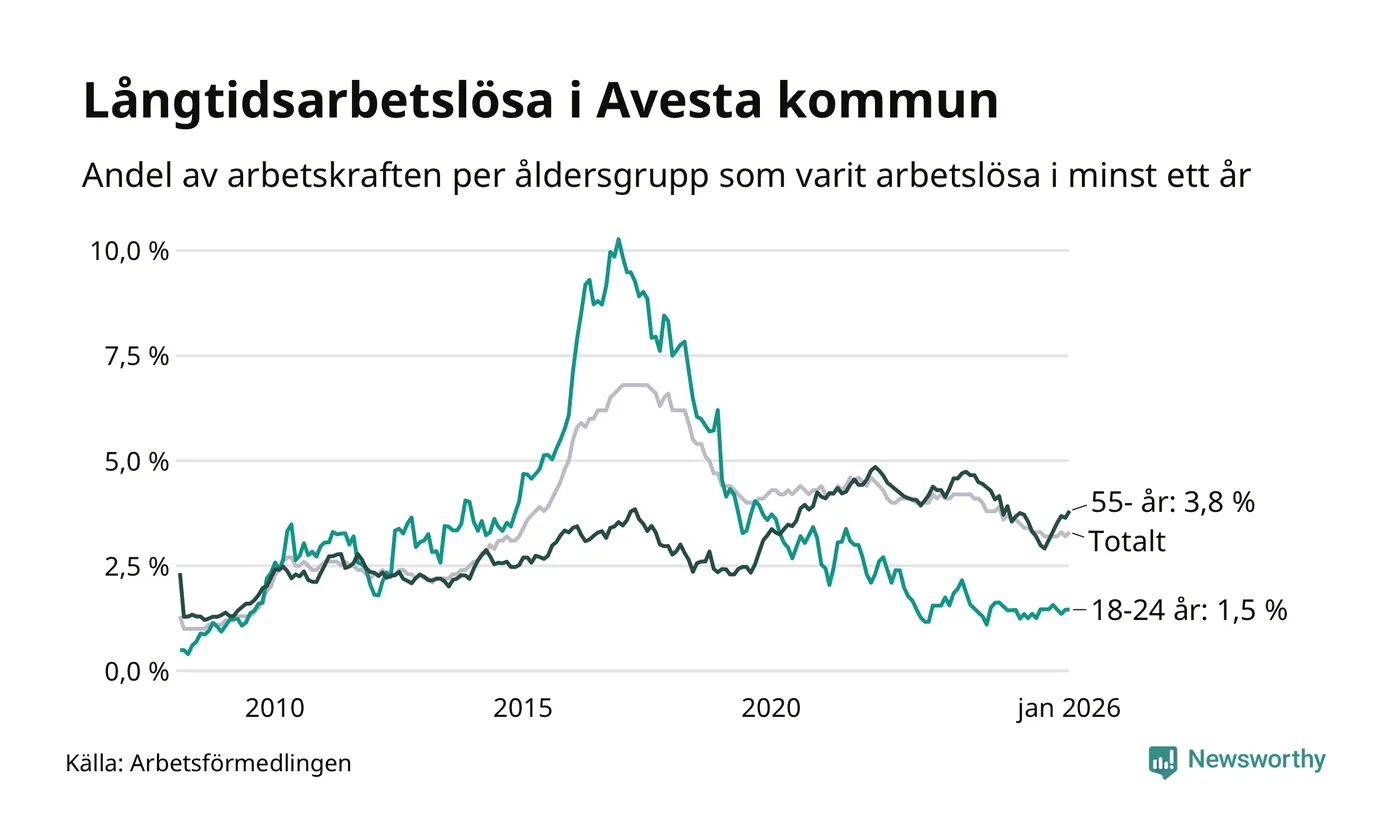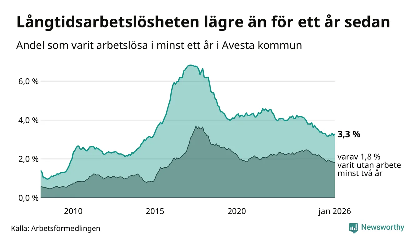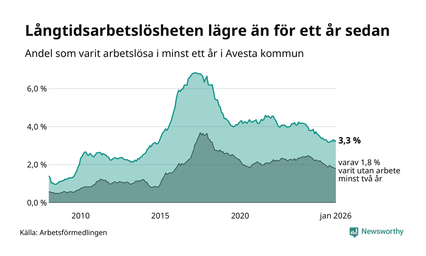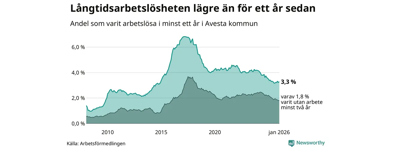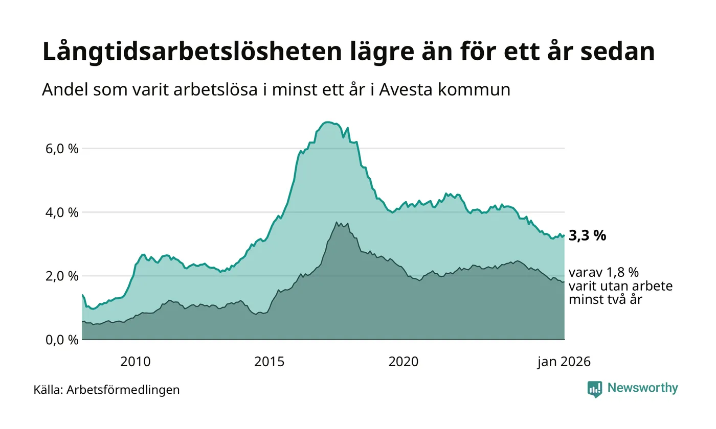 I januari hade 337 Avestabor varit arbetslösa i minst ett år, vilket är nio fler än månaden innan. 337 personer motsvarar 3,3 procent av arbetskraften i kommunen – andelen långtidsarbetslösa är 0,2 procentenheter lägre än samma månad för ett år sedan.