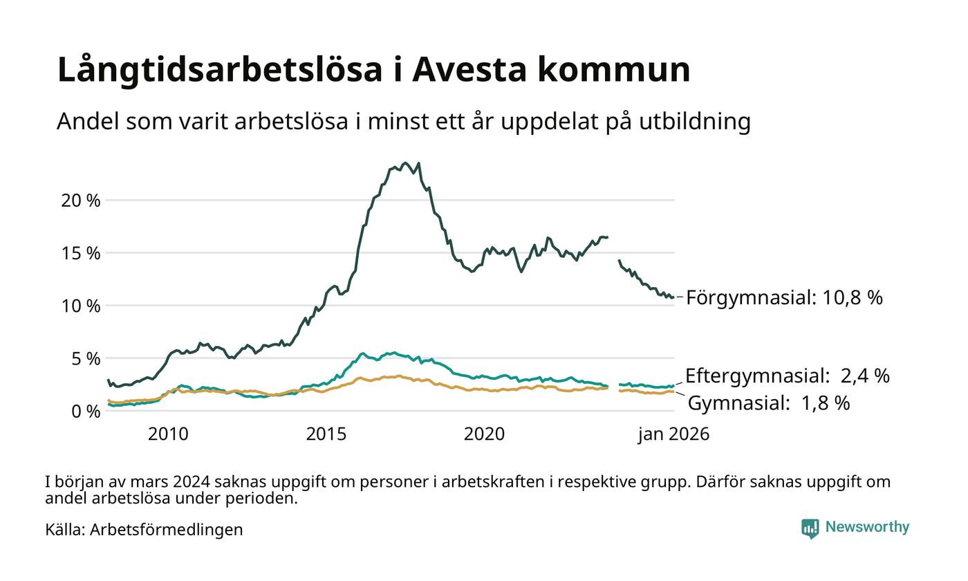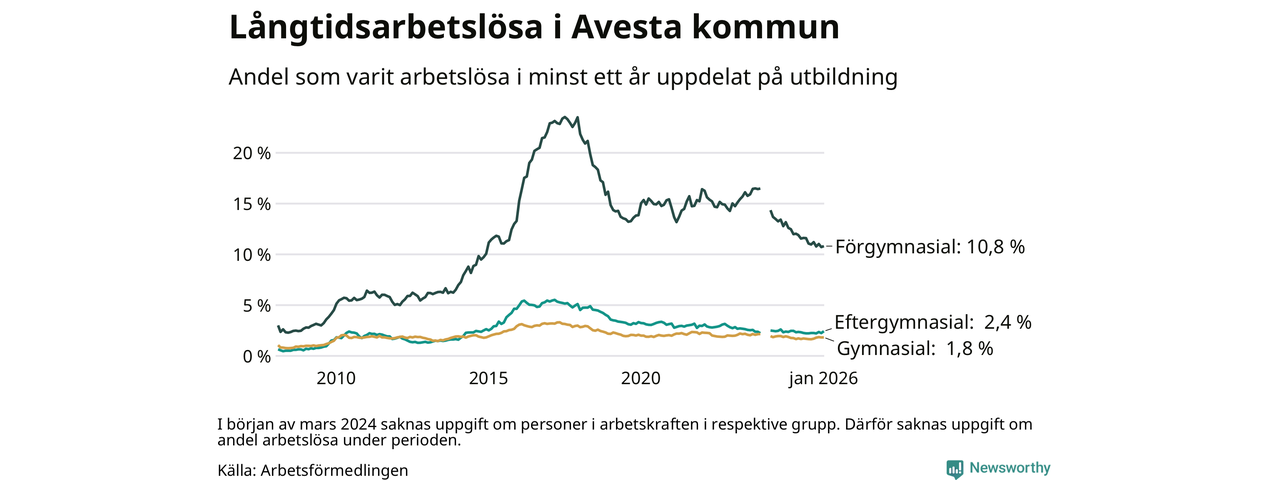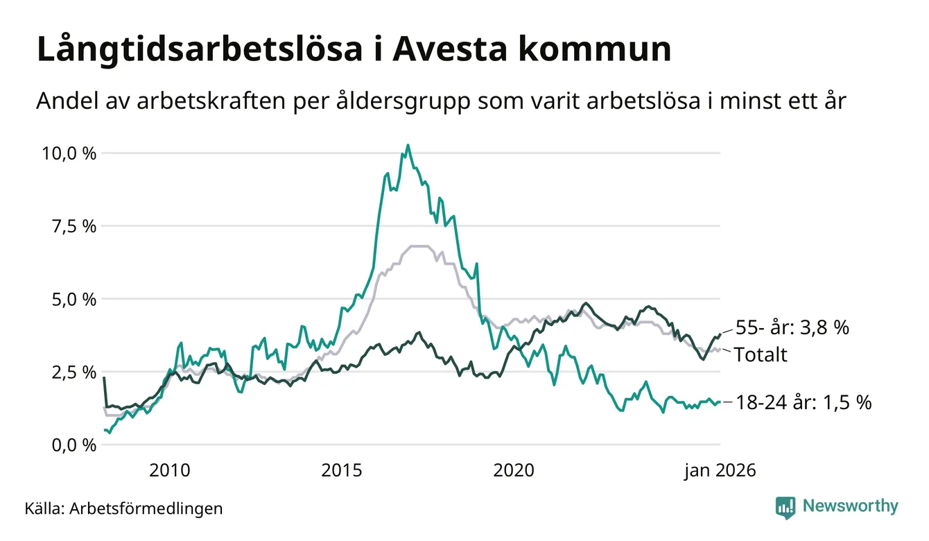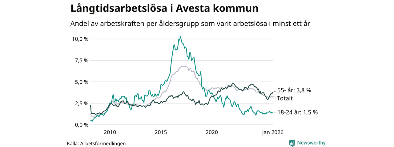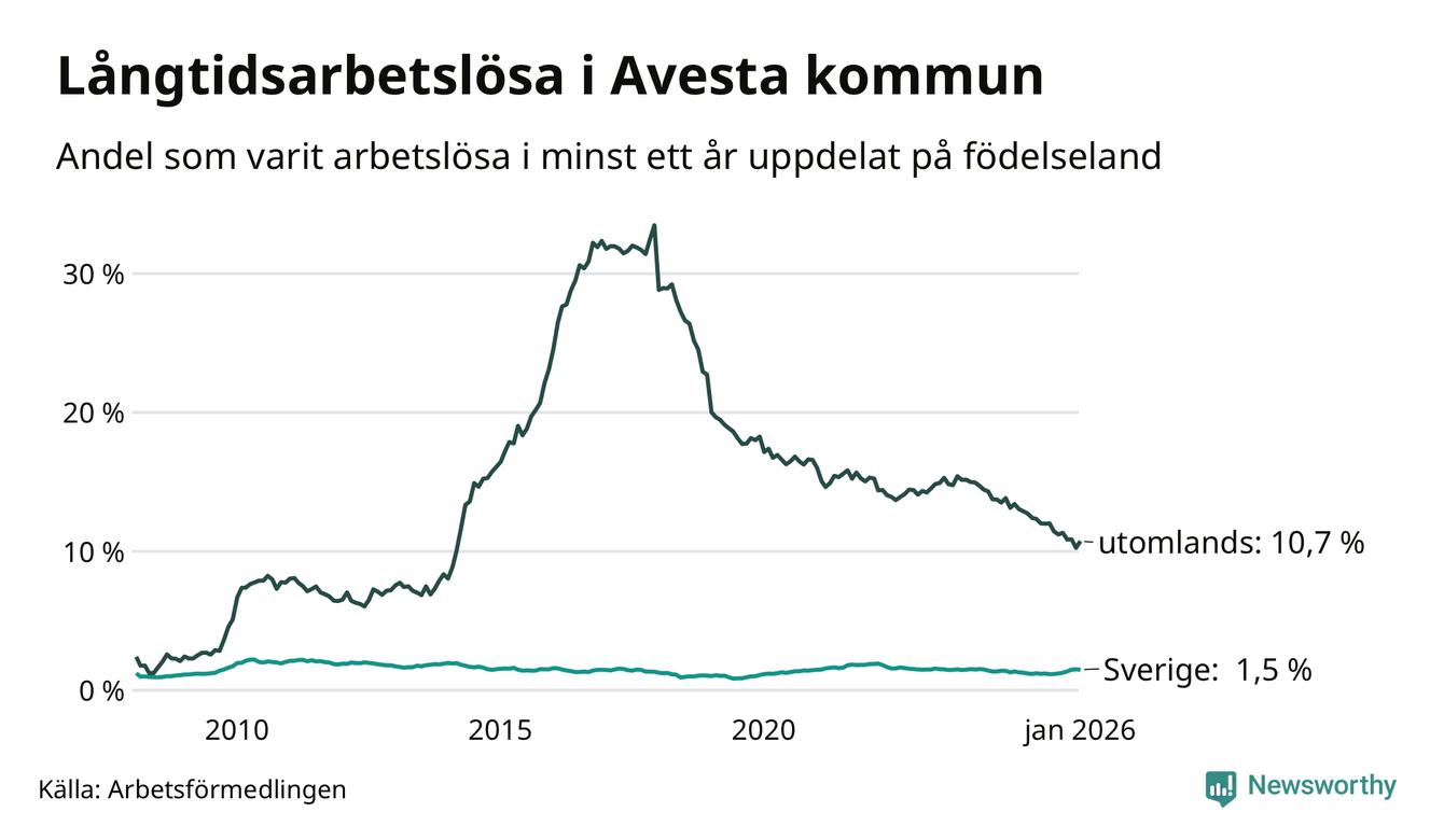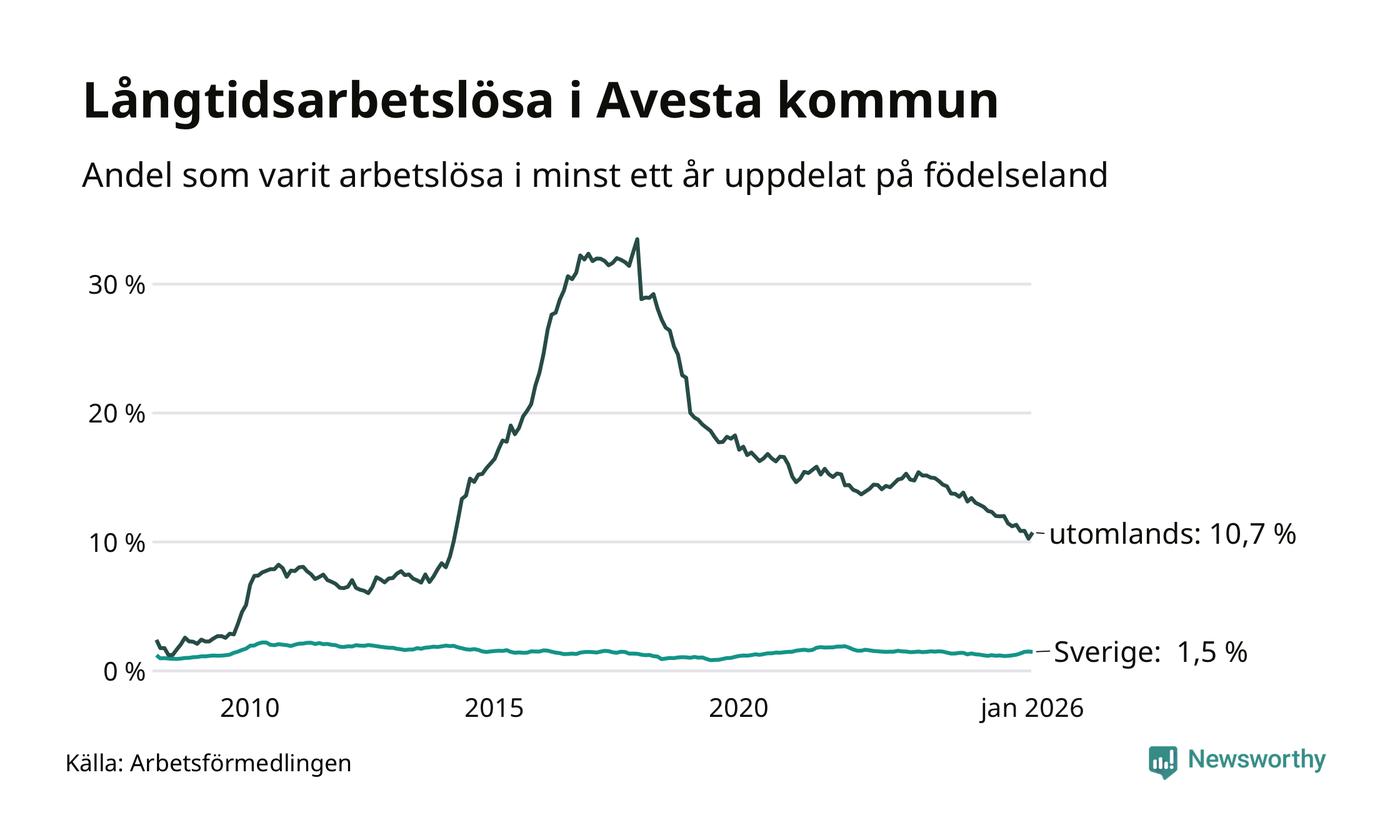 I januari hade 337 Avestabor varit arbetslösa i minst ett år, vilket är nio fler än månaden innan. 337 personer motsvarar 3,3 procent av arbetskraften i kommunen – andelen långtidsarbetslösa är 0,2 procentenheter lägre än samma månad för ett år sedan.