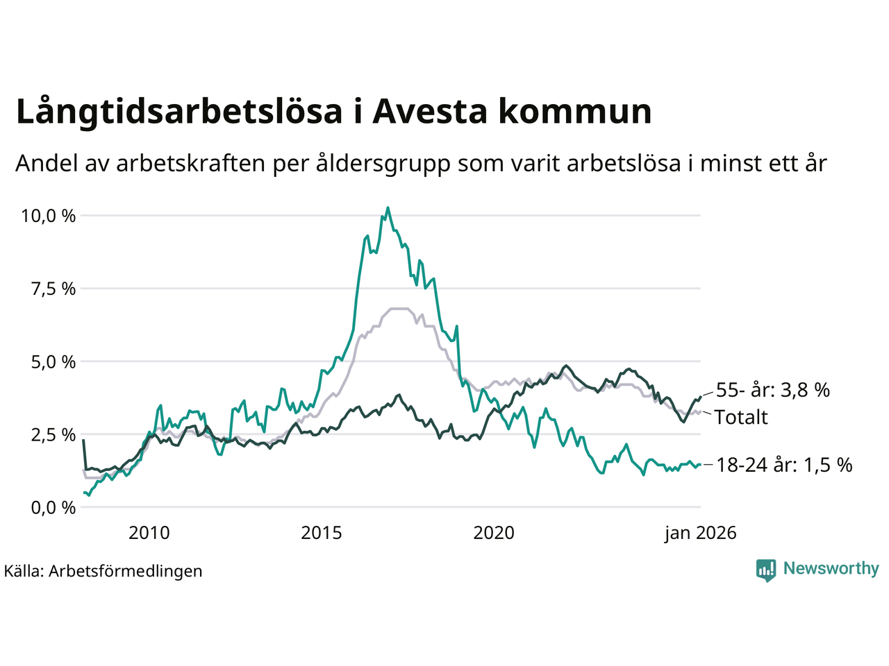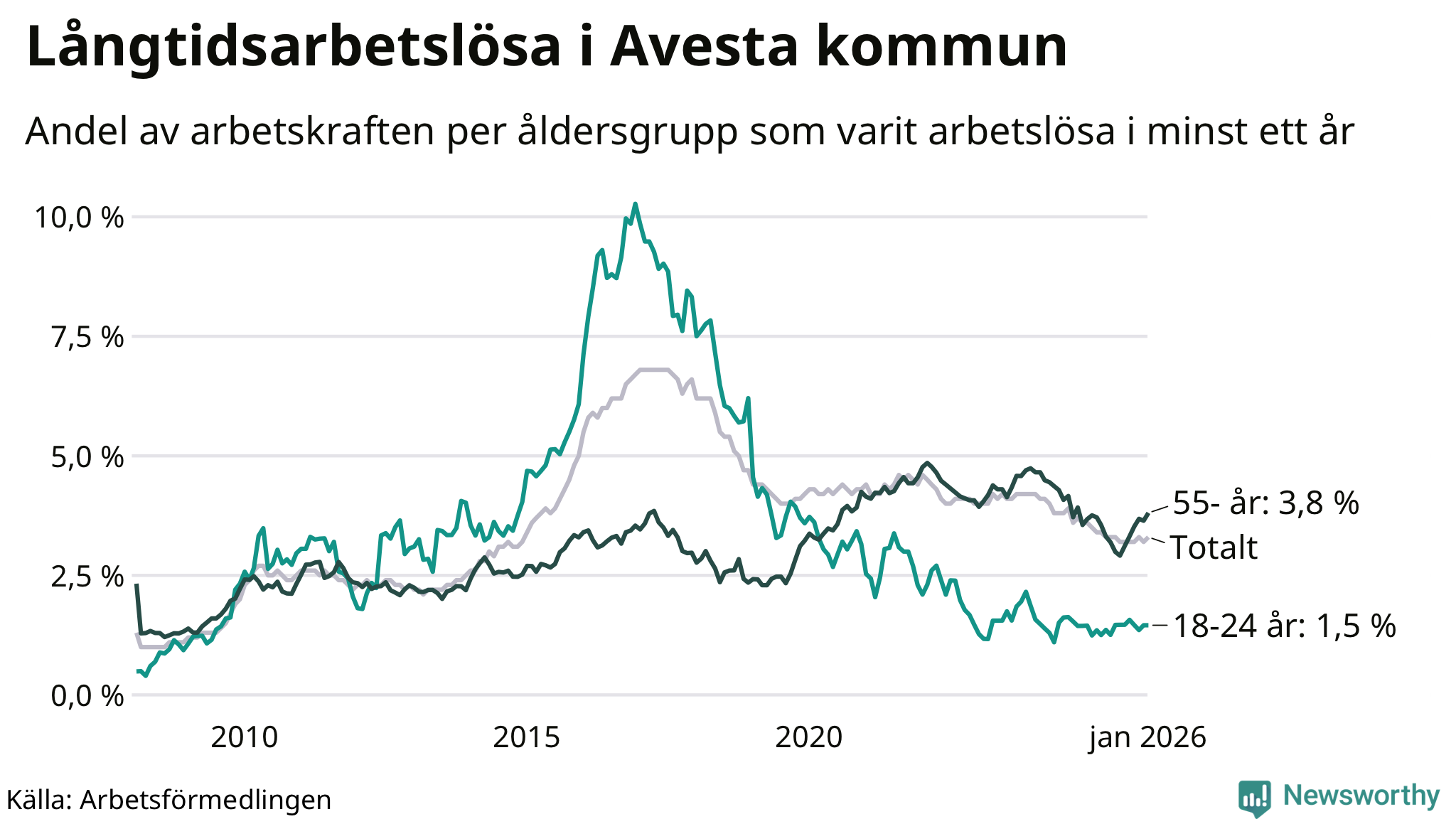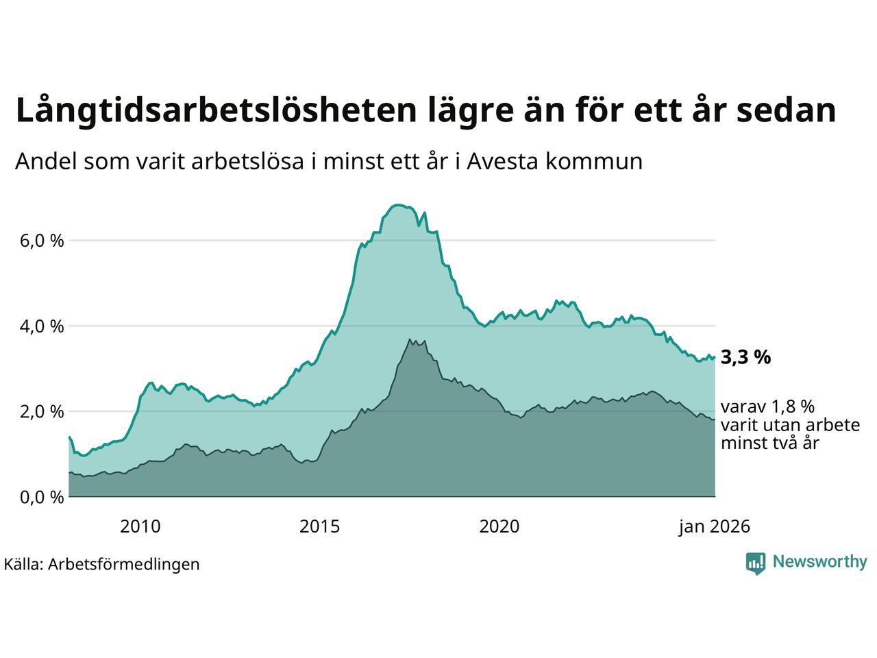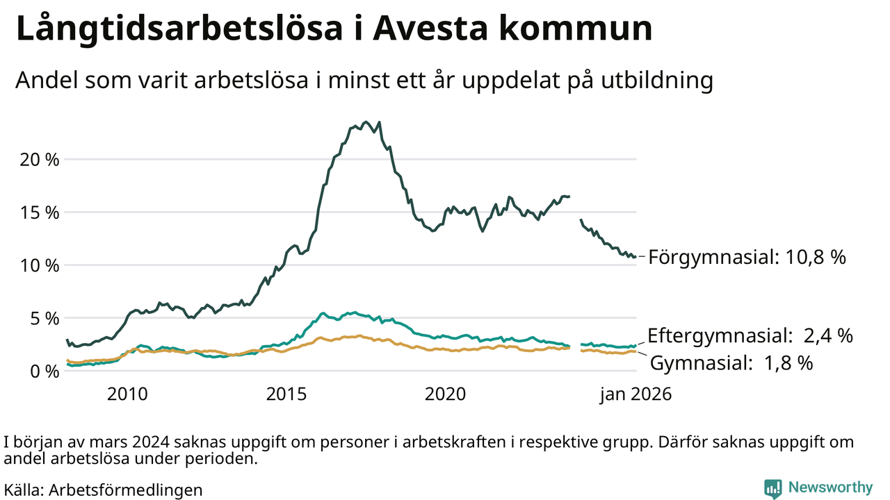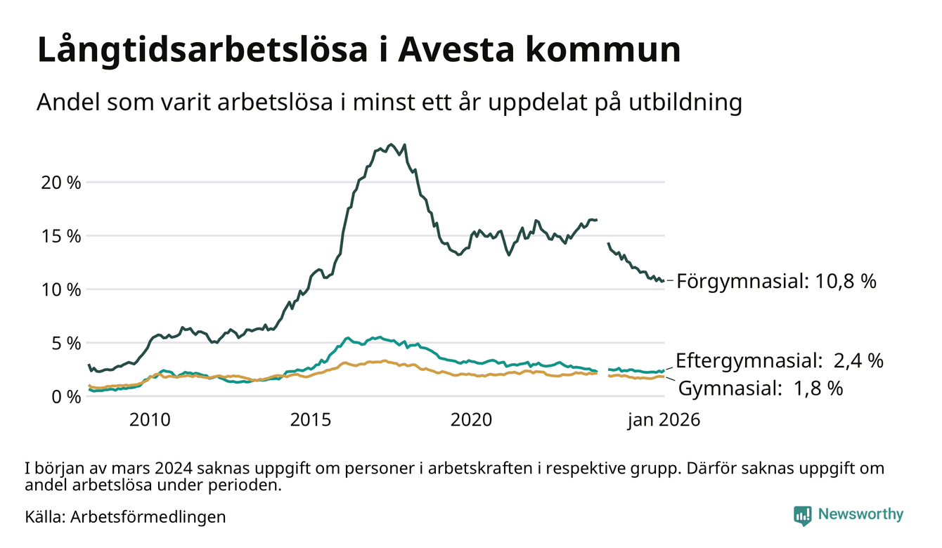 I januari hade 337 Avestabor varit arbetslösa i minst ett år, vilket är nio fler än månaden innan. 337 personer motsvarar 3,3 procent av arbetskraften i kommunen – andelen långtidsarbetslösa är 0,2 procentenheter lägre än samma månad för ett år sedan.