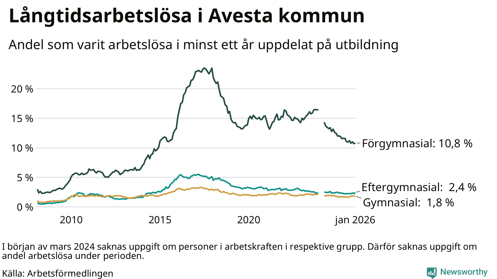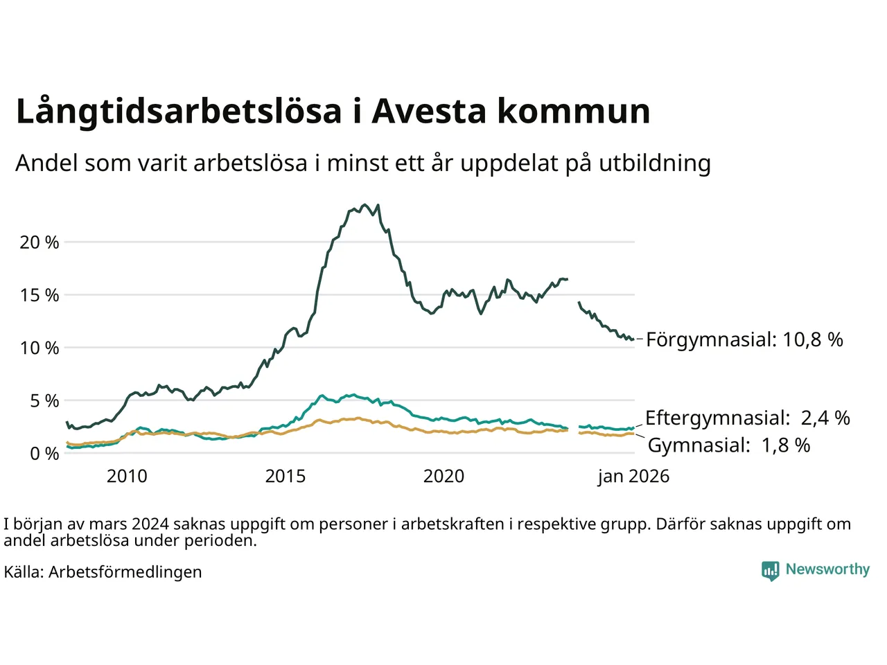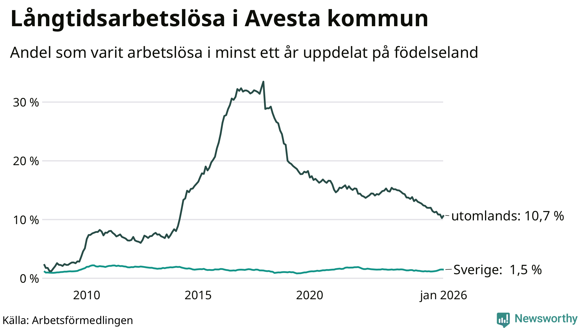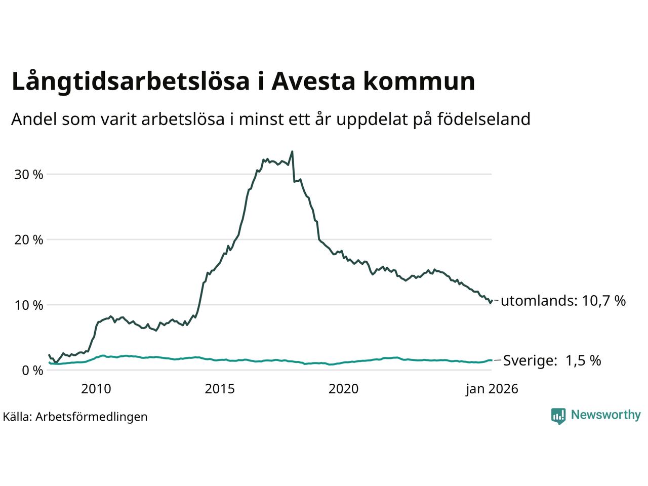 I januari hade 337 Avestabor varit arbetslösa i minst ett år, vilket är nio fler än månaden innan. 337 personer motsvarar 3,3 procent av arbetskraften i kommunen – andelen långtidsarbetslösa är 0,2 procentenheter lägre än samma månad för ett år sedan.