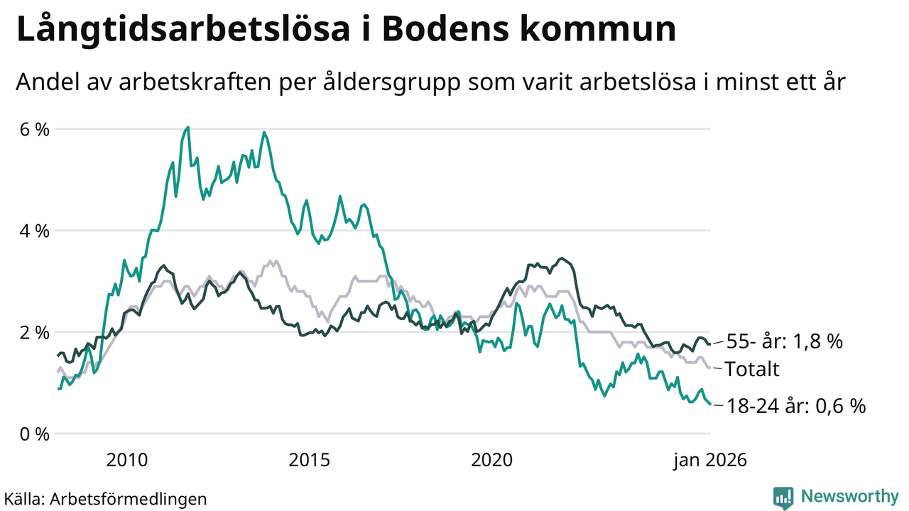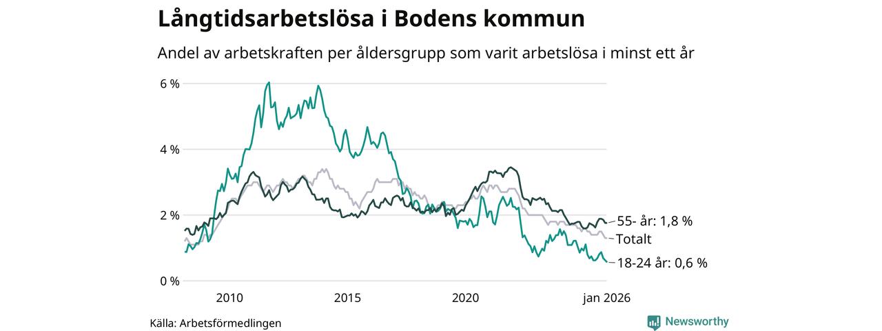 Av de 178 personerna som varit arbetslösa i mer än ett år i Bodens kommun är 54 personer mellan 55 och 661 år och nio är mellan 18 och 24 år. För den äldre gruppen är andelen arbetslösa 1,8 procent medan den i den yngre gruppen är 0,6 procent. Även i riket som helhet är långtidsarbetslösheten högre i gruppen äldre.