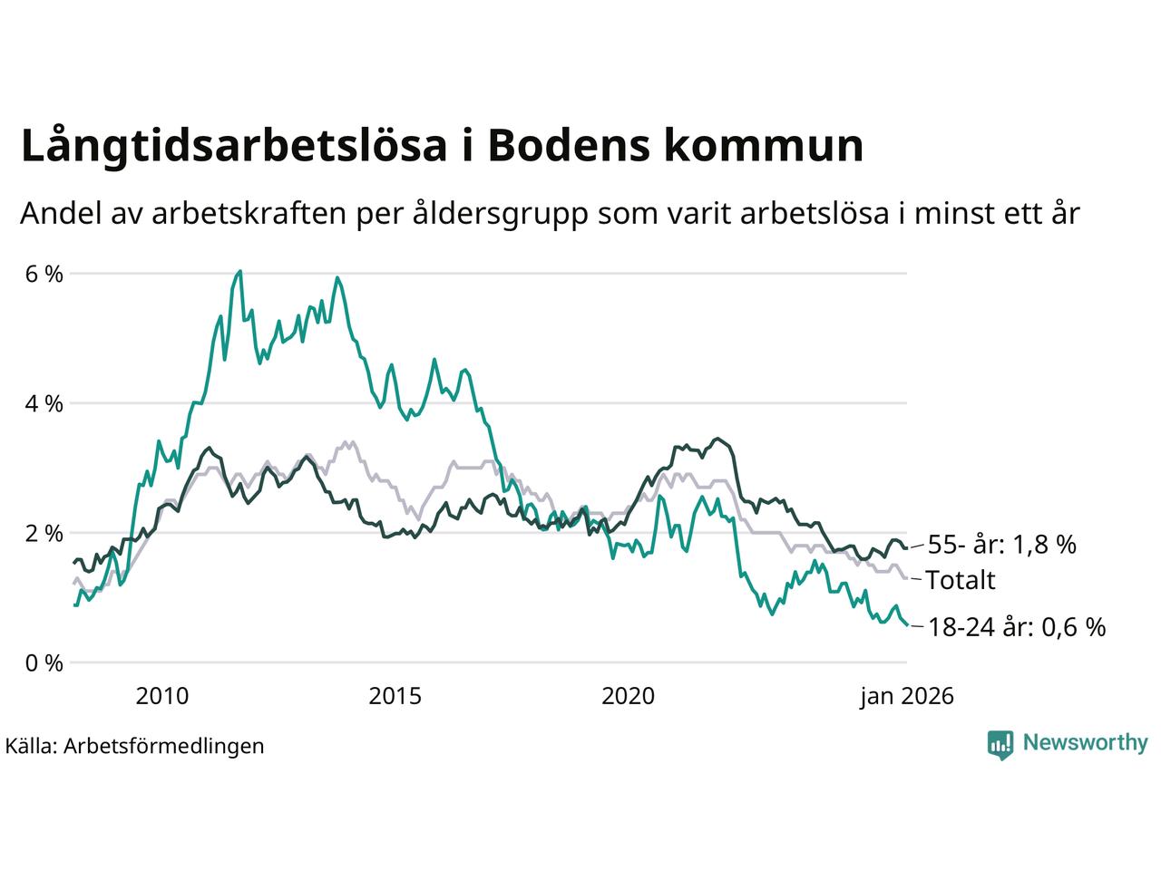 I januari hade 178 Bodenbor varit arbetslösa i minst ett år, vilket är fyra färre än månaden innan. 178 personer motsvarar 1,3 procent av arbetskraften i kommunen – andelen långtidsarbetslösa är 0,3 procentenheter lägre än samma månad för ett år sedan.
